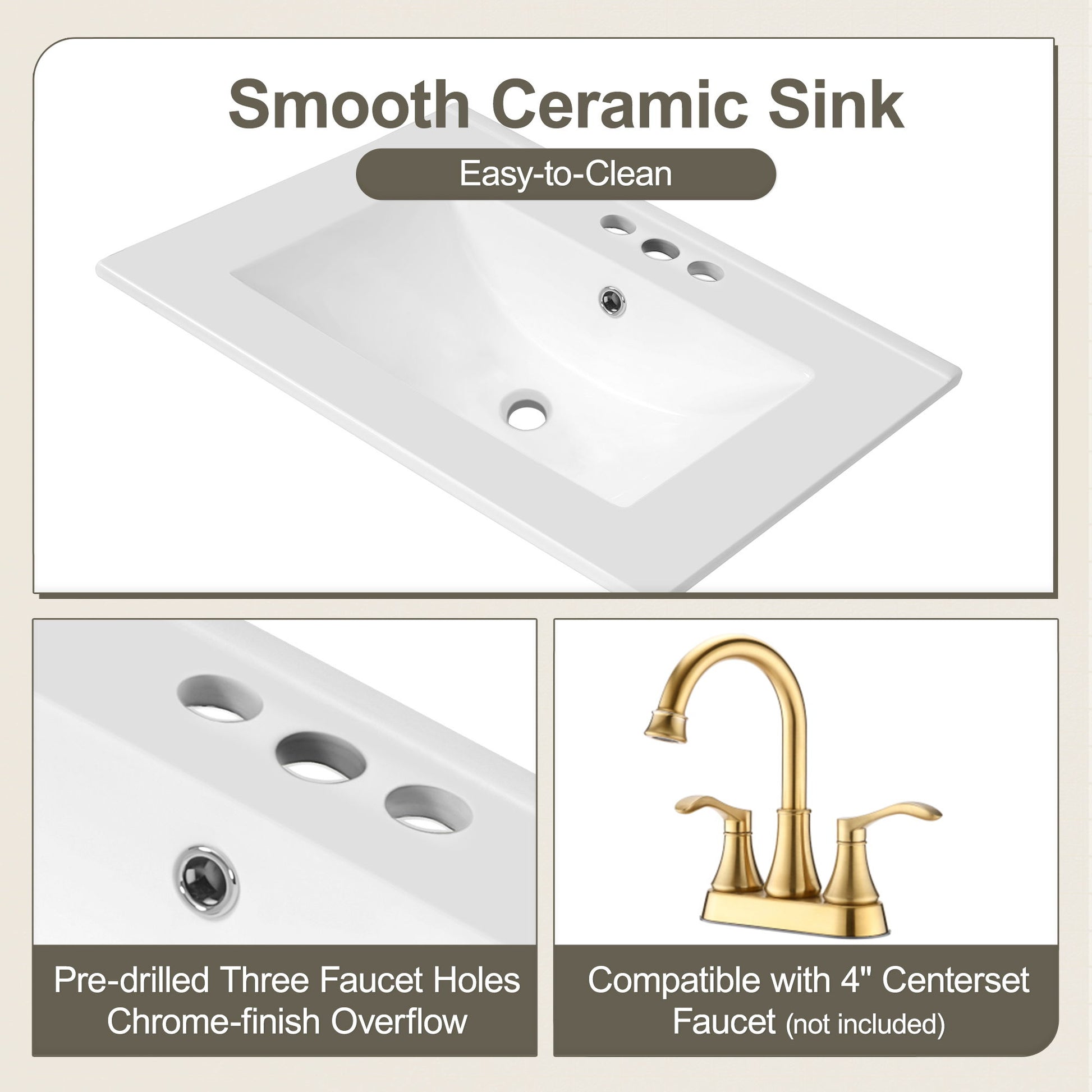 - Ceramic Sink: Easy-to-clean sink with water stain resistance, pre-drilled for 4" widespread faucets (not included) and features a chrome-finish overflow.