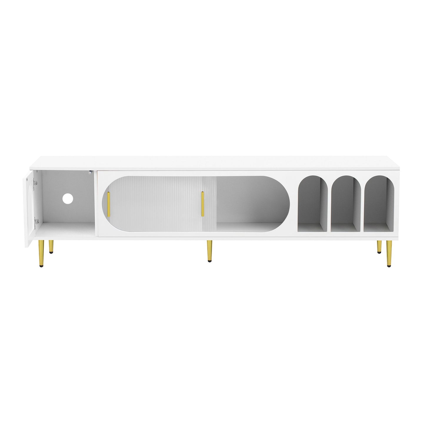 - Elegant Design: This TV stand exudes a romantic modern impression with its elegant design, featuring three semi-open arched shelf areas and a sliding transparent acrylic door, adding sophistication to any living space.