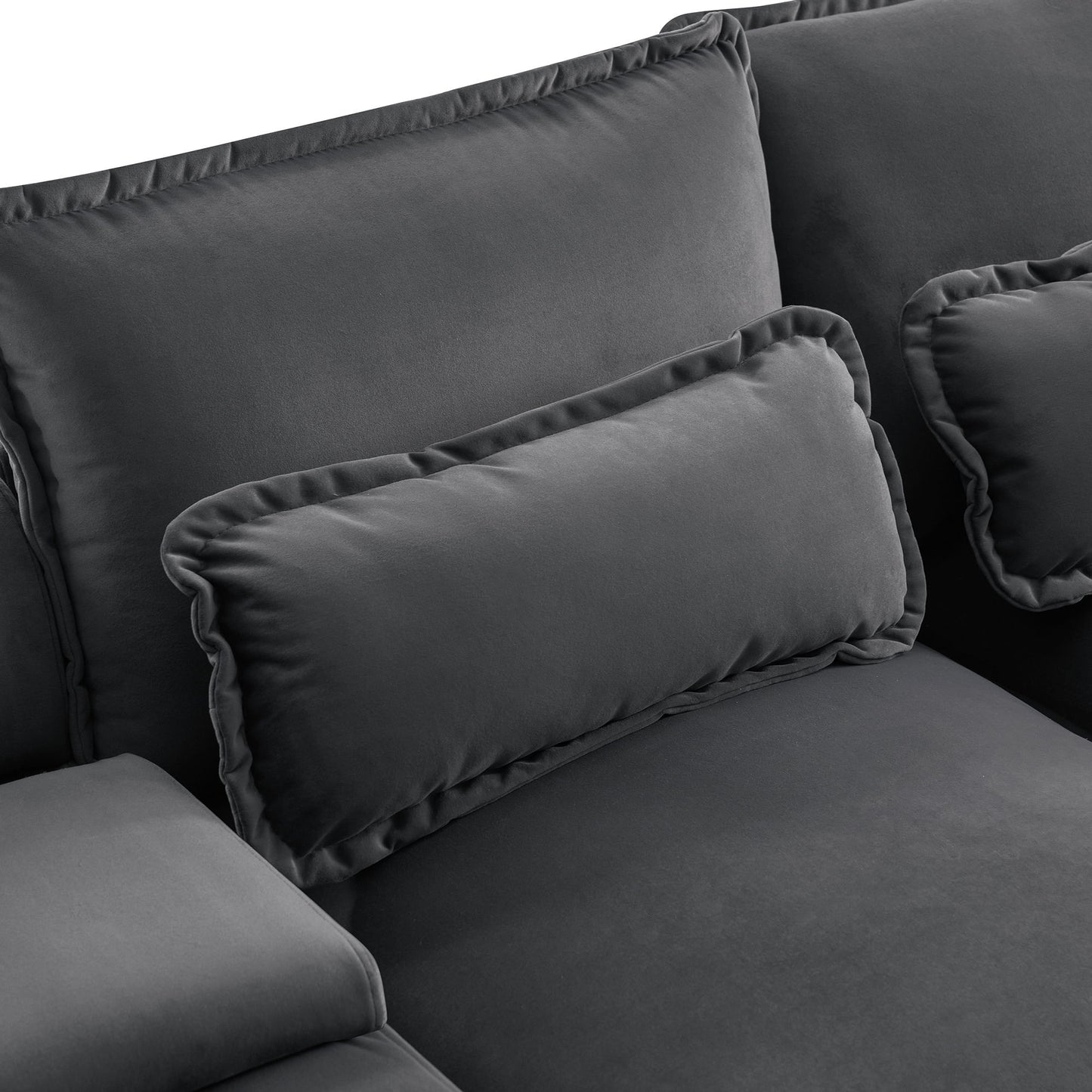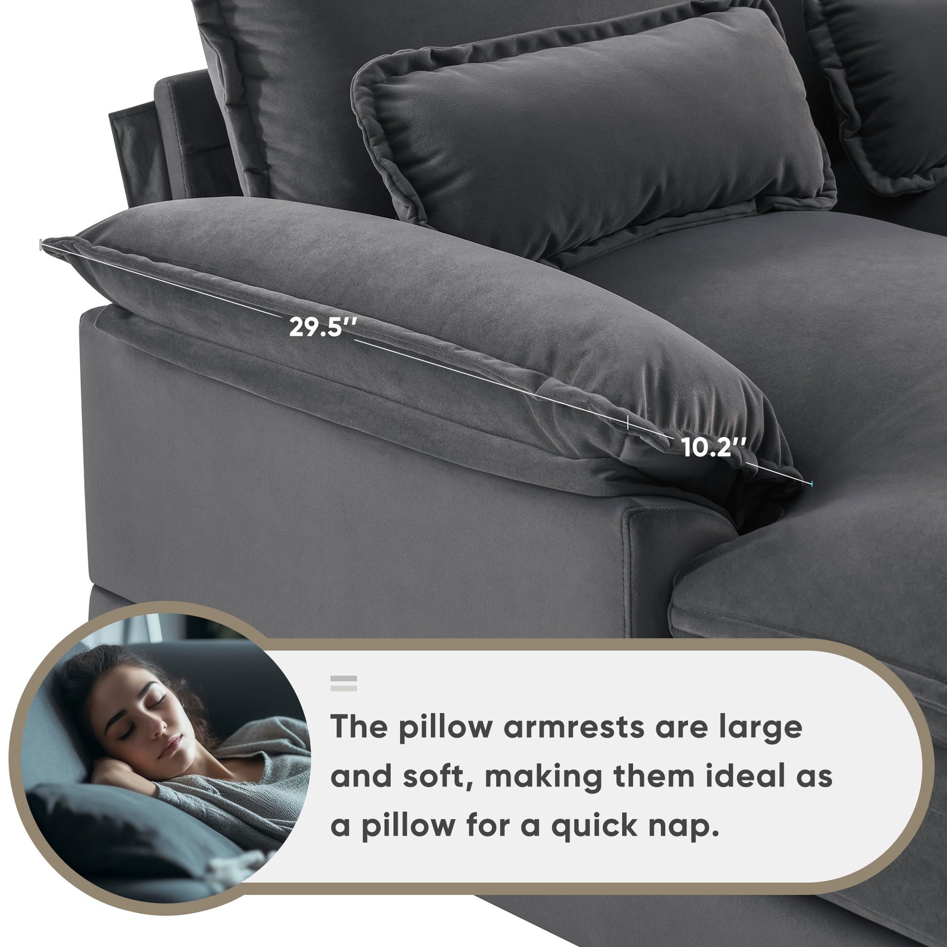 - Comfortable Design: Soft velvet upholstery in gray with armrest and lumbar pillows for enhanced support.