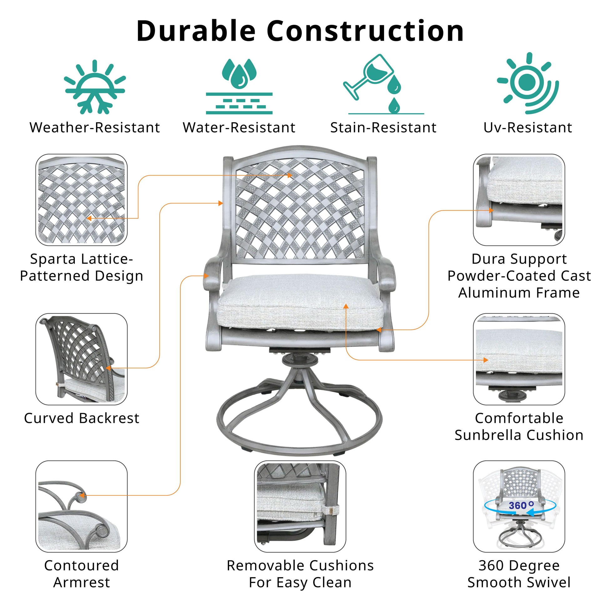 - All-Weather Cushions: Made from 100% solution-dyed olefin, the removable seat cushions offer superior performance in all weather conditions.