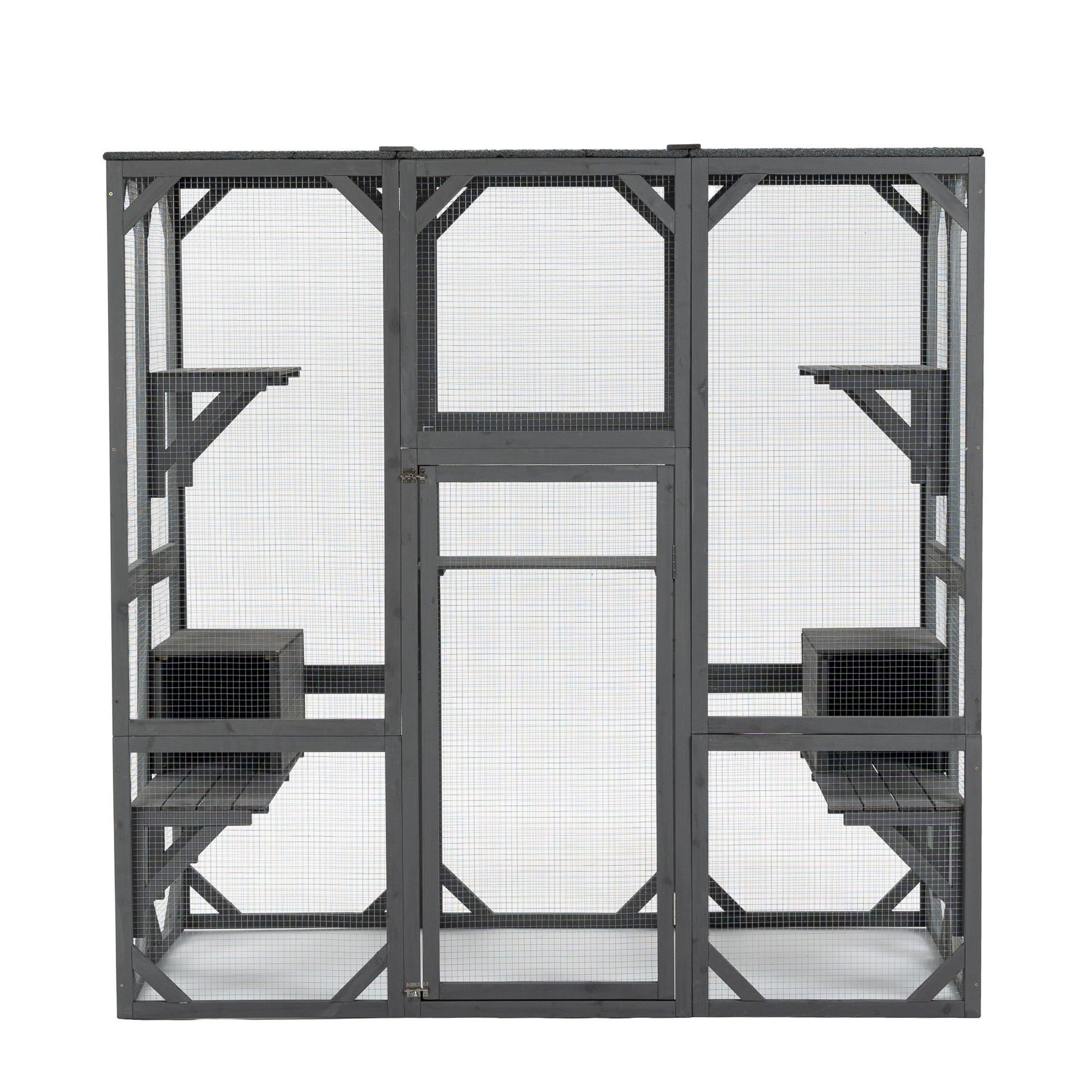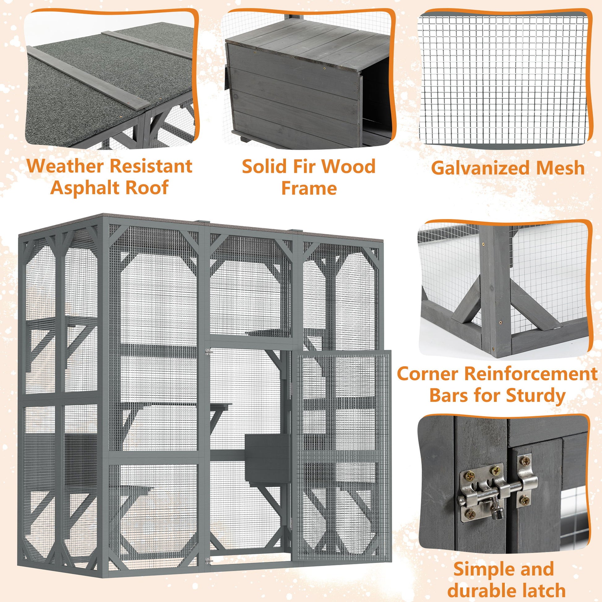 Outdoor Cat House Wooden Catio Enclosure With Cover - Large Cat Cage With Jump Platforms And Condos, Weatherproof - Gray