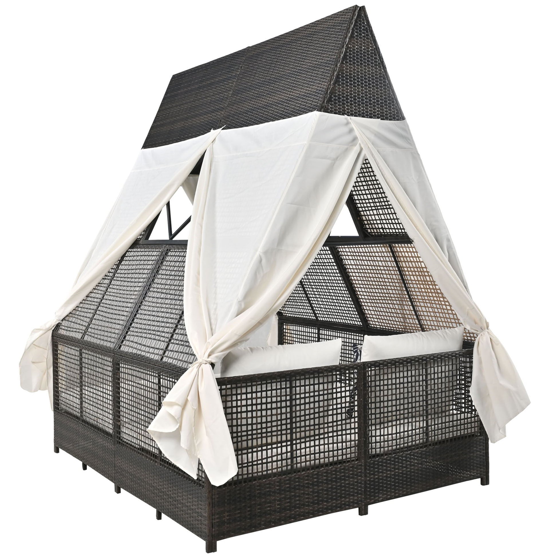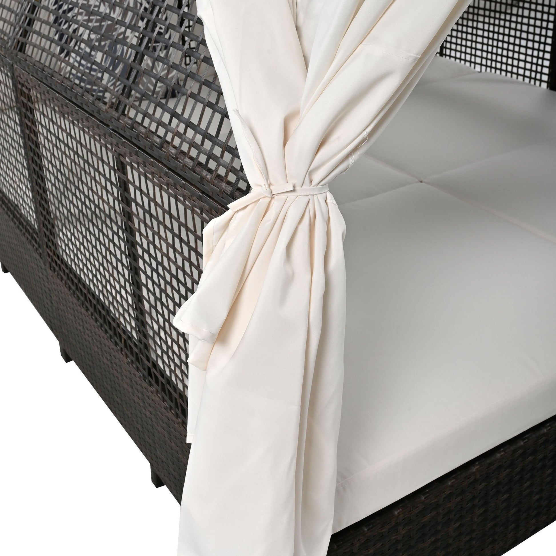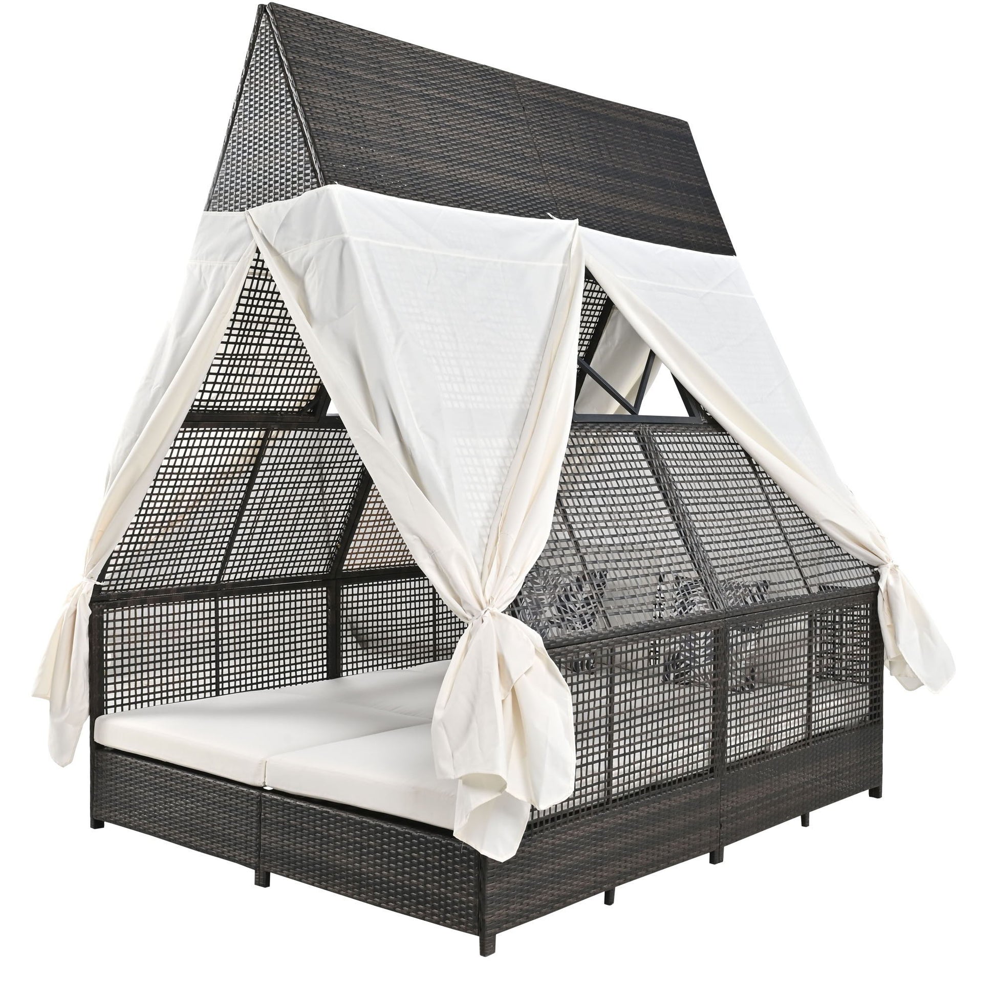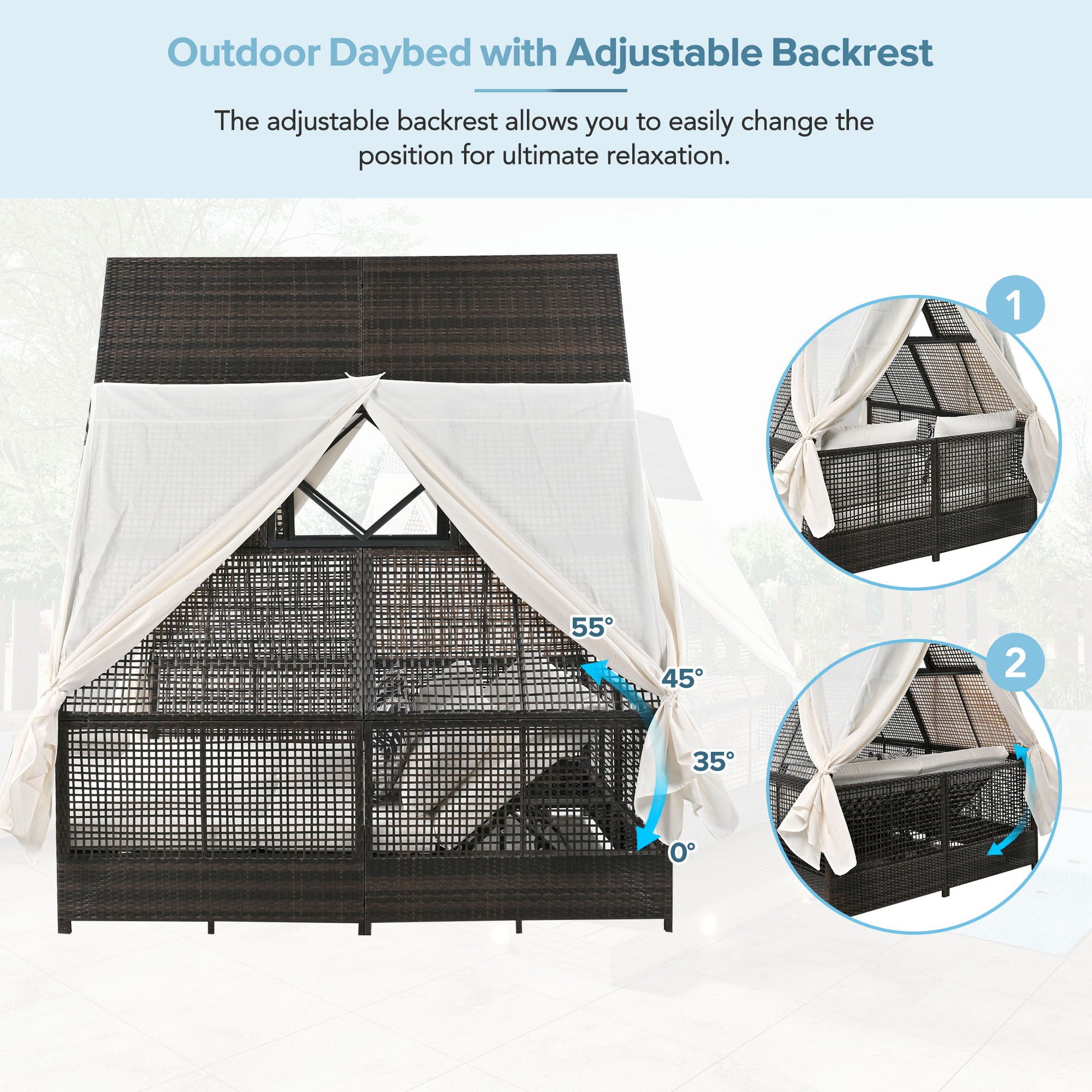 Outdoor Daybed Patio Lounge Bed With Adjustable Backrest Double Sun Lounger With Curtains, 4 Pillows For Garden Patio Poolside Balcony Beach - Cream