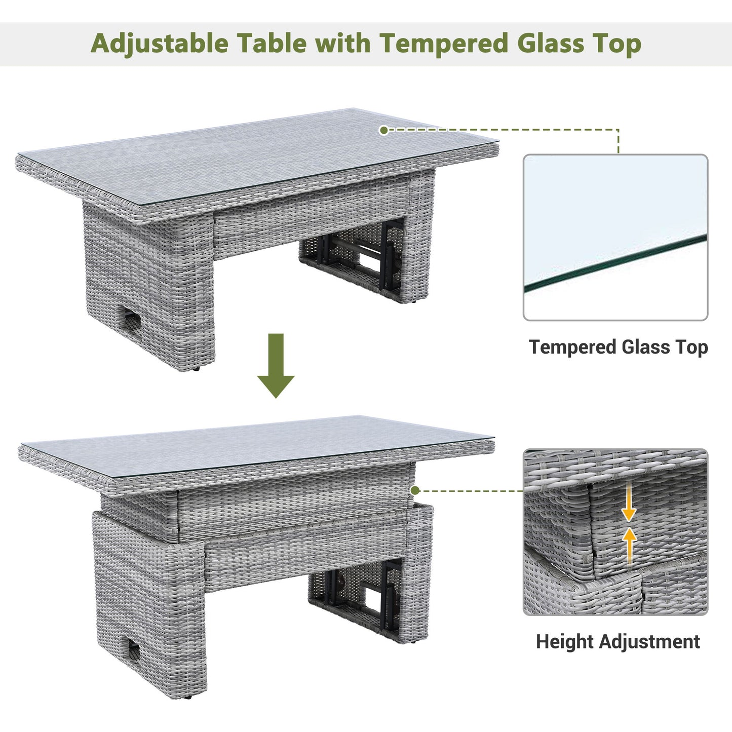 - Adjustable Table: Tempered glass table with adjustable height to suit dining, working, or relaxing needs.