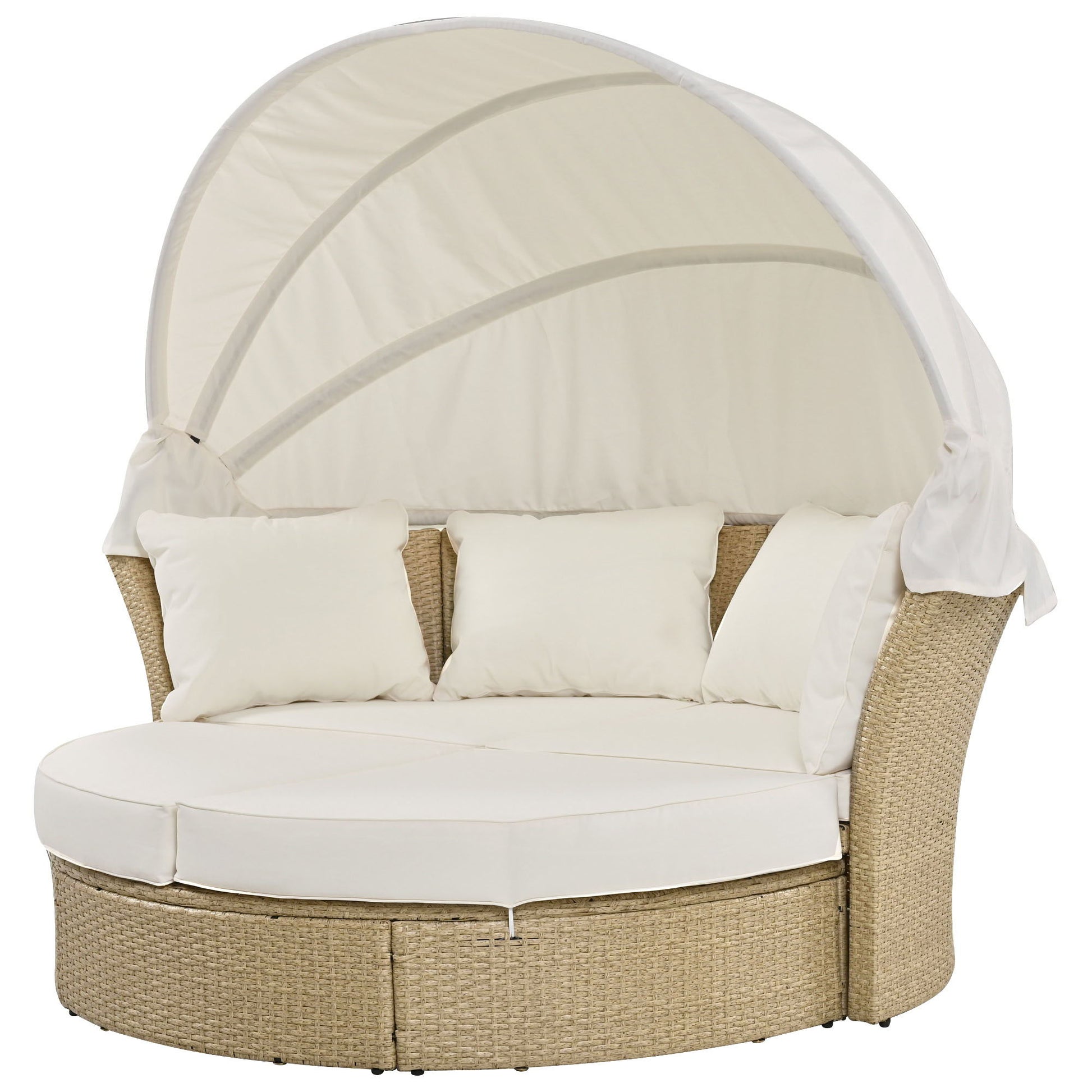 Outdoor Patio Daybed Wicker Rattan Double Daybed Round Sofa Furniture Set With Retractable Canopy, 4 Pillows For Lawn Garden Backyard Porch Pool - Beige
