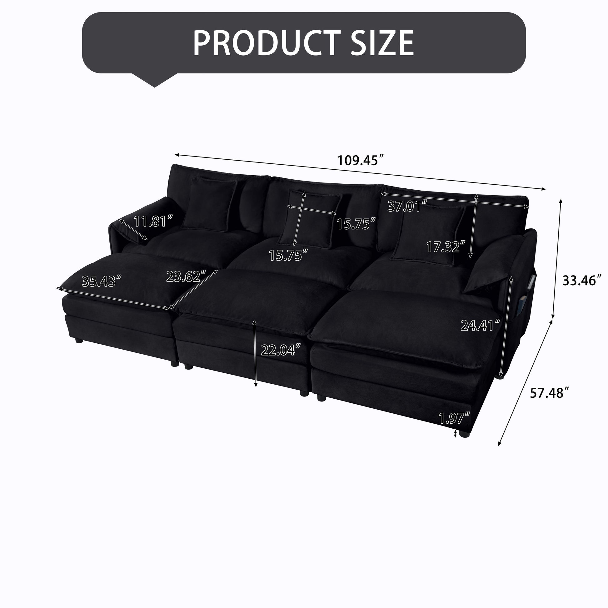 Oversized Deep Seat Sectional Cloud Sofa Sleeper With 3 Ottomans & Soft Pillows, Modular Couch Bed - Black
