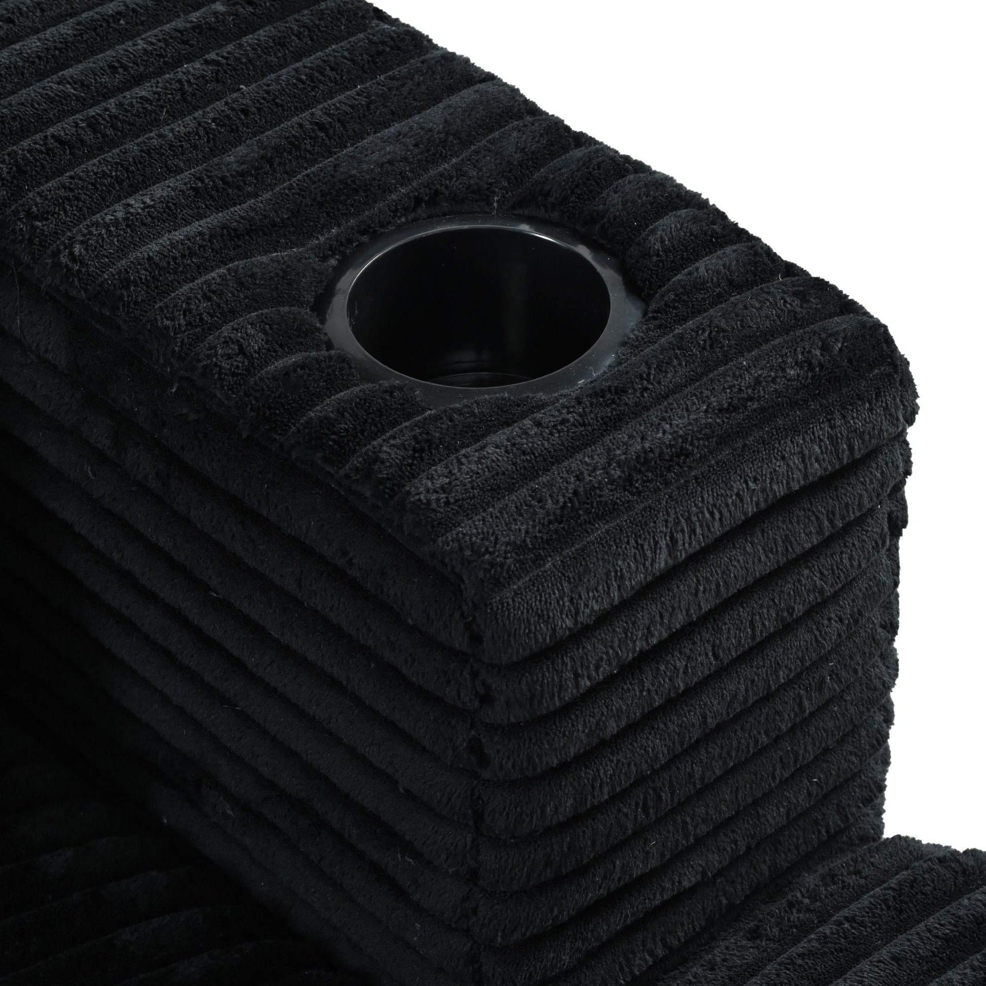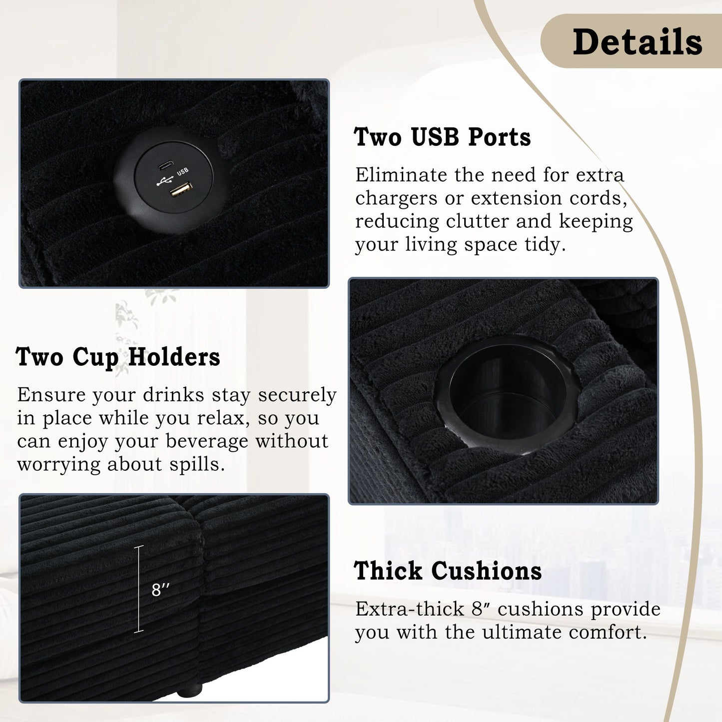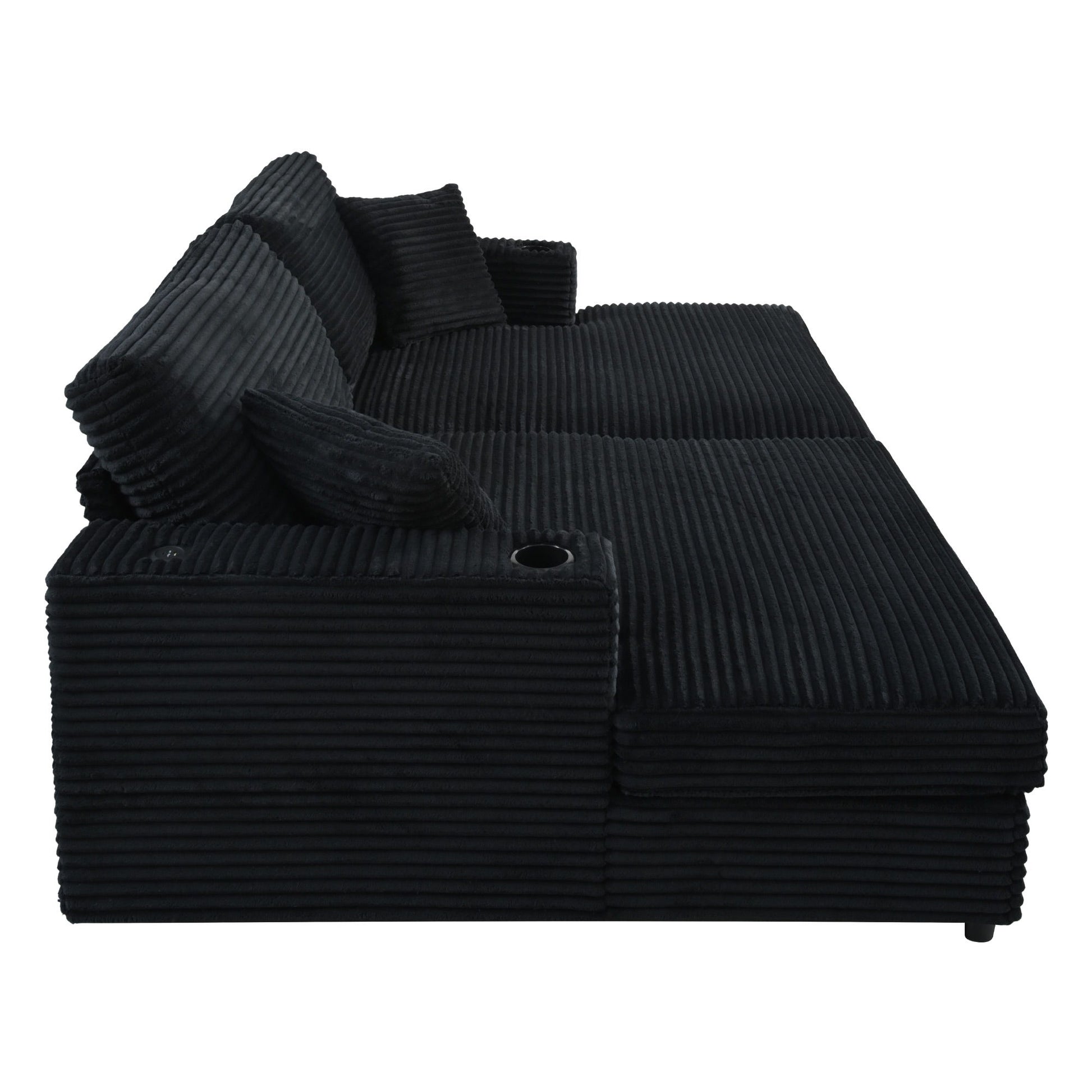 Oversized Loveseat Chaise Lounge Sectional Sofa Bed Corduroy Sleeper Sofa With 2 USB Ports, 2 Cup Holders And 2 Throw Pillows For Living Room And Bedroom - Black