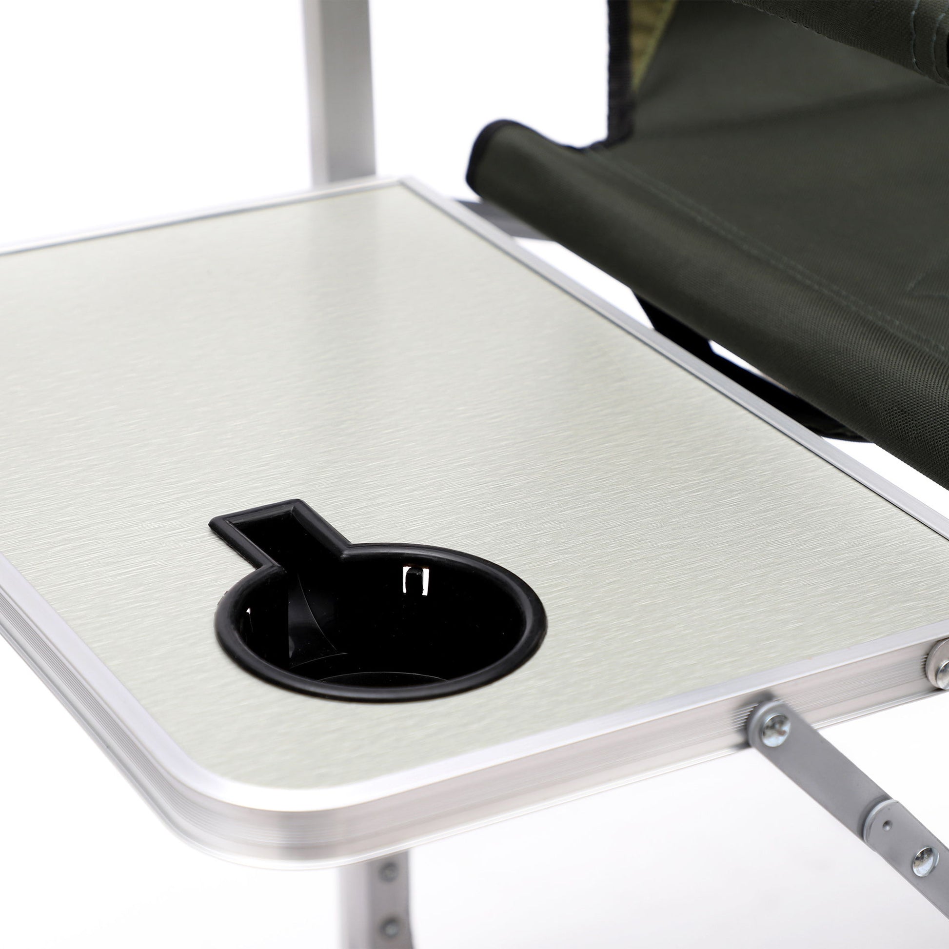 - Built-in Side Table: Features an attached folding side table with a cup holder, perfect for drinks, snacks, or small gear.