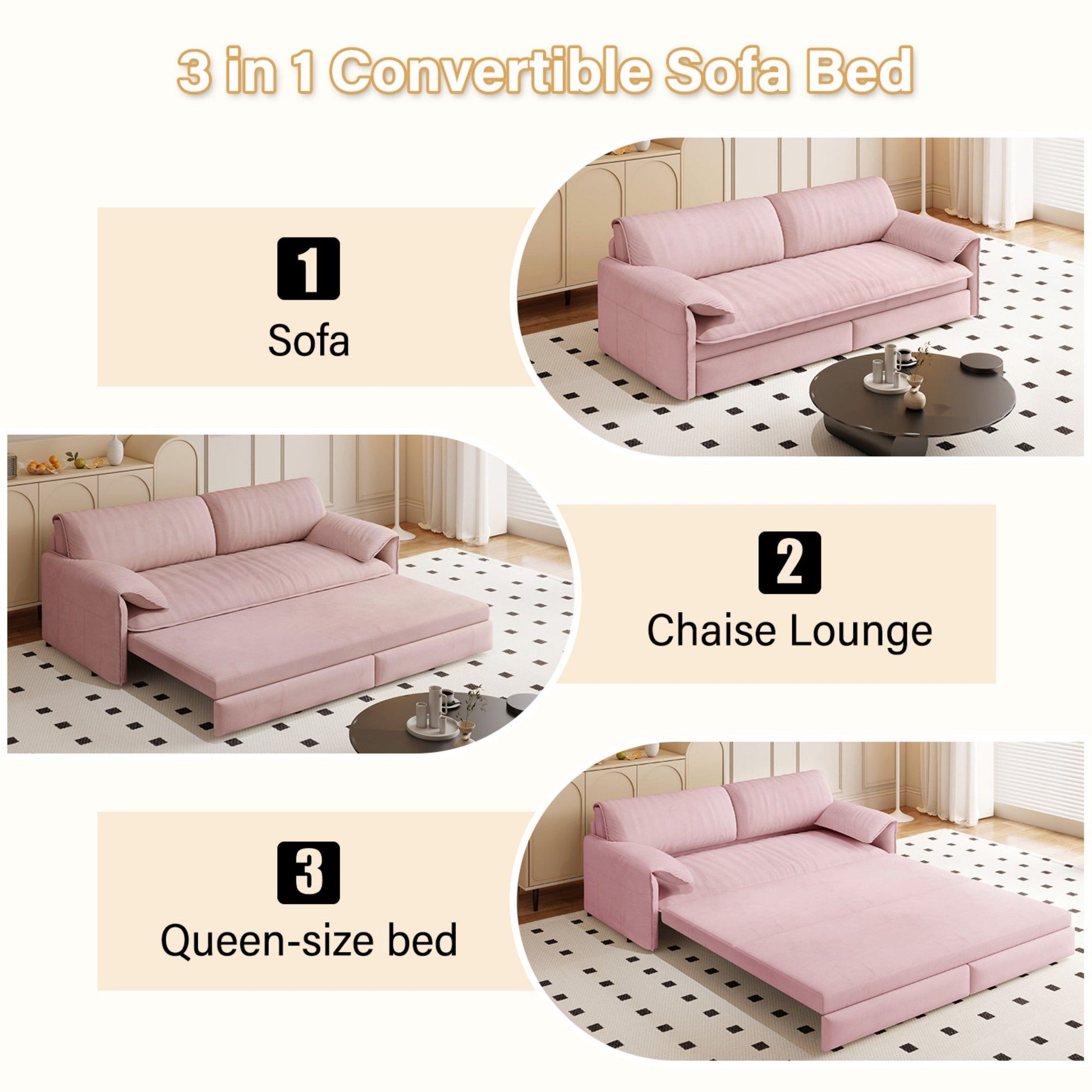 Queen Pull Out Sofa Bed, 3 In 1 Convertible Sleeper Sofa With Side Storage Multifunctional Velvet Loveseat Bed For Living Room - Pink