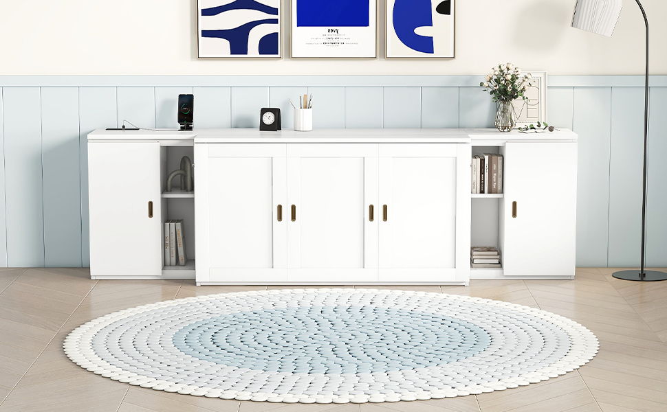 This space-saving bed can be used every night and is perfect for small apartments or studios. The hideaway bed is easy to use—simply pull the handles and flip down the support leg onto the floor. This Murphy bed folds away into a cabinet, freeing up floor space in any room. It’s the ideal space-saving furniture for multipurpose guest rooms, home offices, or home gyms. With shelves and cabinets, this Murphy bed provides more storage space for household items. Stylish and practical, it features a headboard with built-in USB and Type-C ports, ensuring your devices stay charged during long binge-watching sessions or gaming marathons.