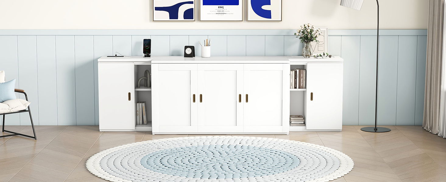 Dimensions & Assembly: 108.8"L x 86.3"W x 32.2"H (as a bed); 108.8"L x 24"W x 32.2"H (as a cabinet). Mattress not included. Partial assembly required, with clear instructions and tools provided.