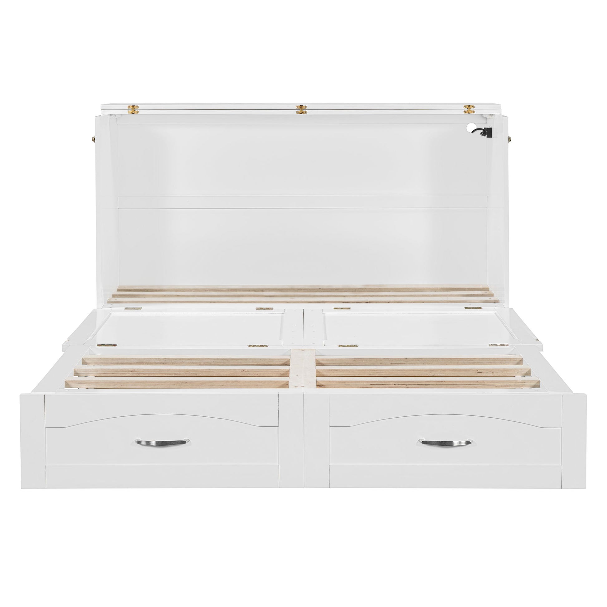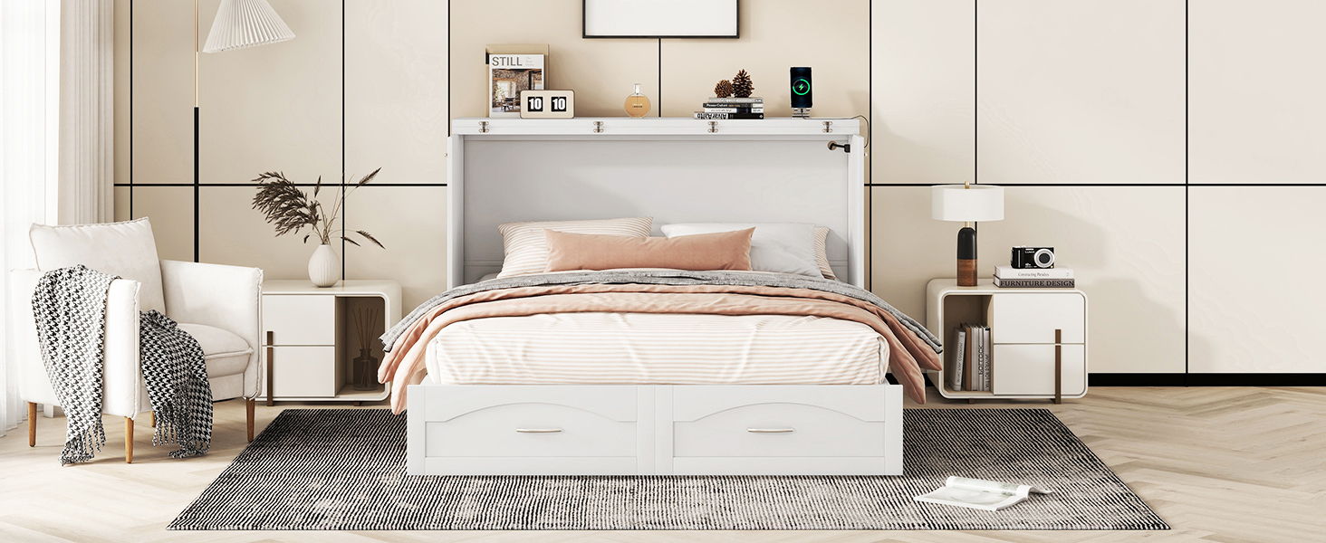 Queen Size Murphy Wall Bed With Drawer And A Set Of Sockets & USB Ports, Pulley Structure Design - White