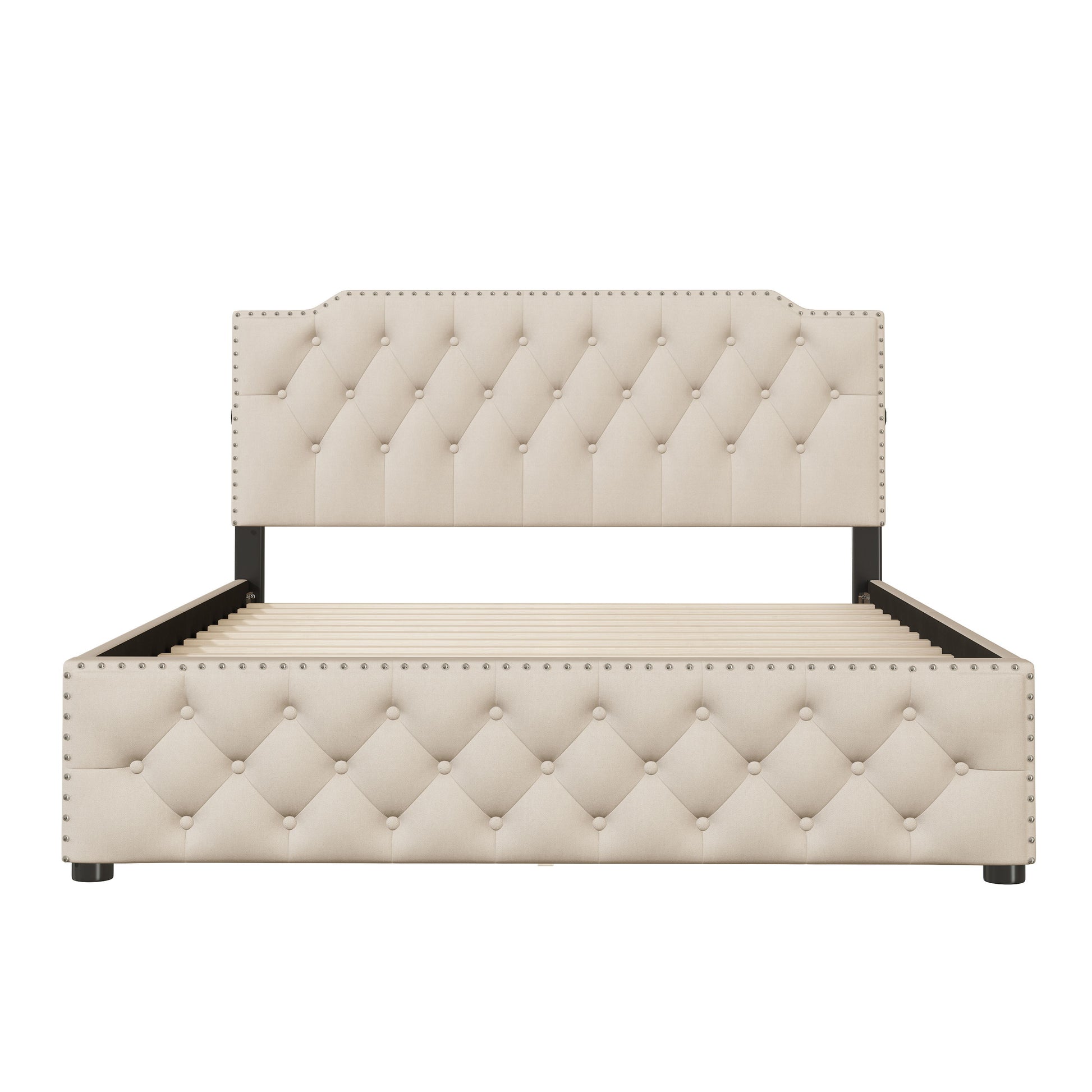 Queen Size Upholstered Platform Bed With 2 Drawers And 2 Sets Of USB Ports On Each Side - Beige