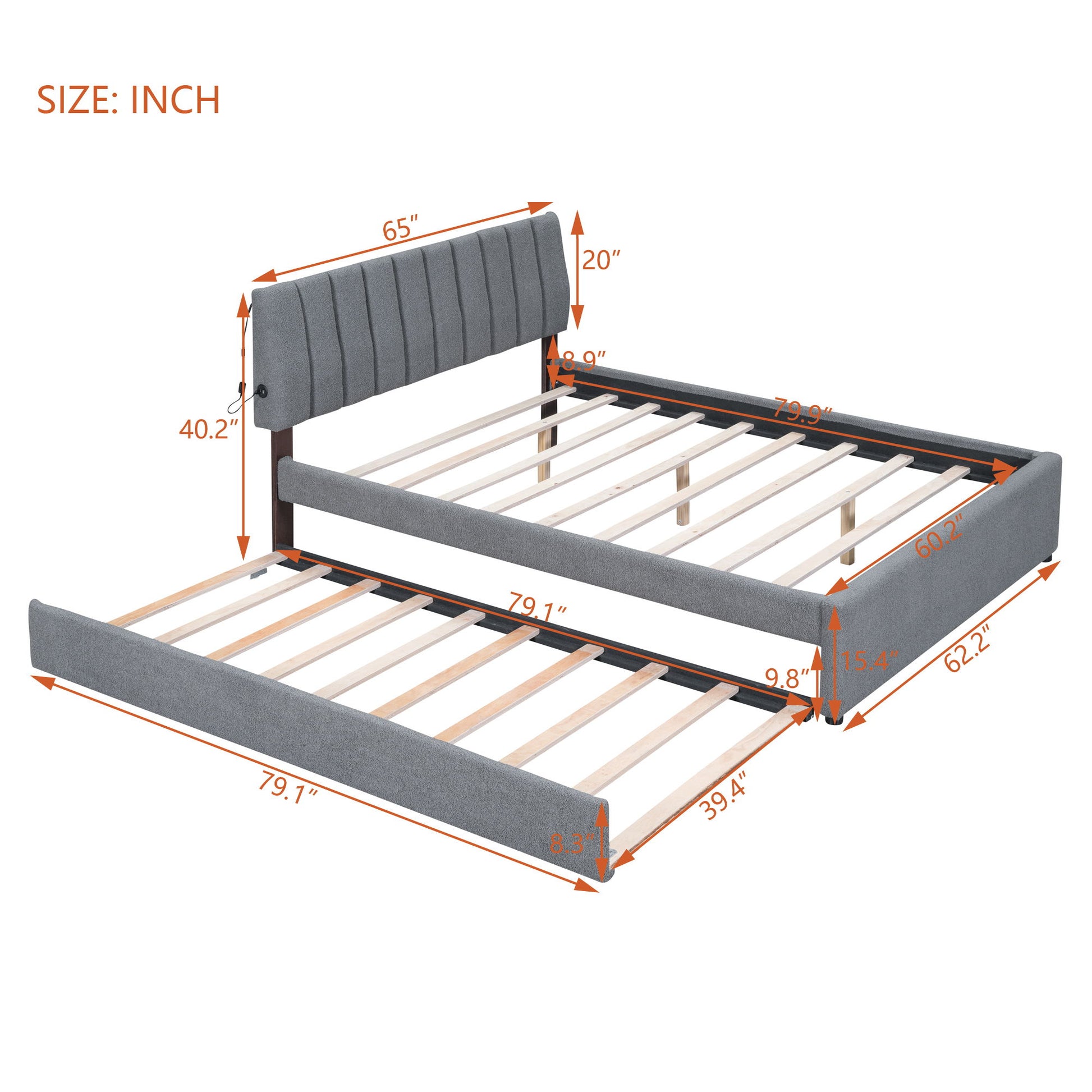 Queen Size Upholstered Platform Bed With Twin Long Trundle - Gray