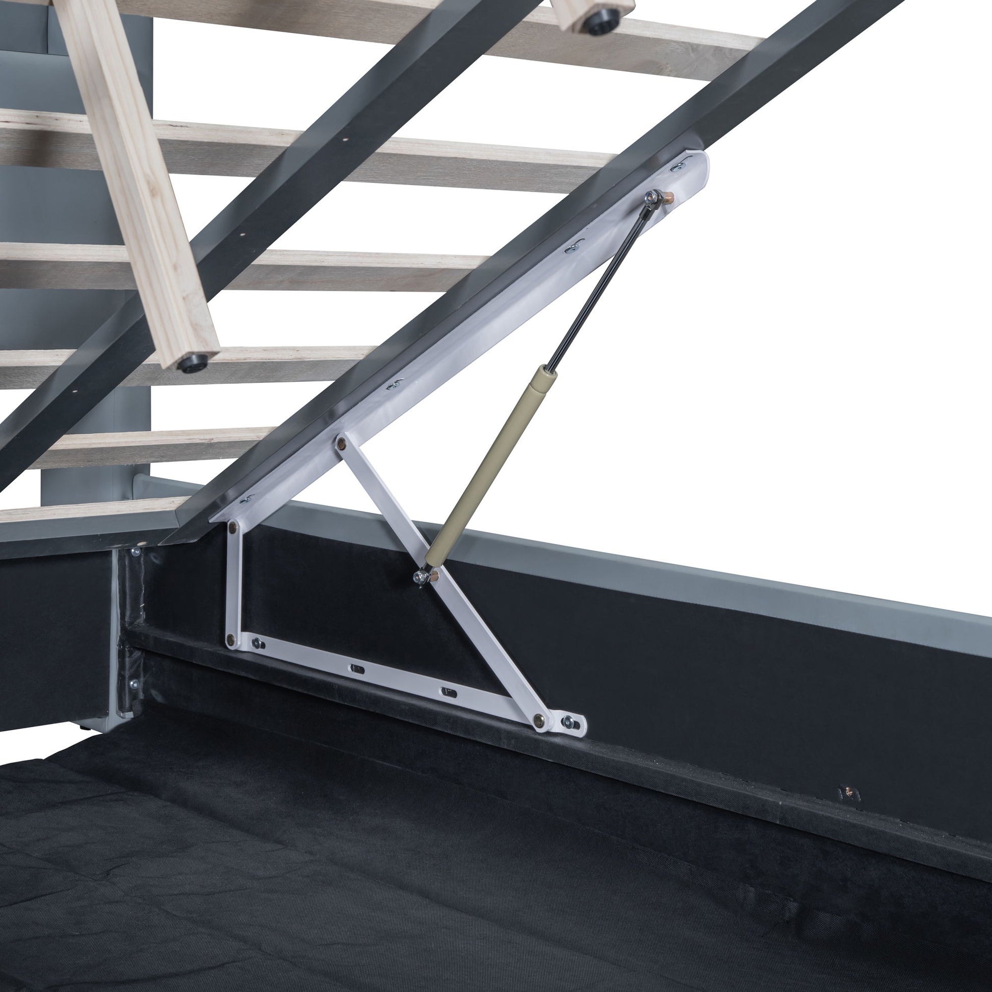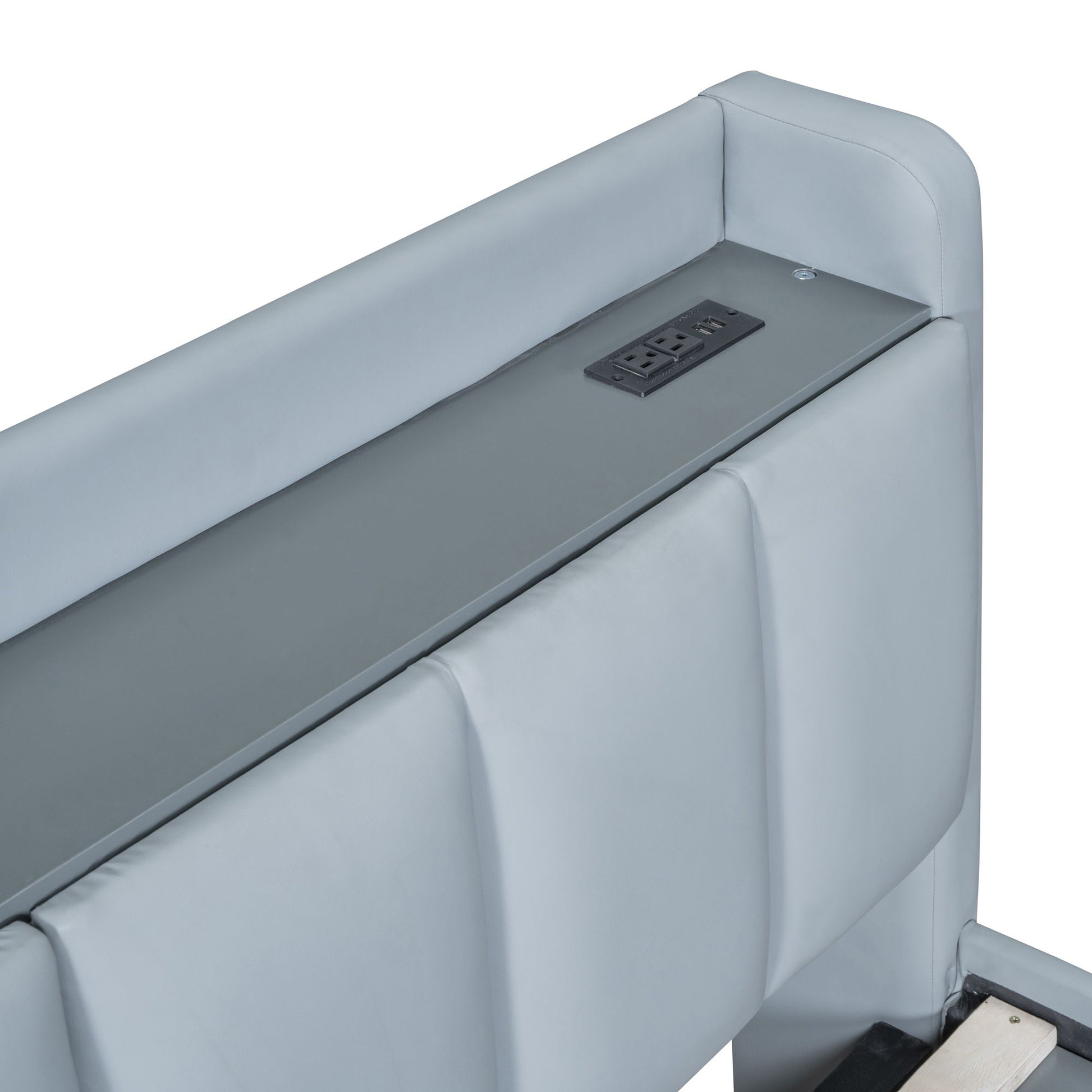 Queen & Twin Long Size Upholstered Platform Bed, Mother & Child Bed With Hydraulic Storage System, Drawer Box, Bedhead Storage Shelf And 2 Pairs Of Sockets & USB Ports - Gray