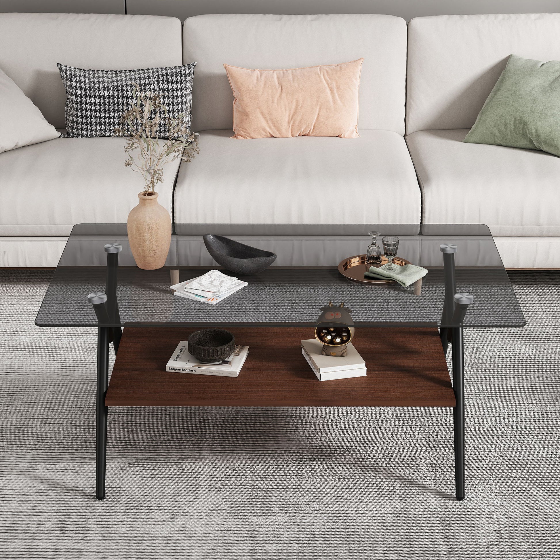 Rectangle Coffee Table With Tempered Glass Top And Brown MDF Shelf, Modern Table For Living Room - Gray