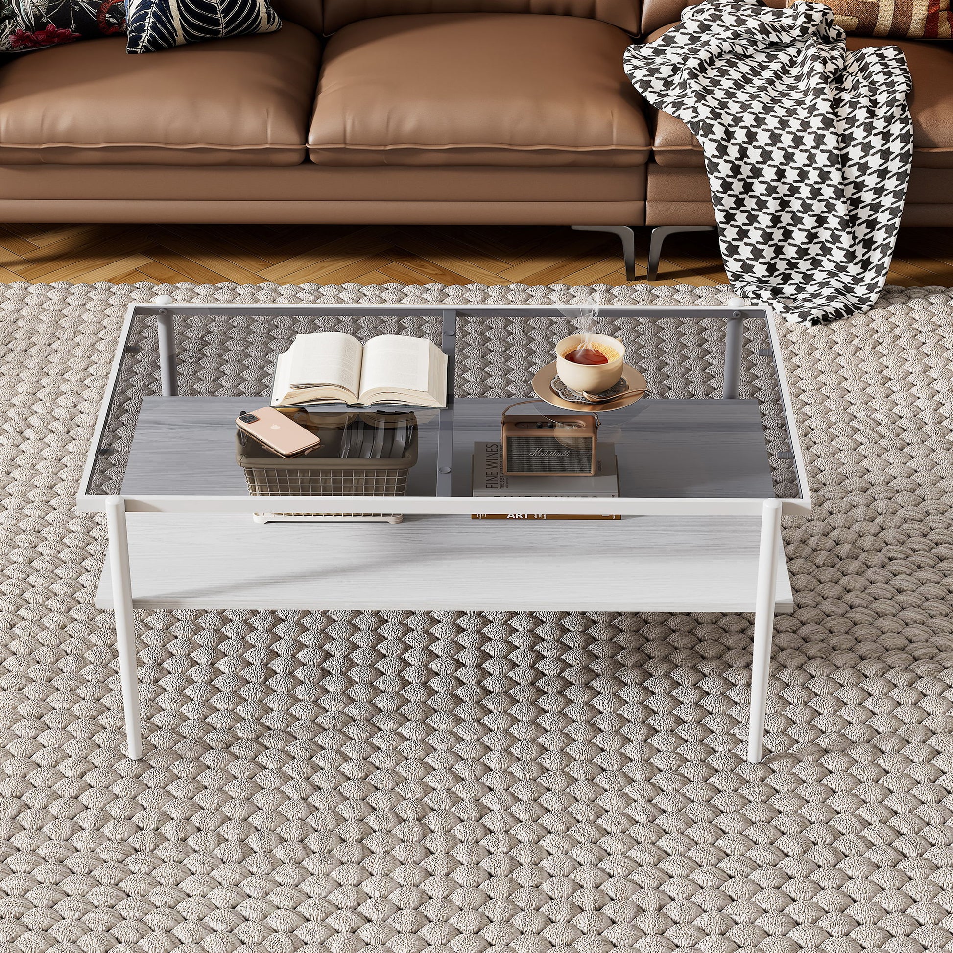 Rectangle Coffee Table With Tempered Glass Top And White Legs, Modern Table For Living Room - Gray