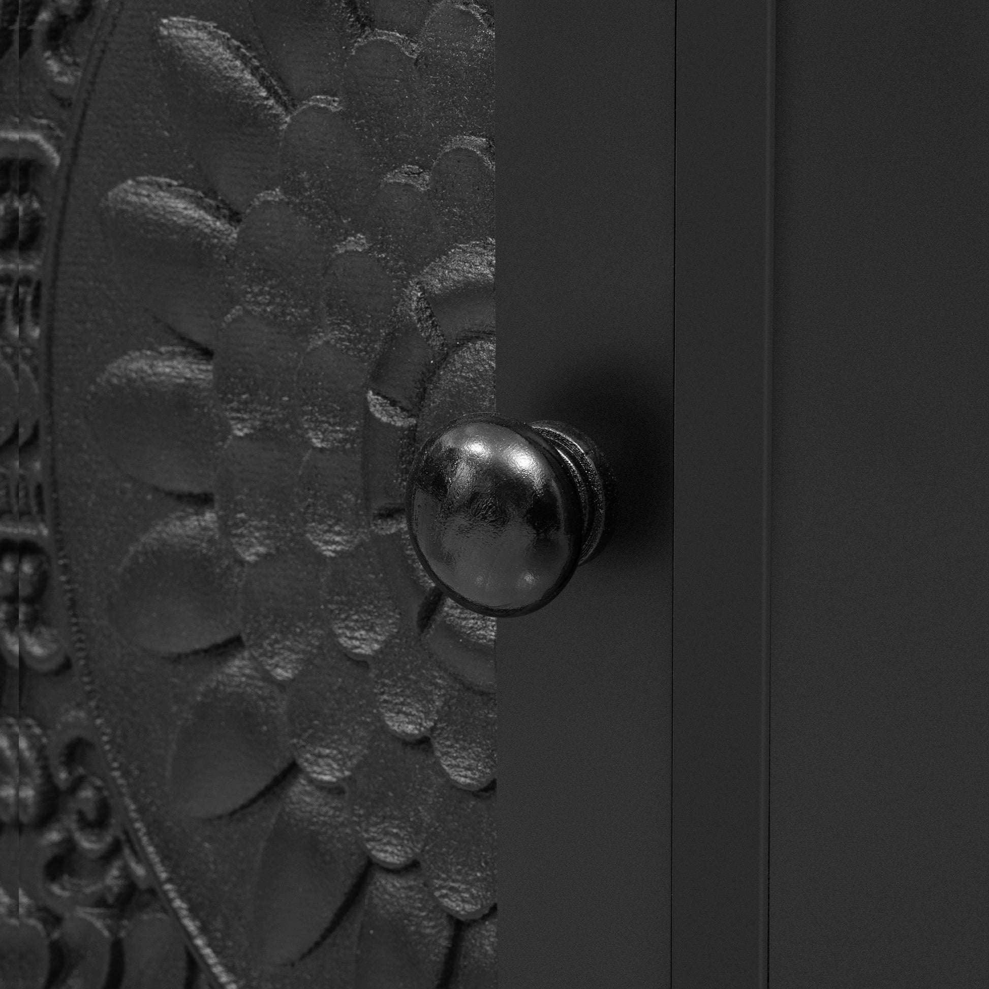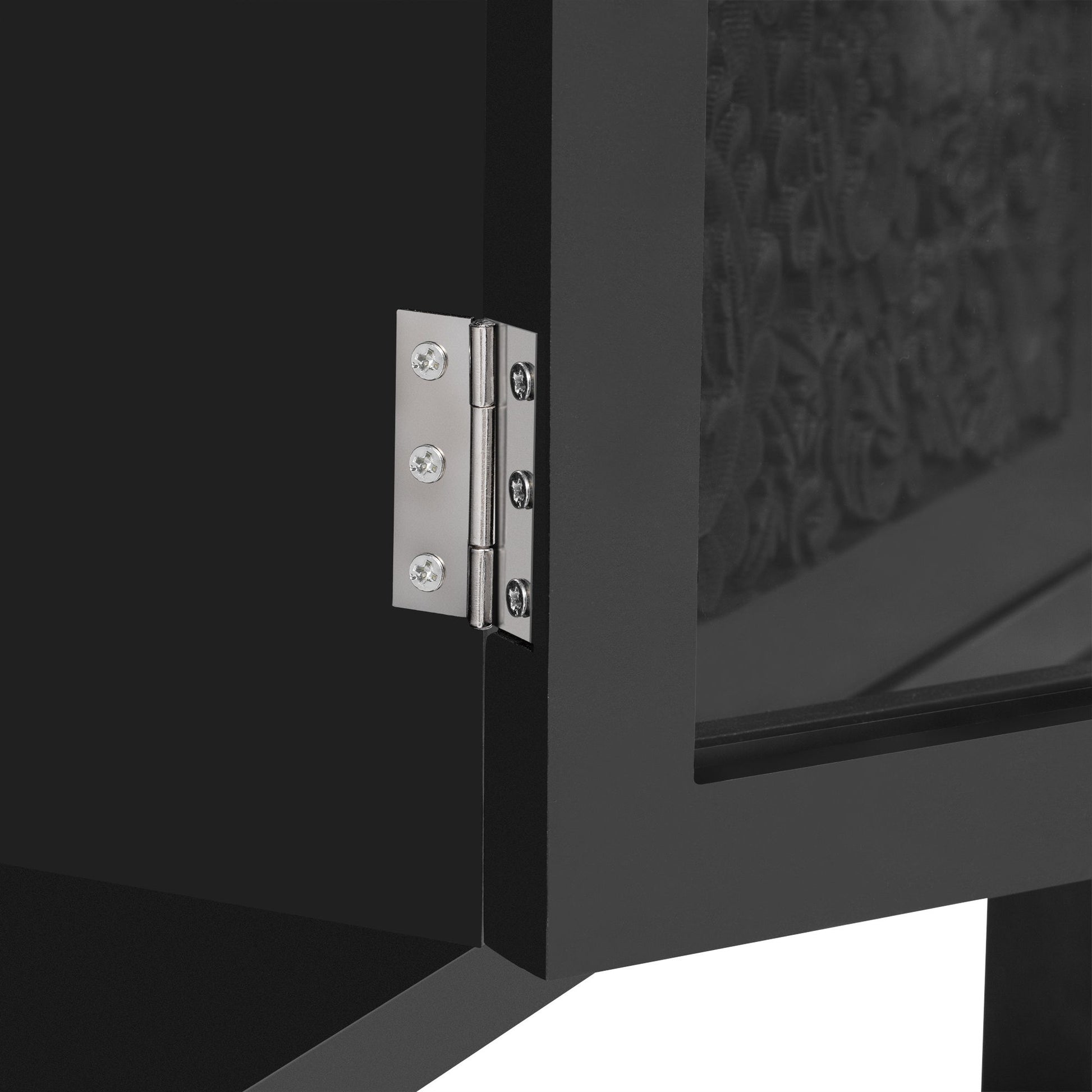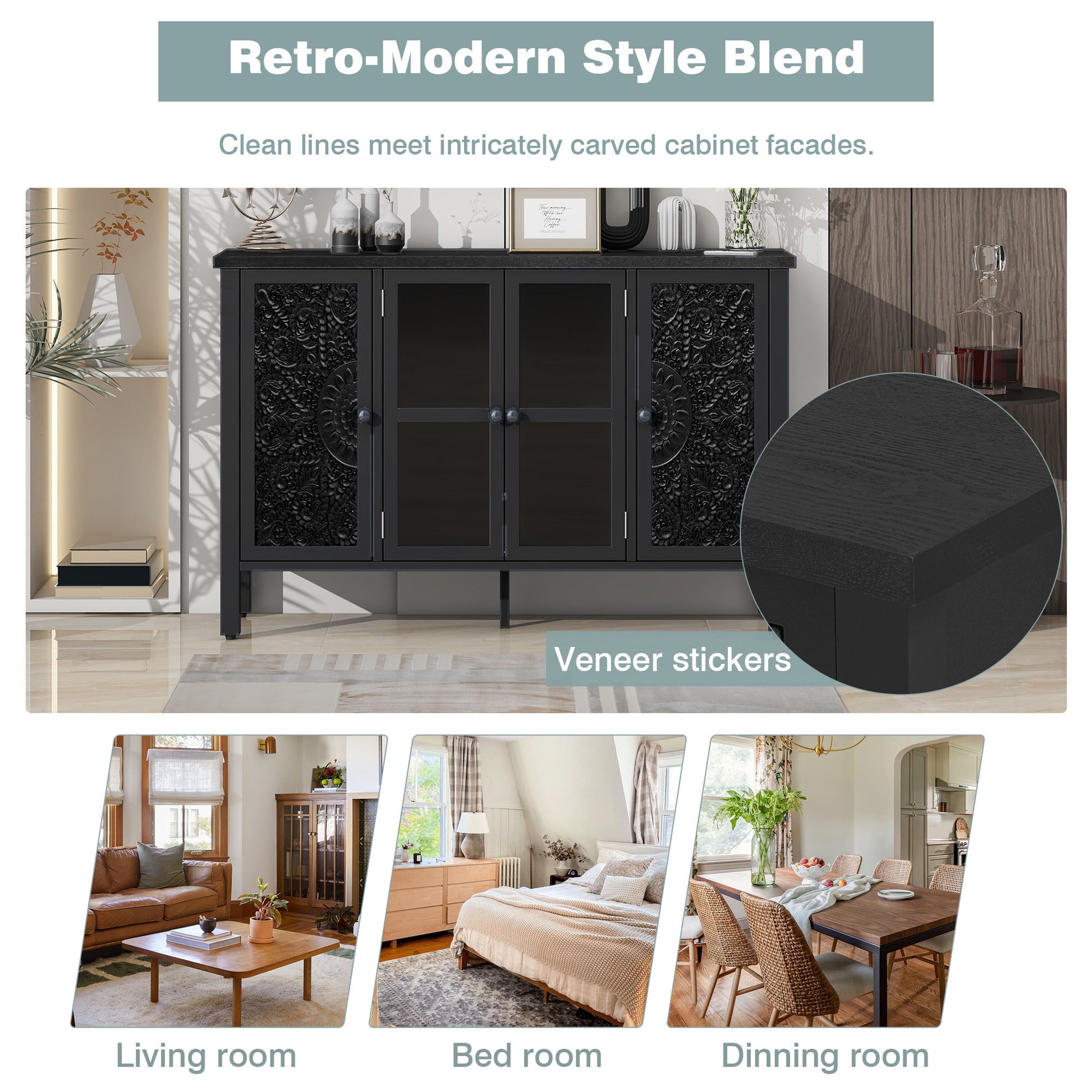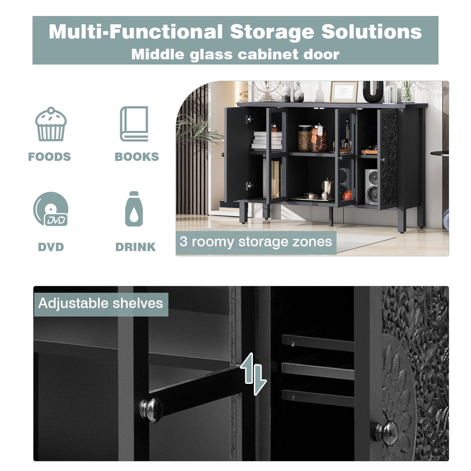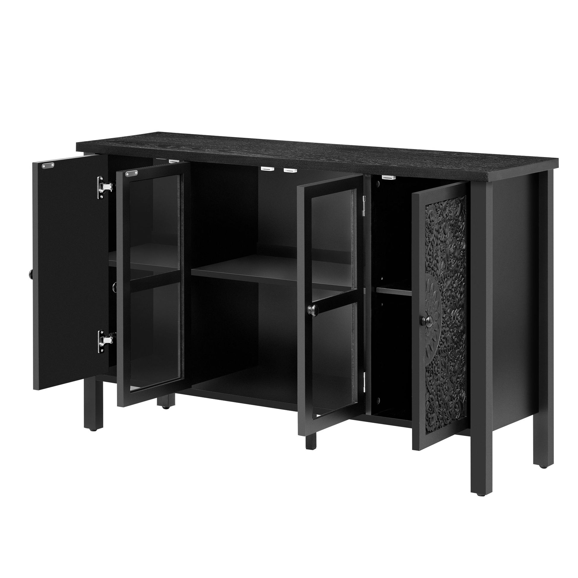- Ample Storage Space: Including three spacious cabinets, the middle cabinet features a glass door that clearly displays the items inside. The cabinet doors on both sides are symmetrically carved with patterns, and each cabinet contains an adjustable shelf.