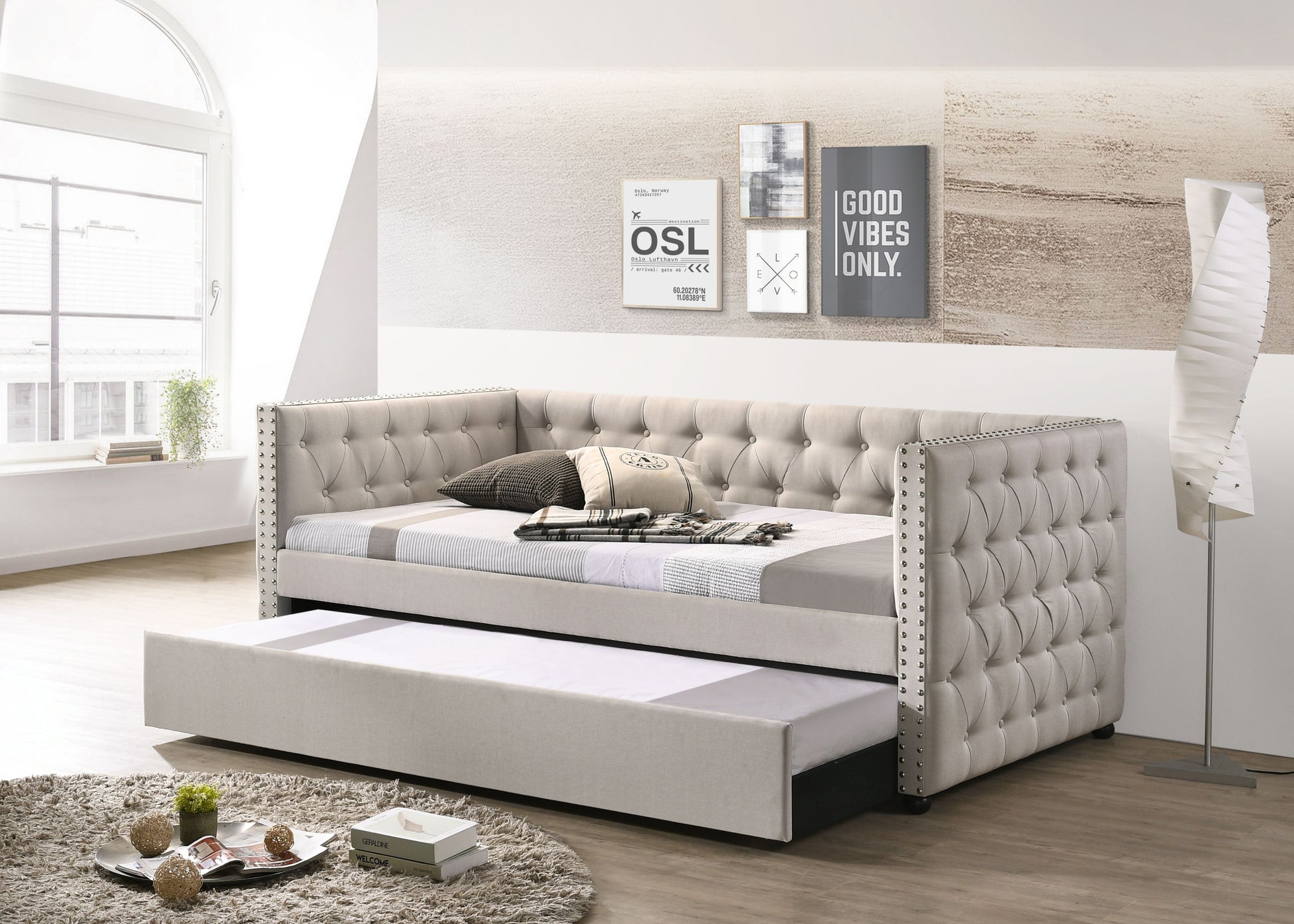 - Design Features: The Romona Beige Fabric Daybed includes a full-size daybed with button tuft and nailhead trim accents, adding a touch of elegance to any room. It features a twin-size trundle, ideal for accommodating extra guests.