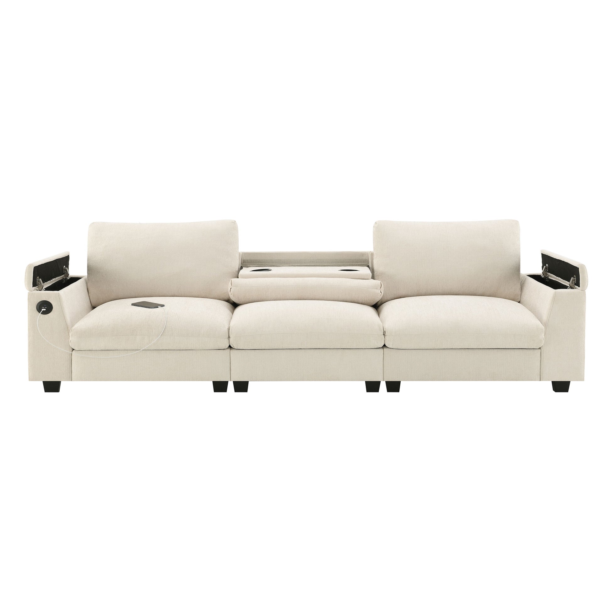 Sectional With Bluetooth Speaker Comfy Cloud Couch Set With Drop Down Table Cup Holders, USB Charger Storage Armrest Wide Seat Sofa - Beige