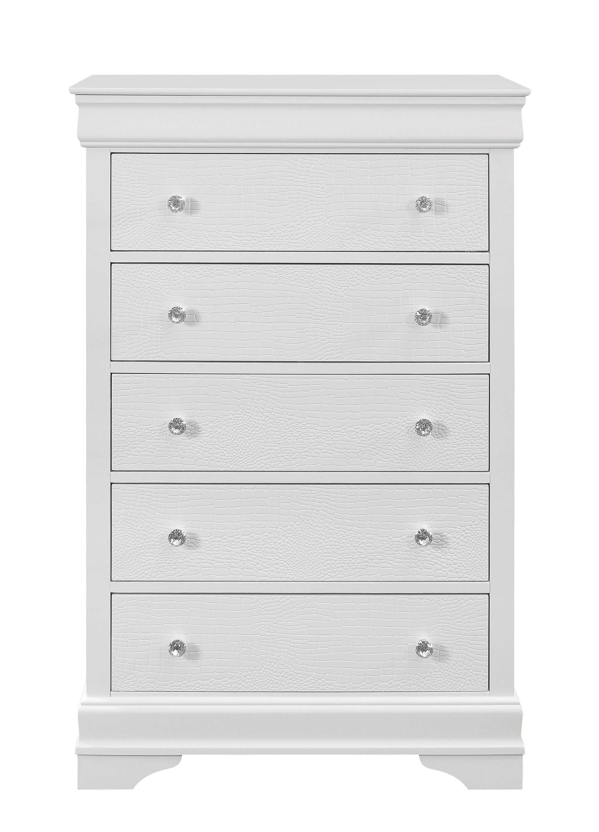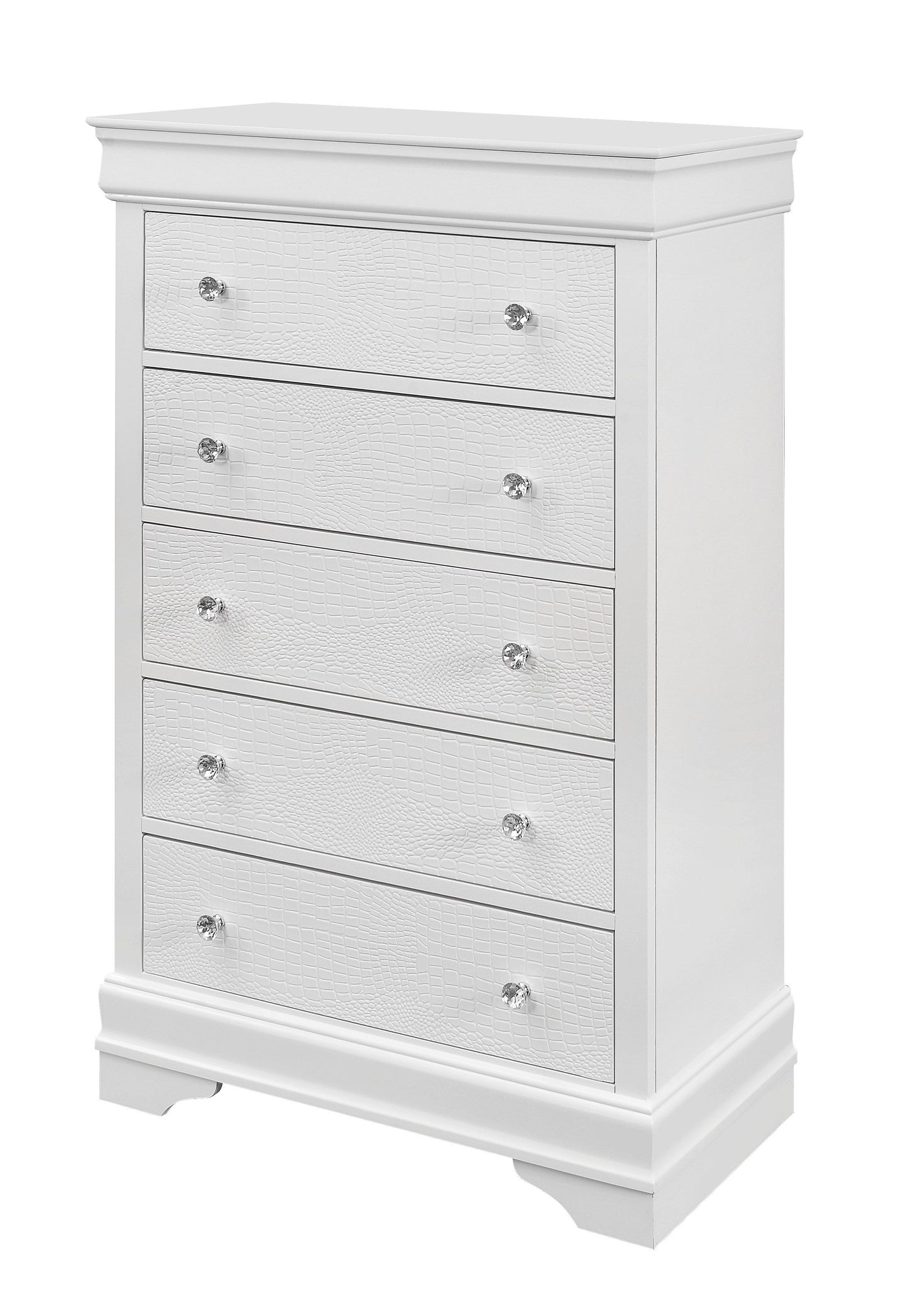 - Elegant Design: The SHAKER CROCODILE METALLIC WHITE CHEST features crystal embellished hardware and textured detailed drawer fronts, offering a luxurious and sophisticated look.