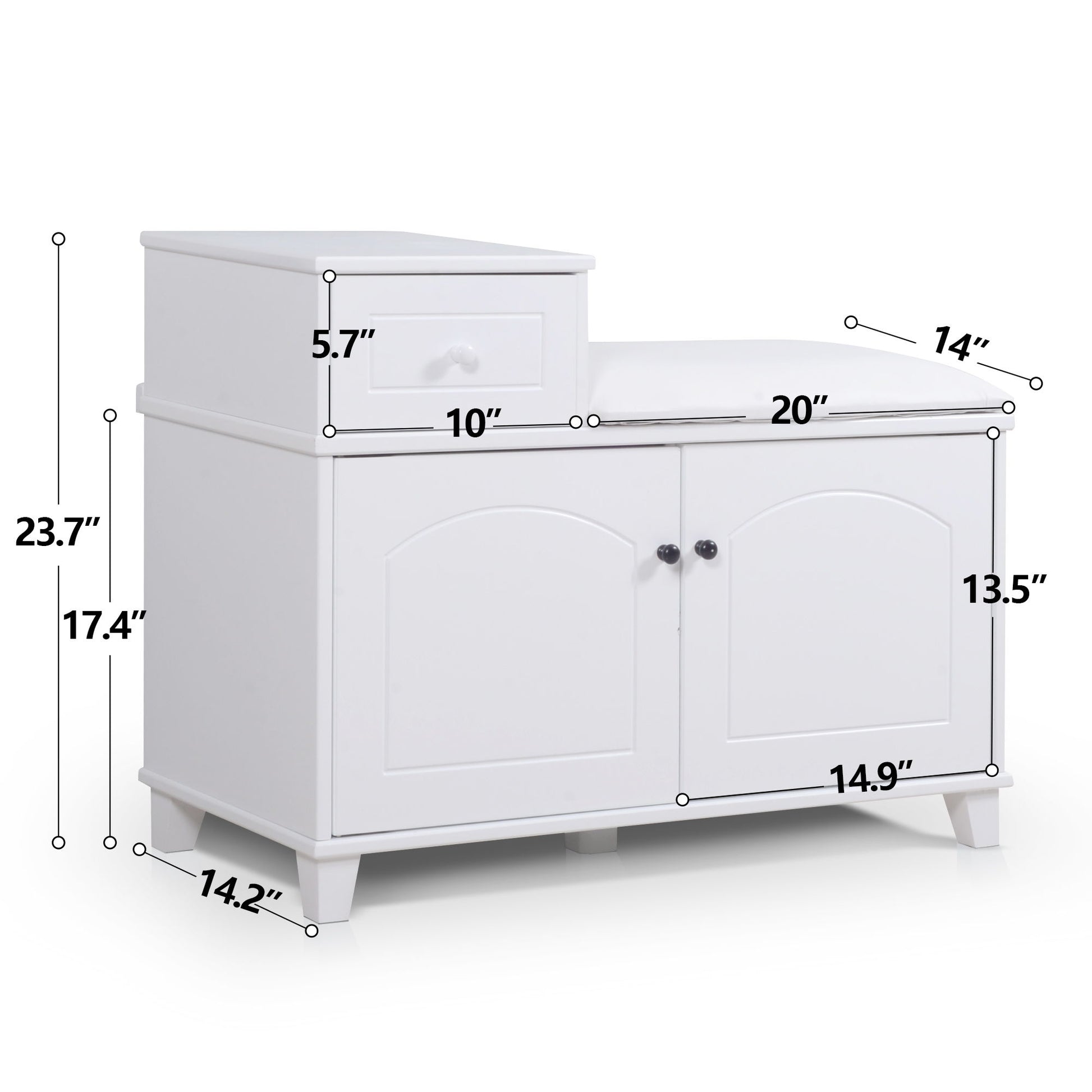 Shoe Storage Bench Cabinet With Fireproof Cushion, Double Doors And Movable Drawer For Door Entrance - White