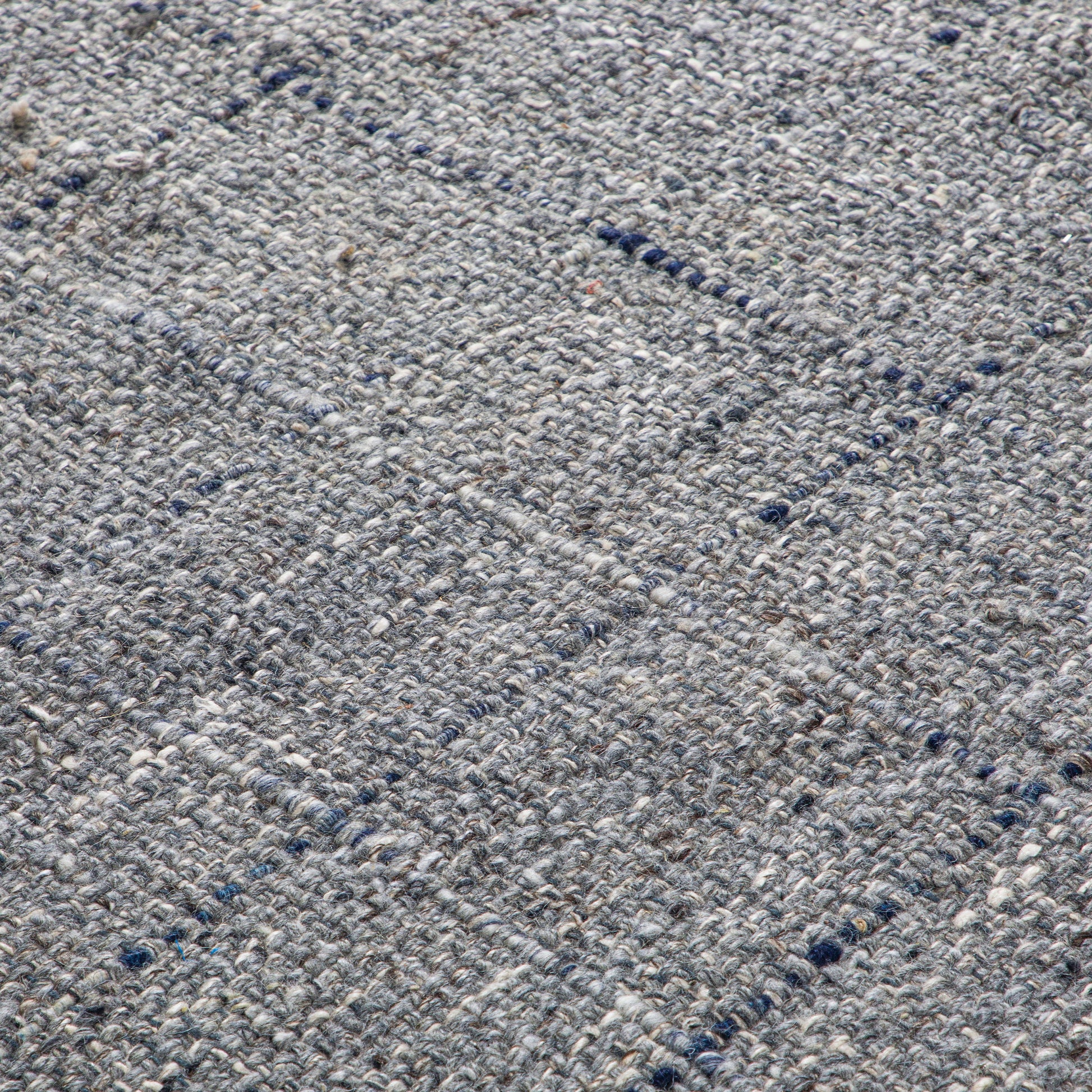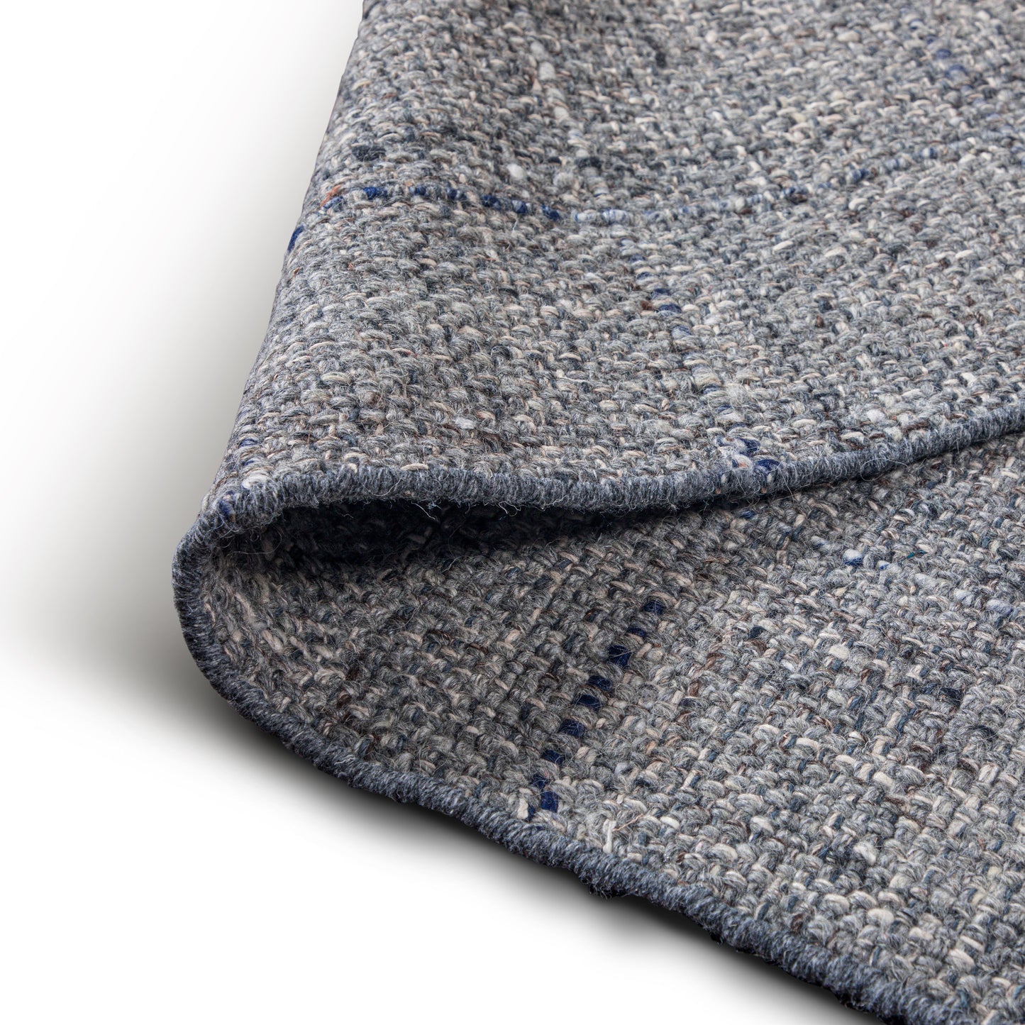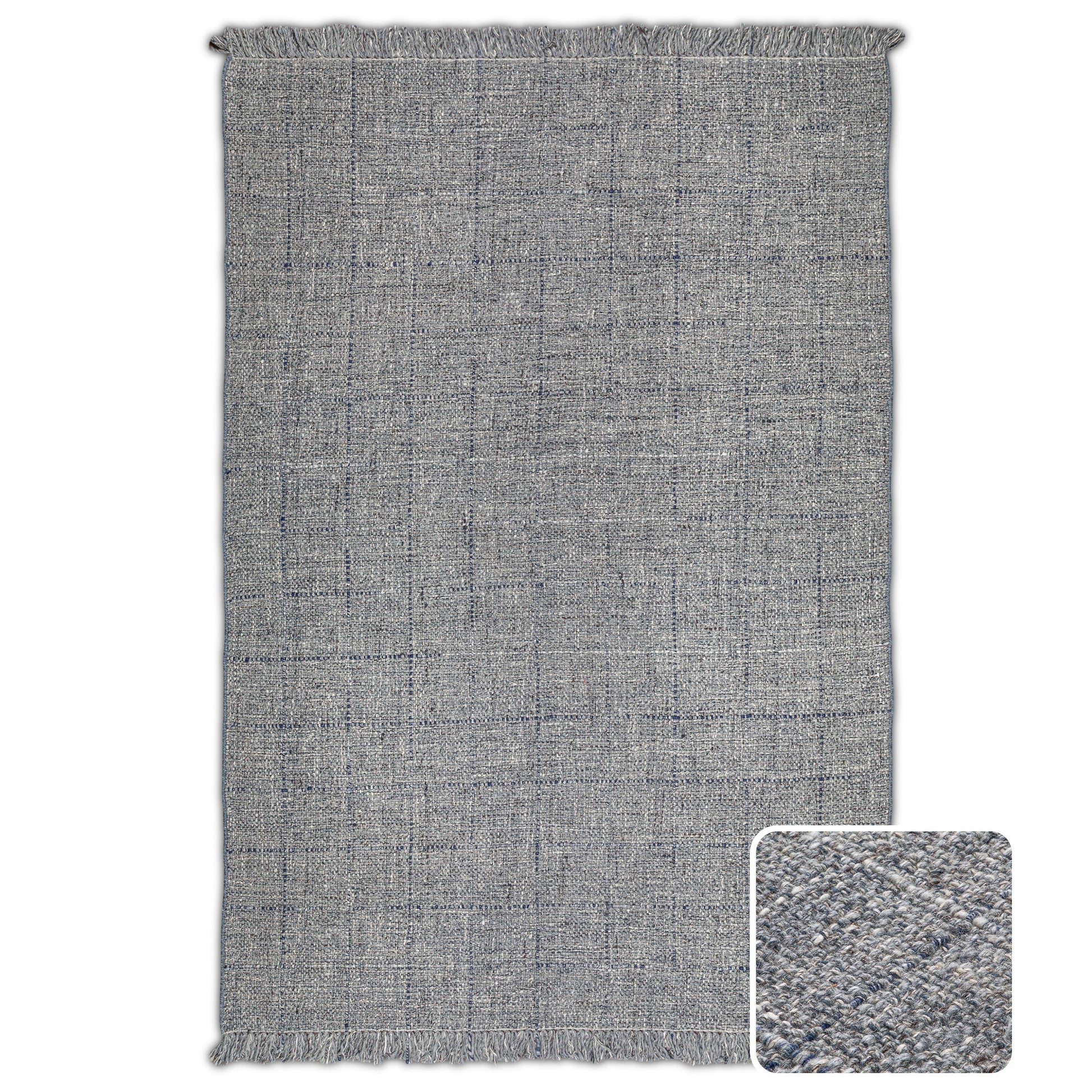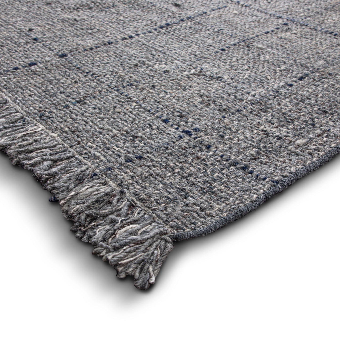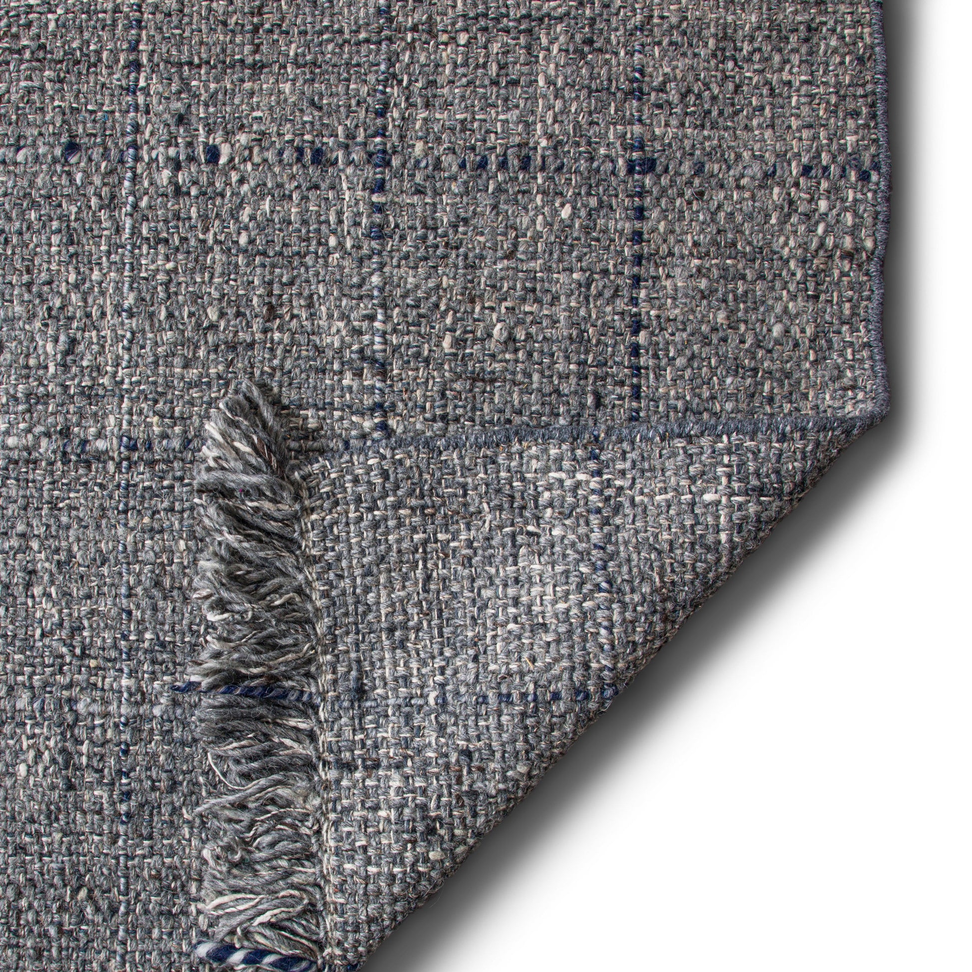 - Detailed with a woven pattern in grey and blue featuring a hand-knotted fringe