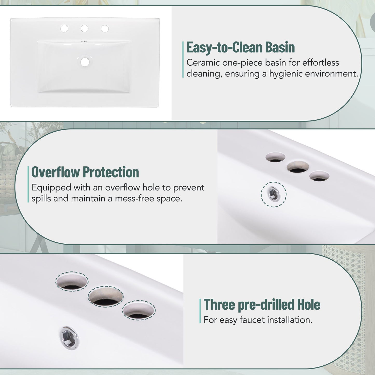 - Stylish Design: This 30-inch transitional bathroom vanity cabinet features golden handles, a white ceramic sink, and clean lines on the cabinet doors and drawers for a unique visual appeal.