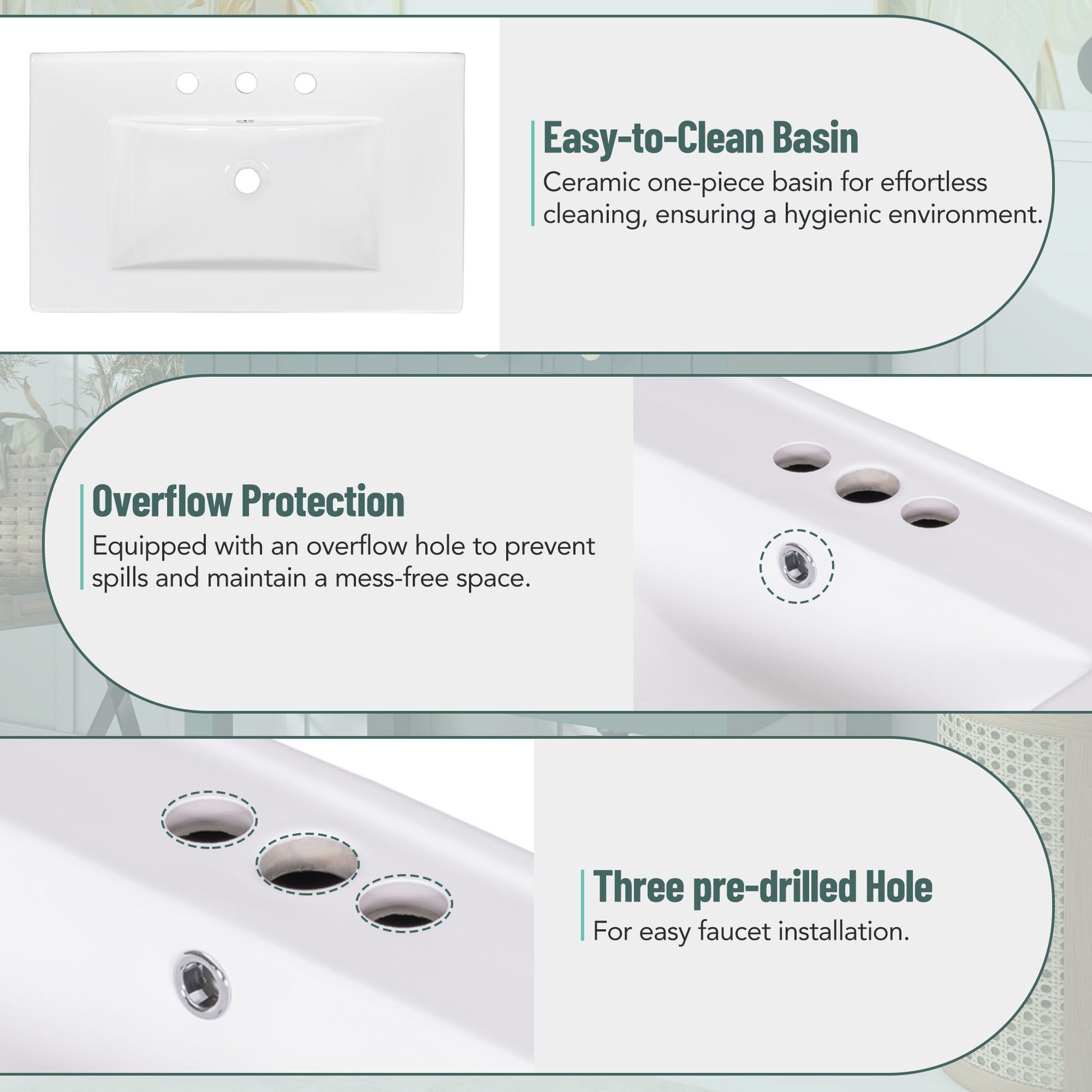 - Ceramic Sink: The inset white ceramic sink maximizes space efficiency and offers a smooth, easy-to-clean surface that resists water stains.