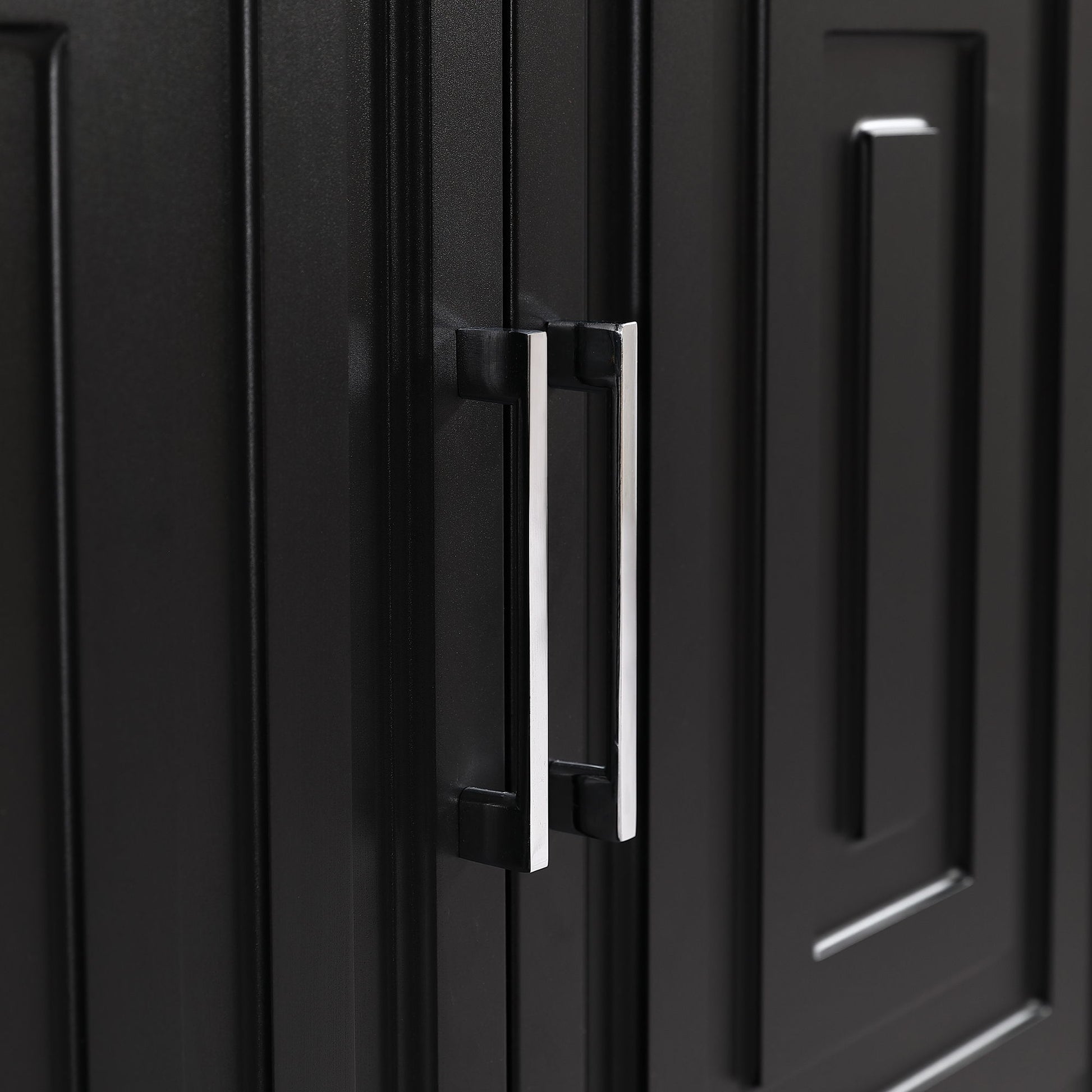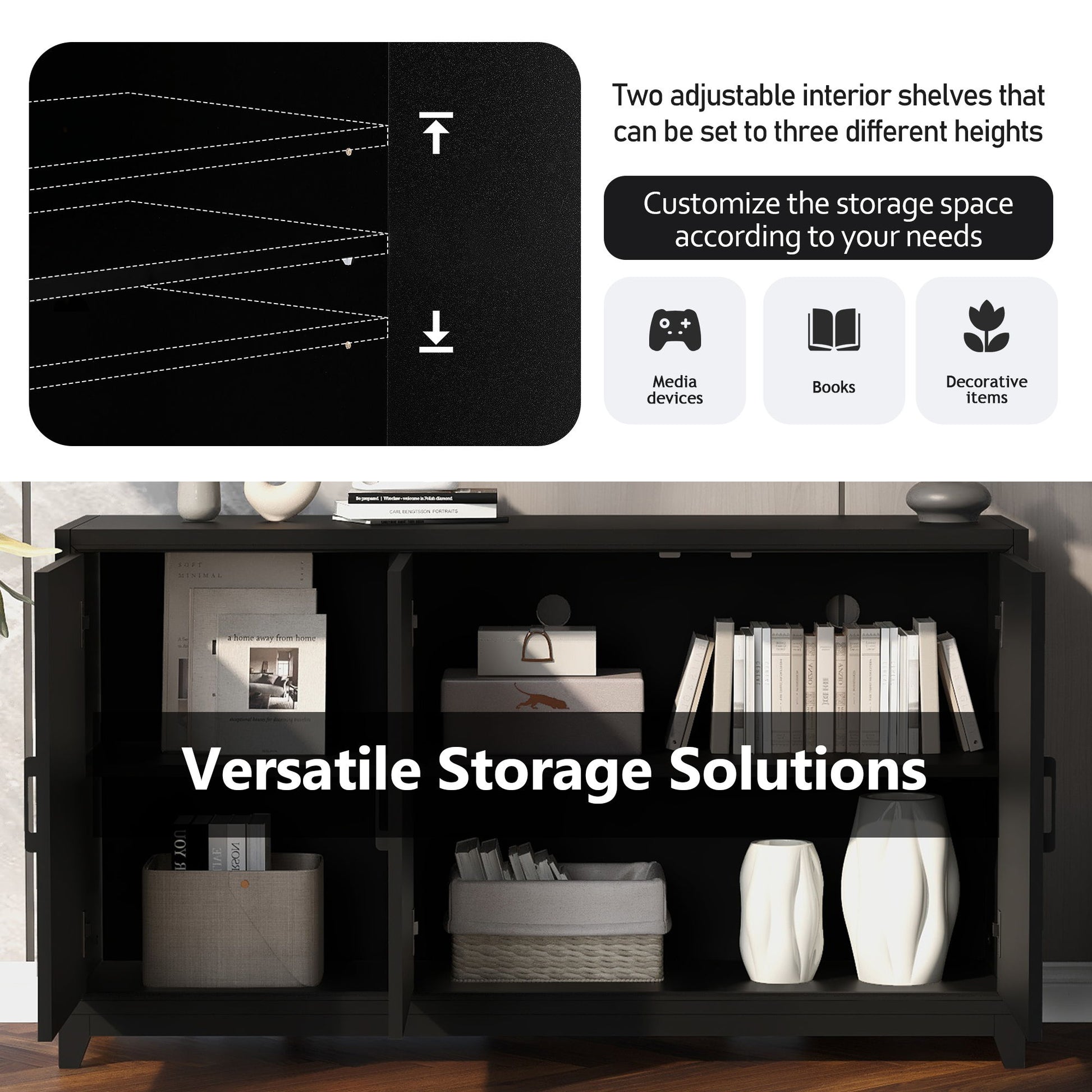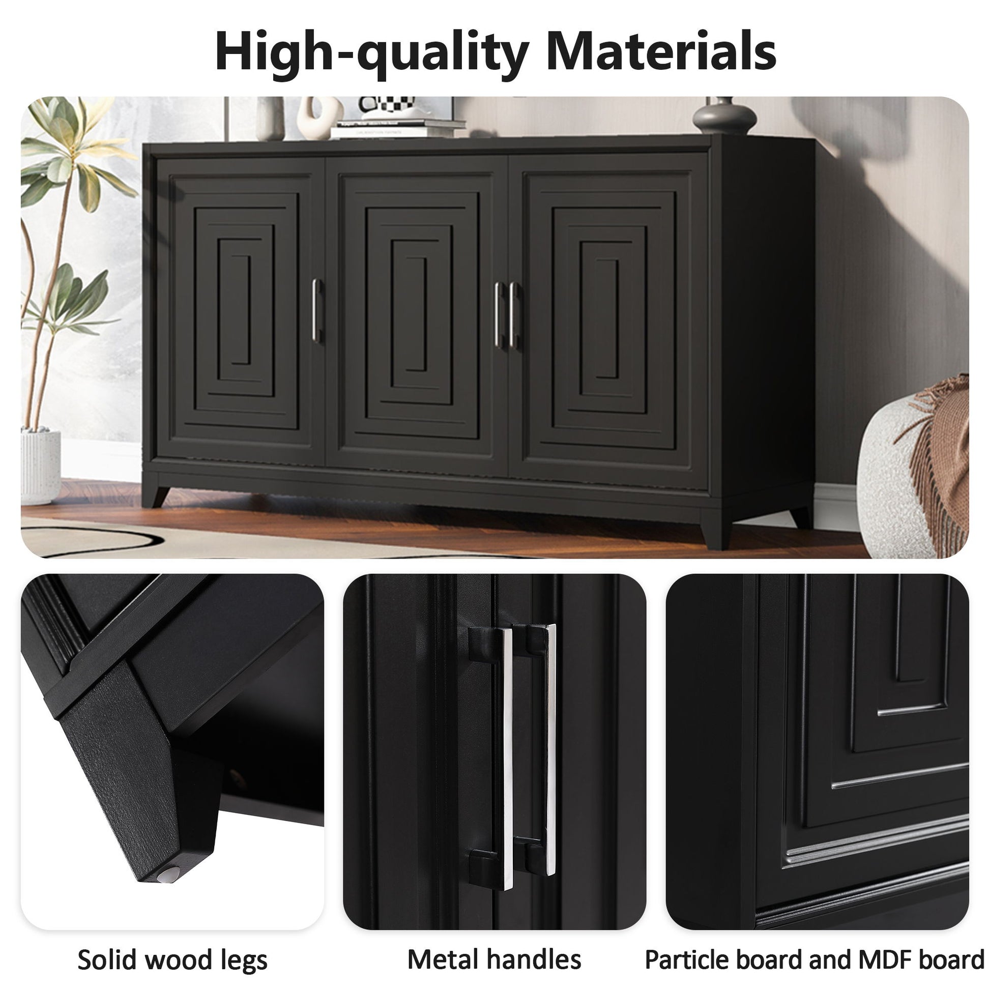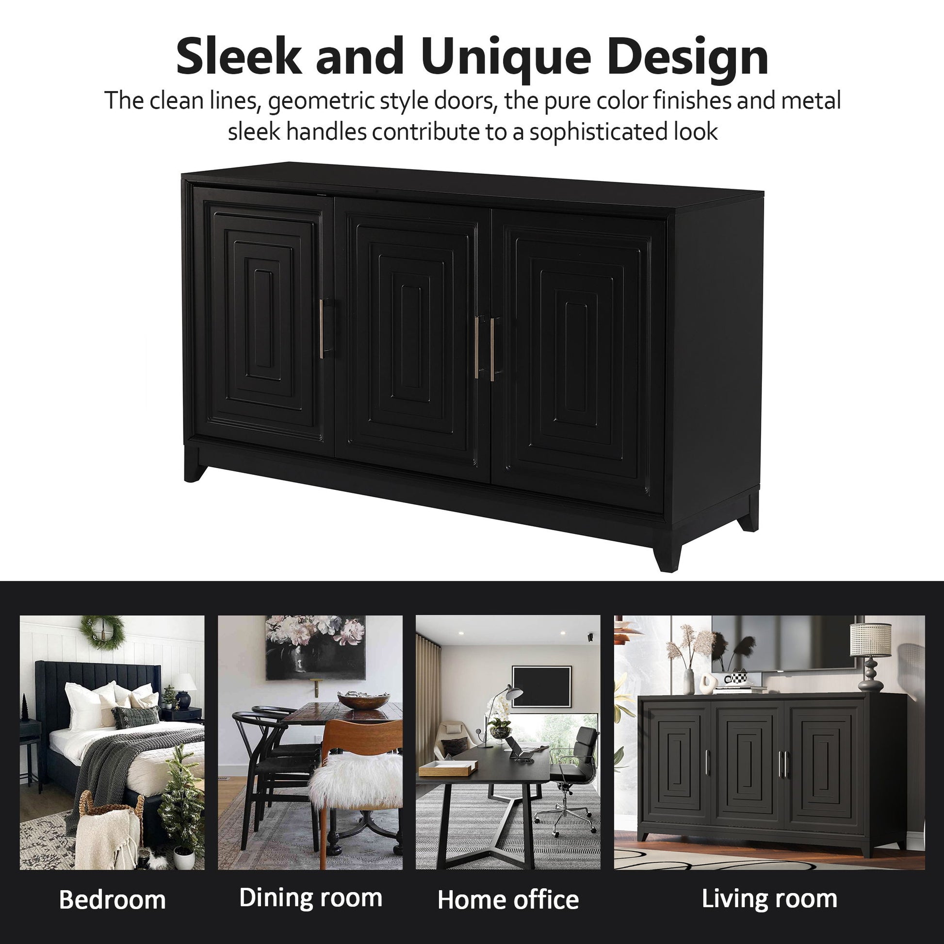 - Stylish and Sturdy: The cabinet boasts geometric doors with sleek metal handles for a functional and stylish touch. Supported by solid wood legs, it can hold a large TV and media equipment securely.