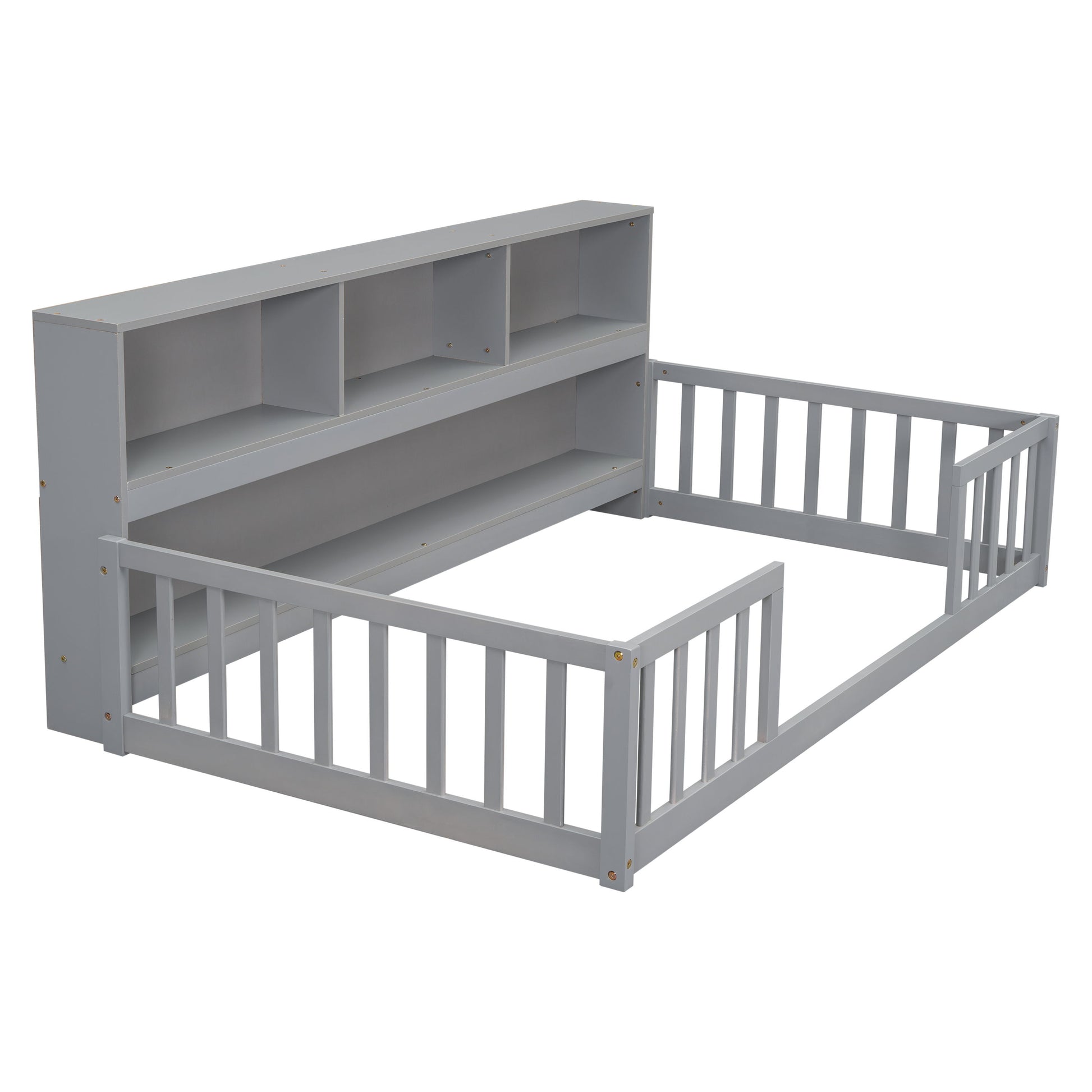 Twin Floor Bed With Bedside Bookcase, Shelves, Guardrails - Gray