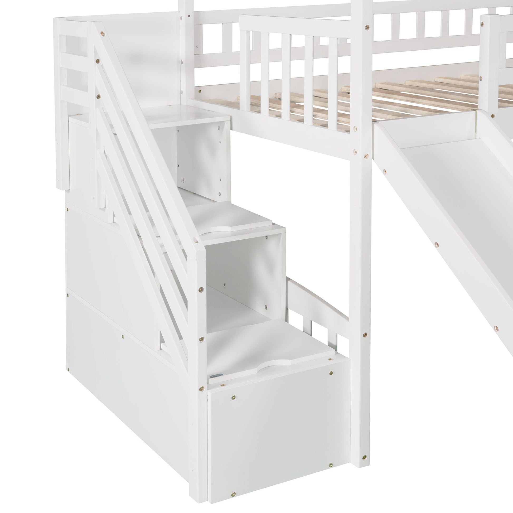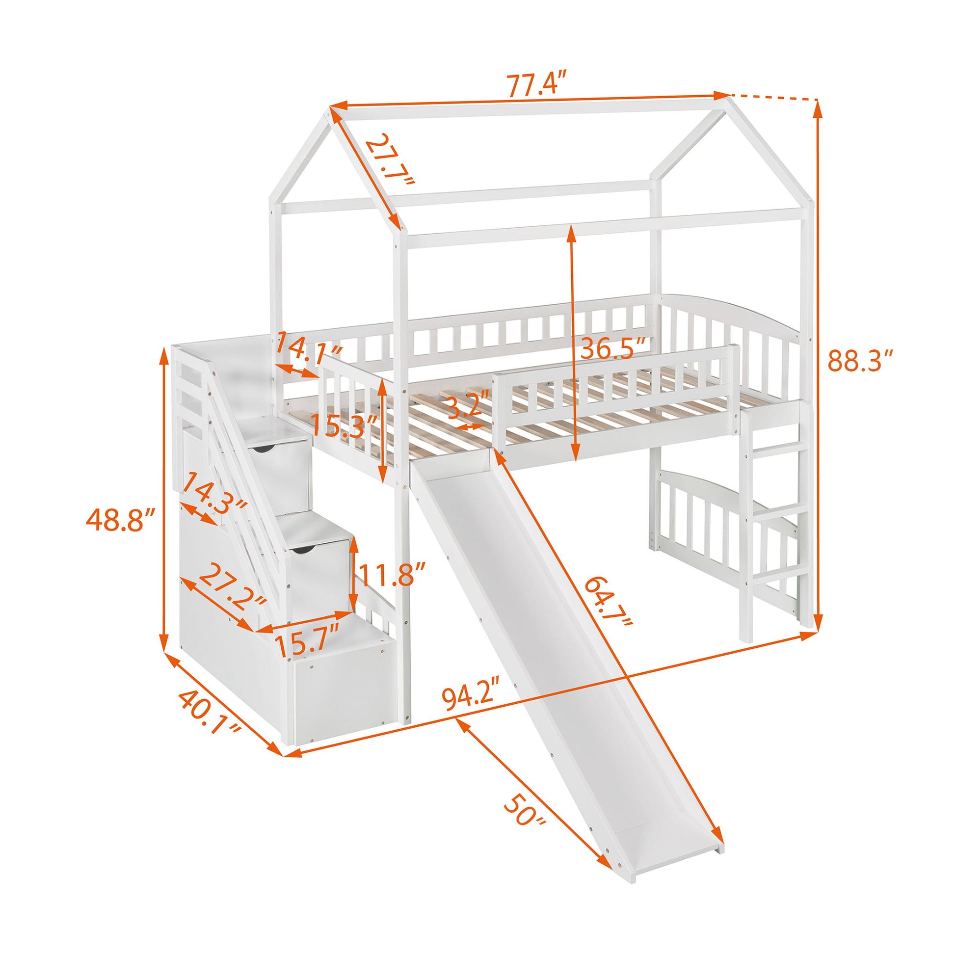 Friendly Design: Crafted with a whimsical playhouse design, this loft bed includes a slide and storage steps, providing both comfort and excitement. Perfect for hours of entertainment and relaxation, it sparks imagination and becomes the perfect centerpiece for any bedroom.