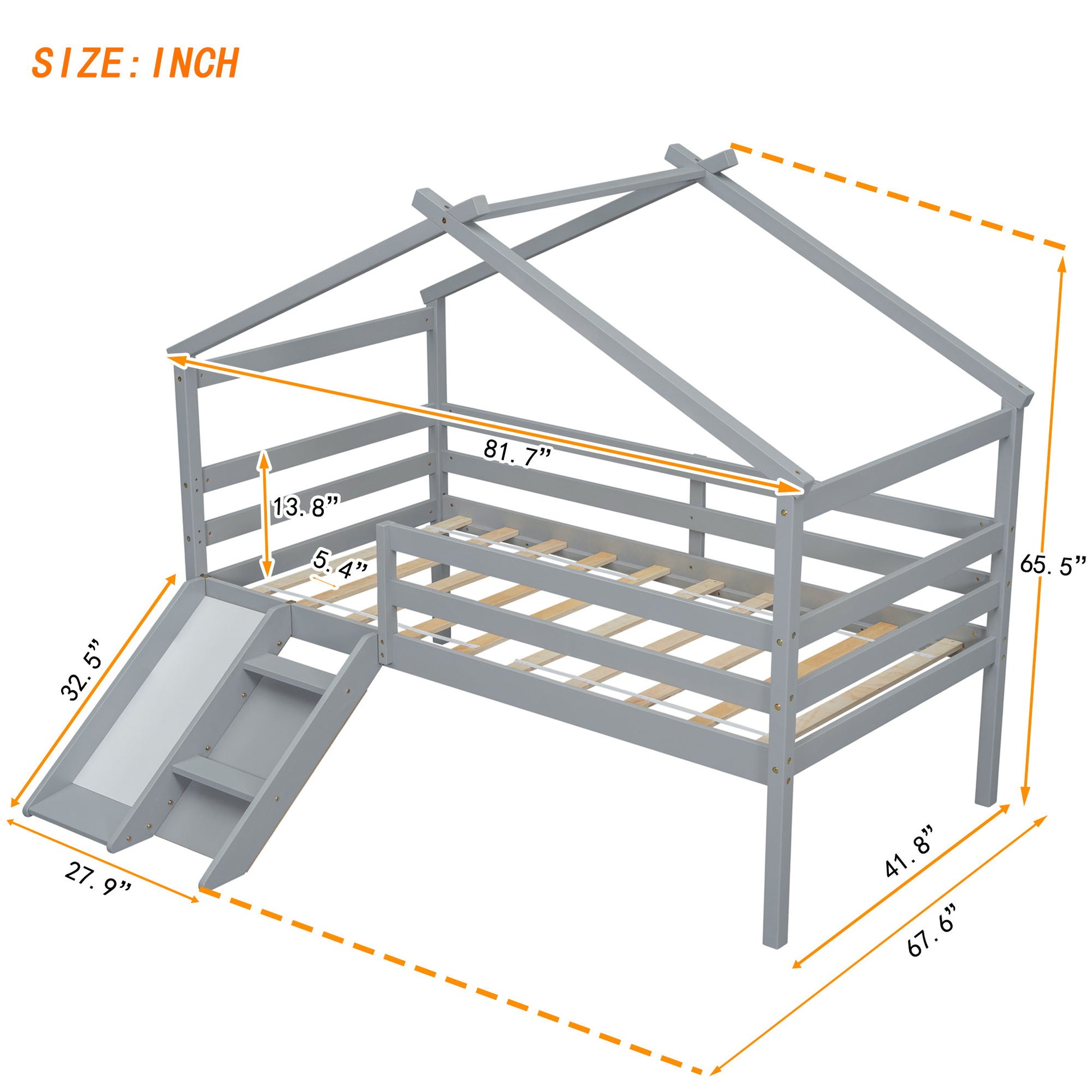 Twin Low Loft House Bed With Slide, Ladder, Safety Guardrails, House Roof Frame - Gray