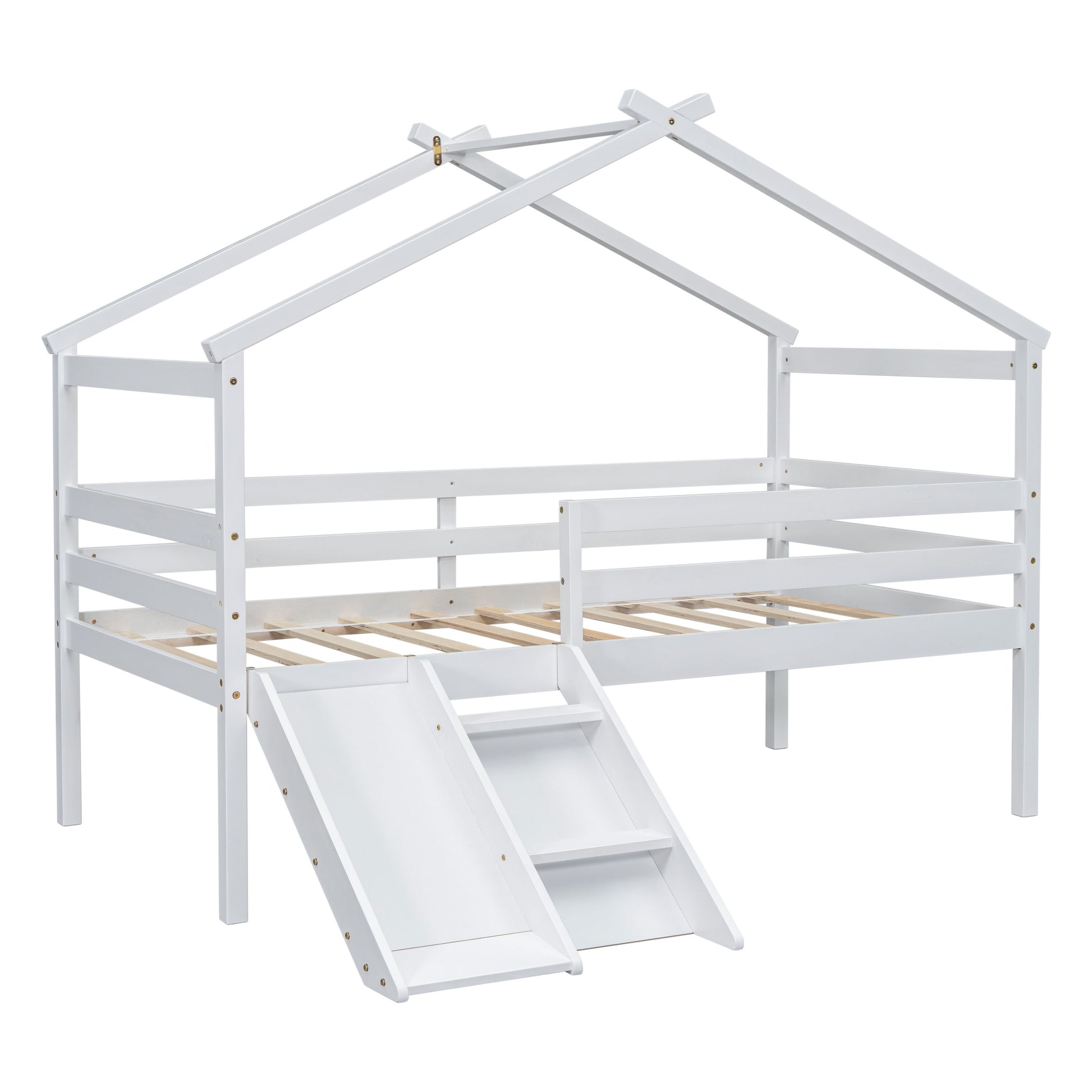 Twin Low Loft House Bed With Slide, Ladder, Safety Guardrails, House Roof Frame - White
