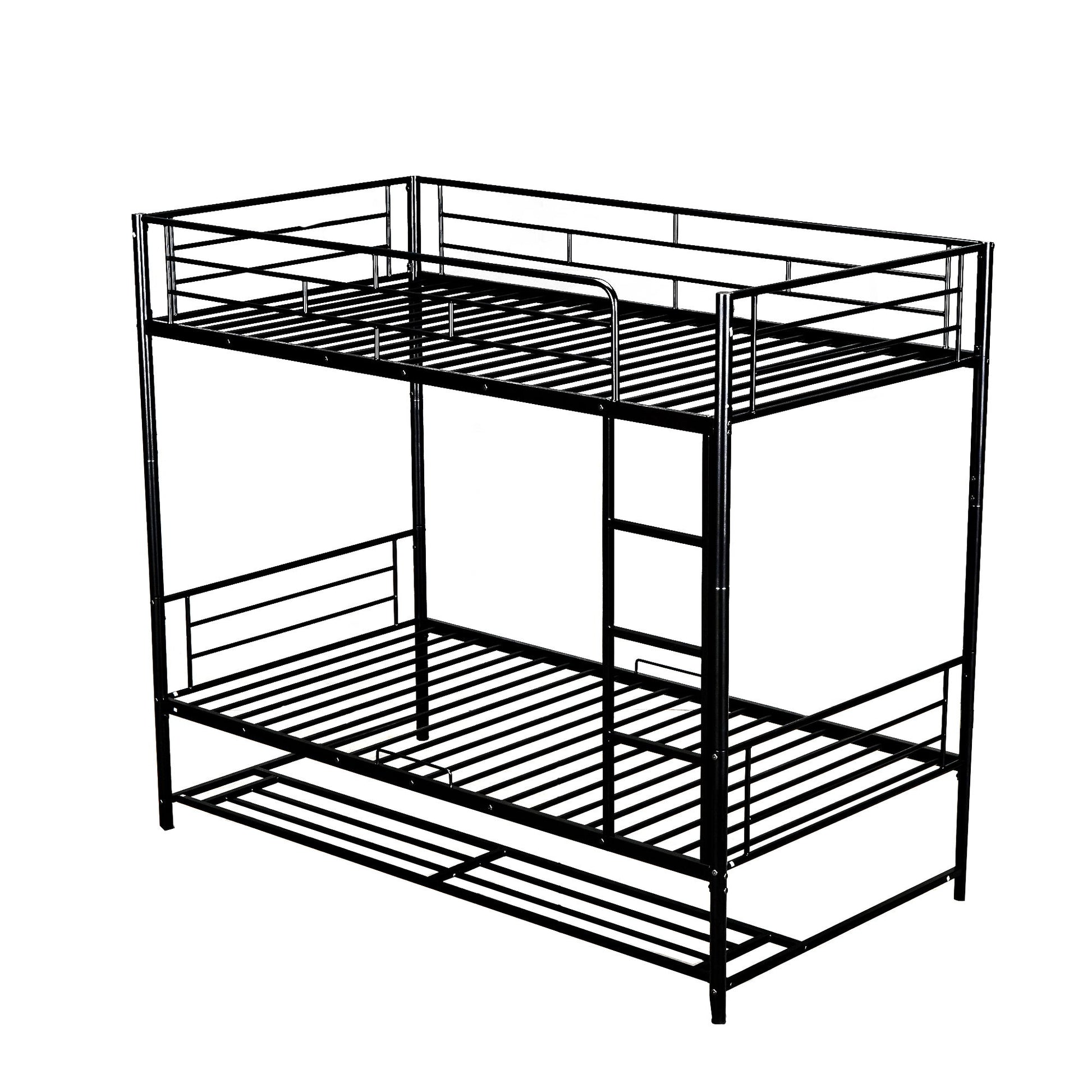This twin over twin metal bunk bed is made with sturdy metal and has a clean-cut silhouette that can be matched with any room decor. Designed with safety in mind, this bunk bed comes with a ladder integrated into the frame that is easy to climb up and down. With a practical design, this versatile bunk bed can be separated into two twin beds to meet your different needs.The shelf underneath the bunk bed creates extra space for you to stock shoes, boxes, toys or any small items you like. Some assembly is required, and the bed will definitely be assembled conveniently.