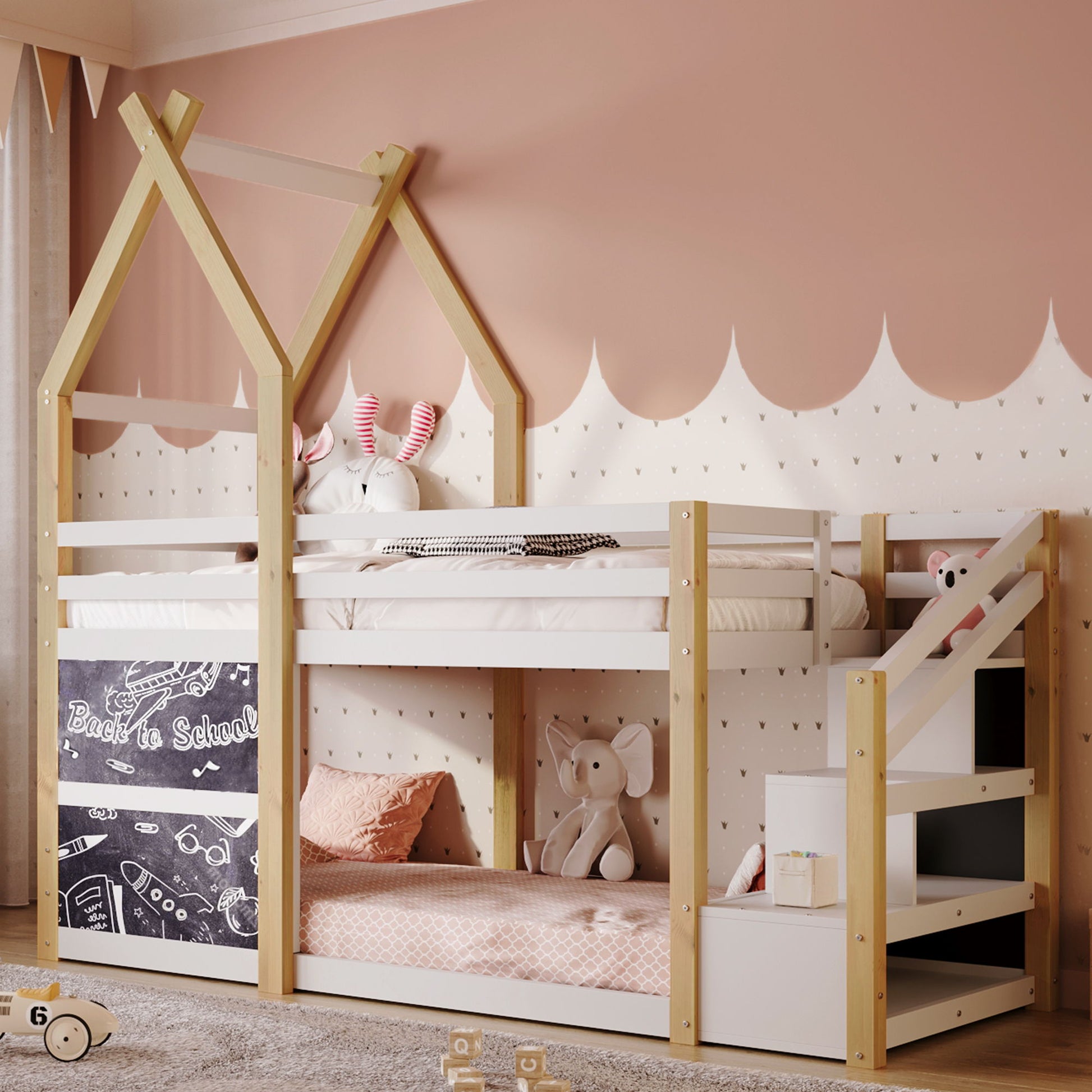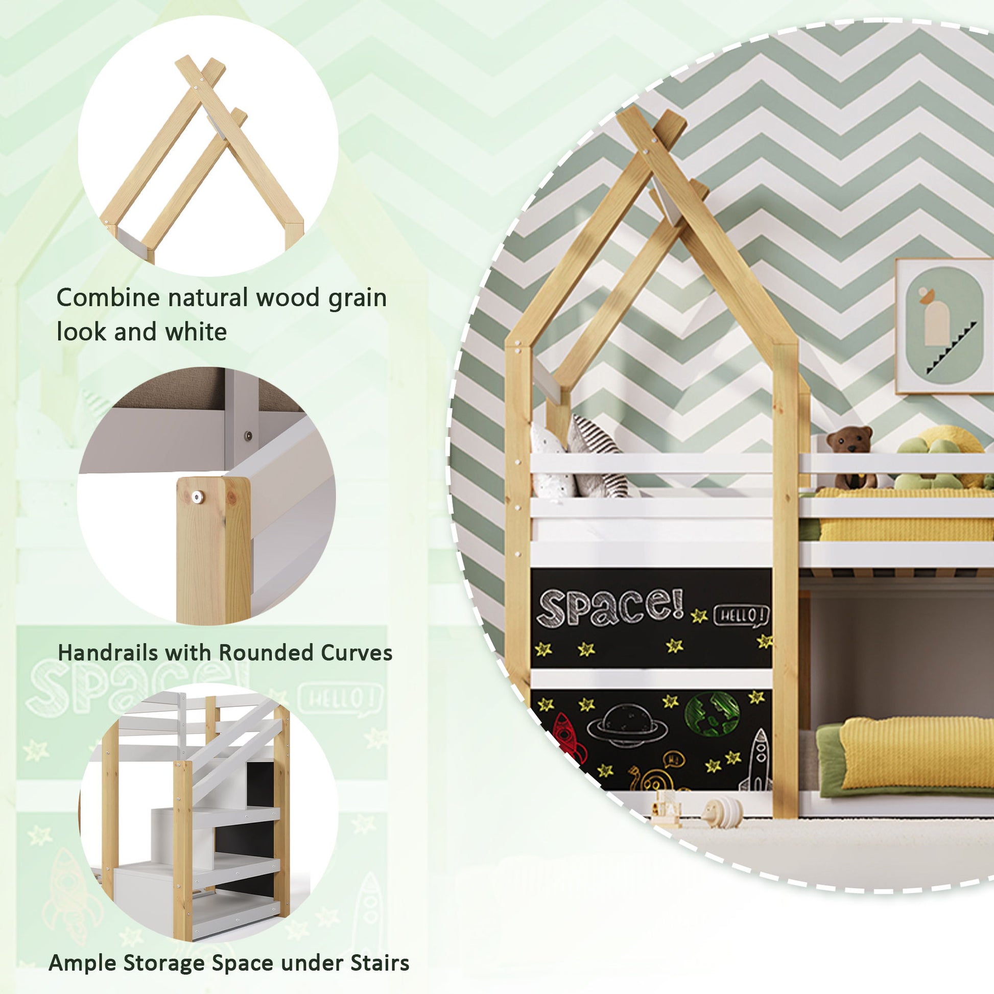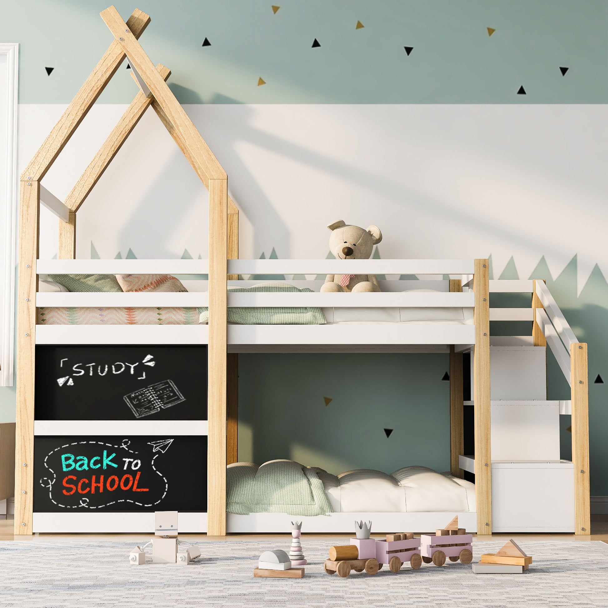 Twin Over Twin House Bunk Bed With White Storage Staircase And 2 Blackboards - White / Natural