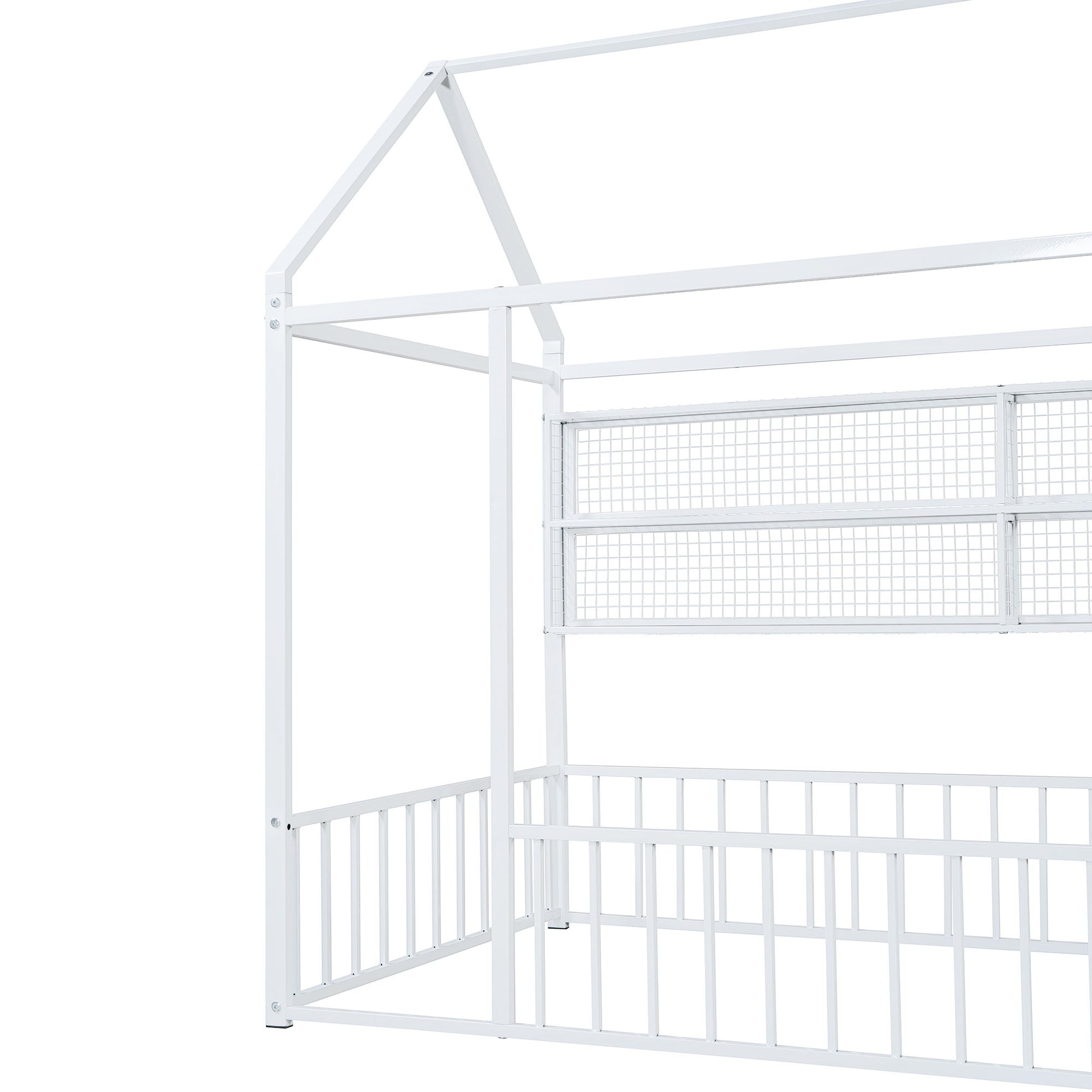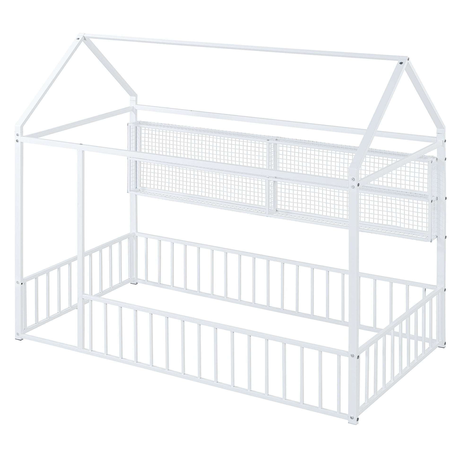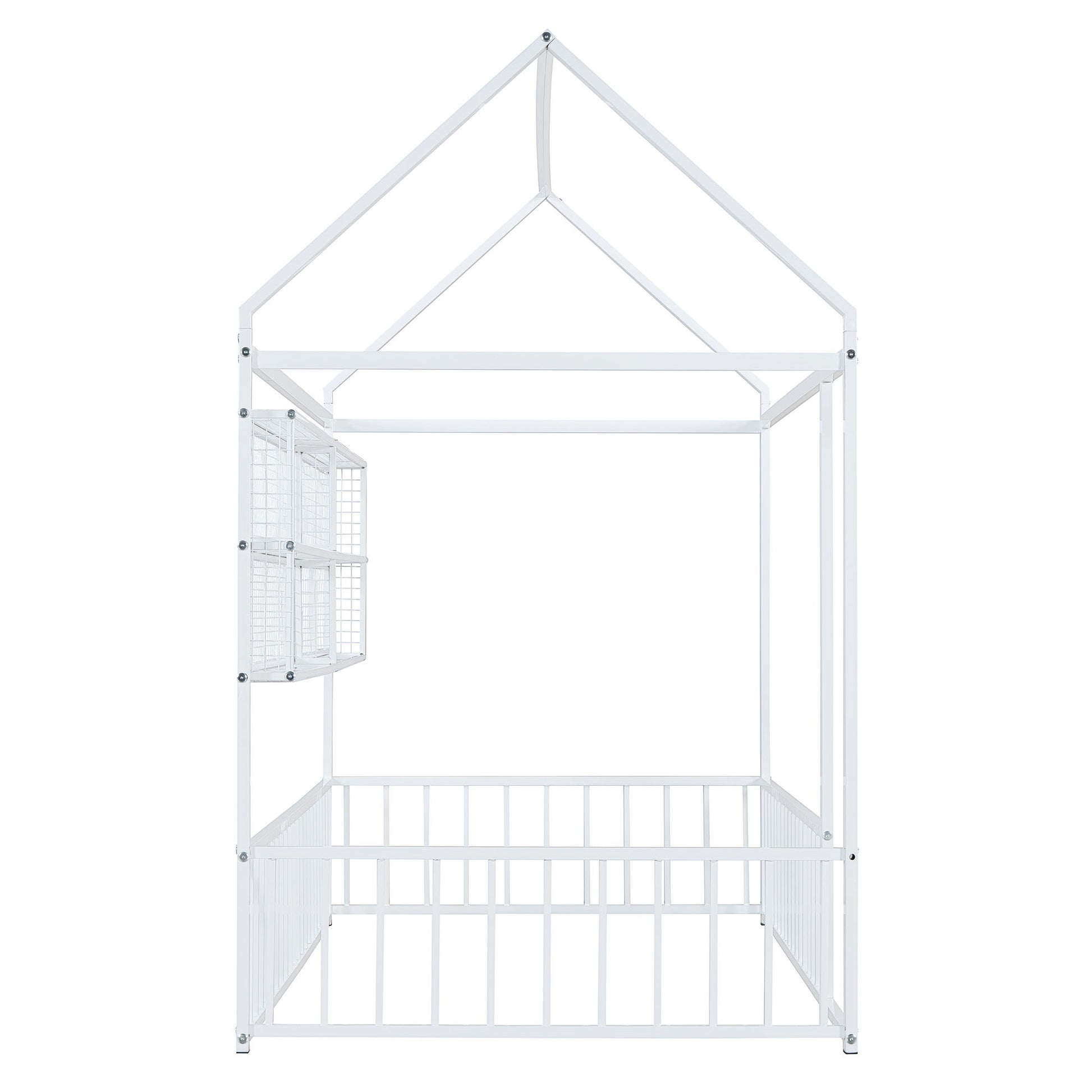 This stylish metal bed frame features a unique house-shaped design, adding a playful yet modern touch to any bedroom. With sturdy metal construction, it ensures long-lasting durability and a secure night's sleep. The back of the bed is equipped with four convenient metal grid shelves, providing extra storage for your essentials while maximizing space. This bed frame blends functionality with a whimsical design, making it a standout piece in any room.