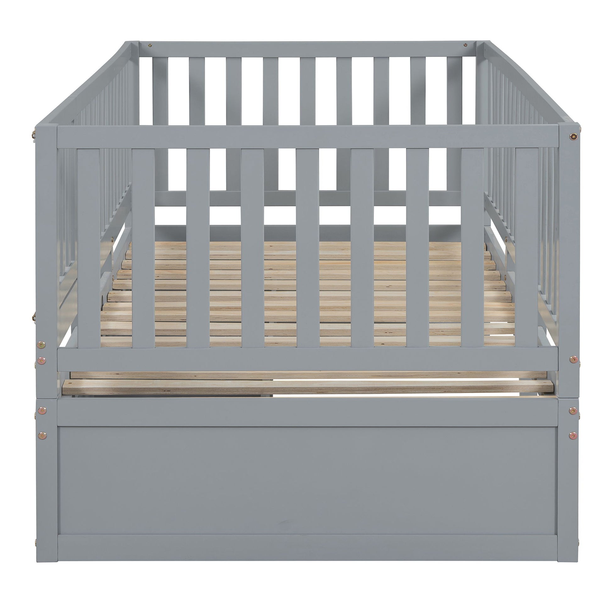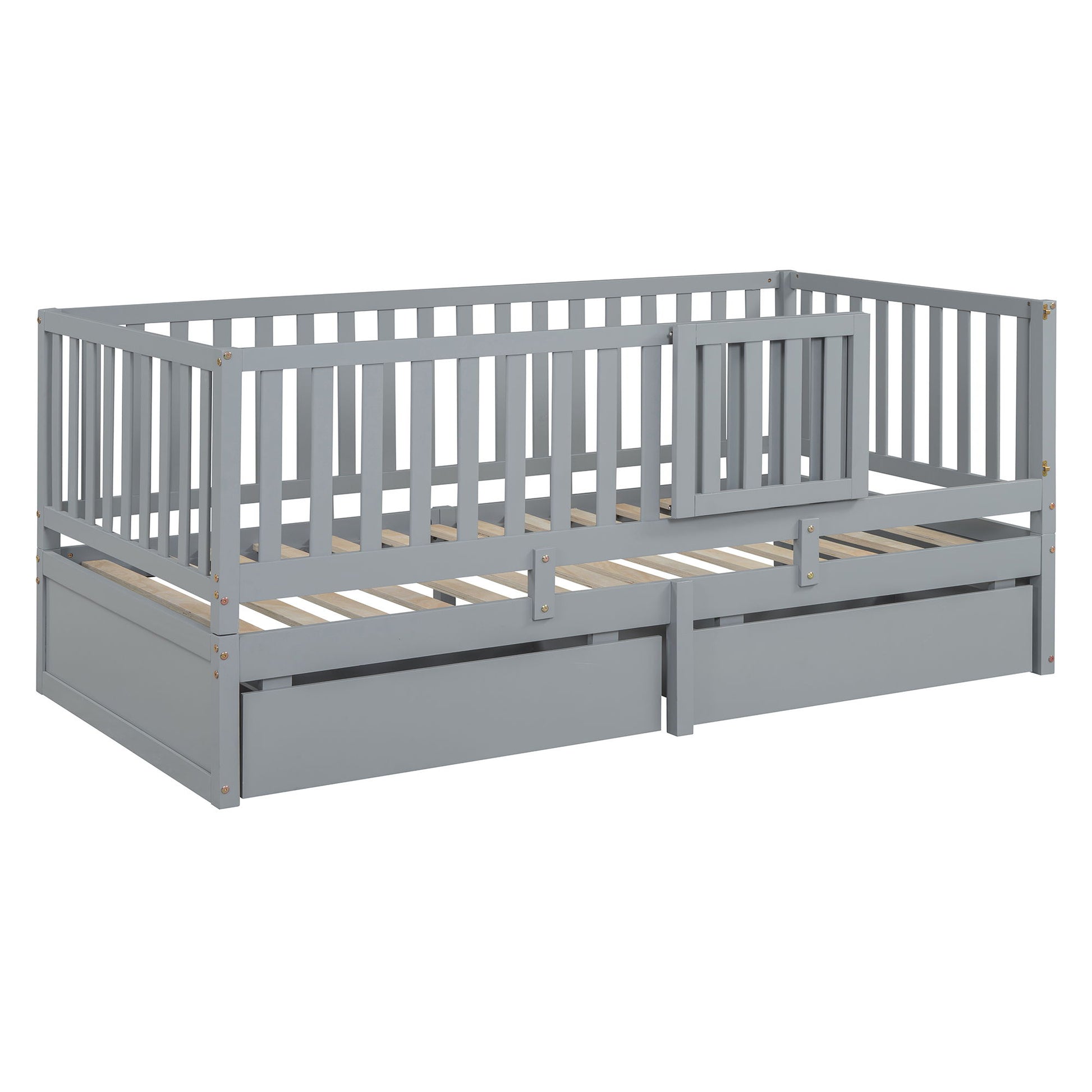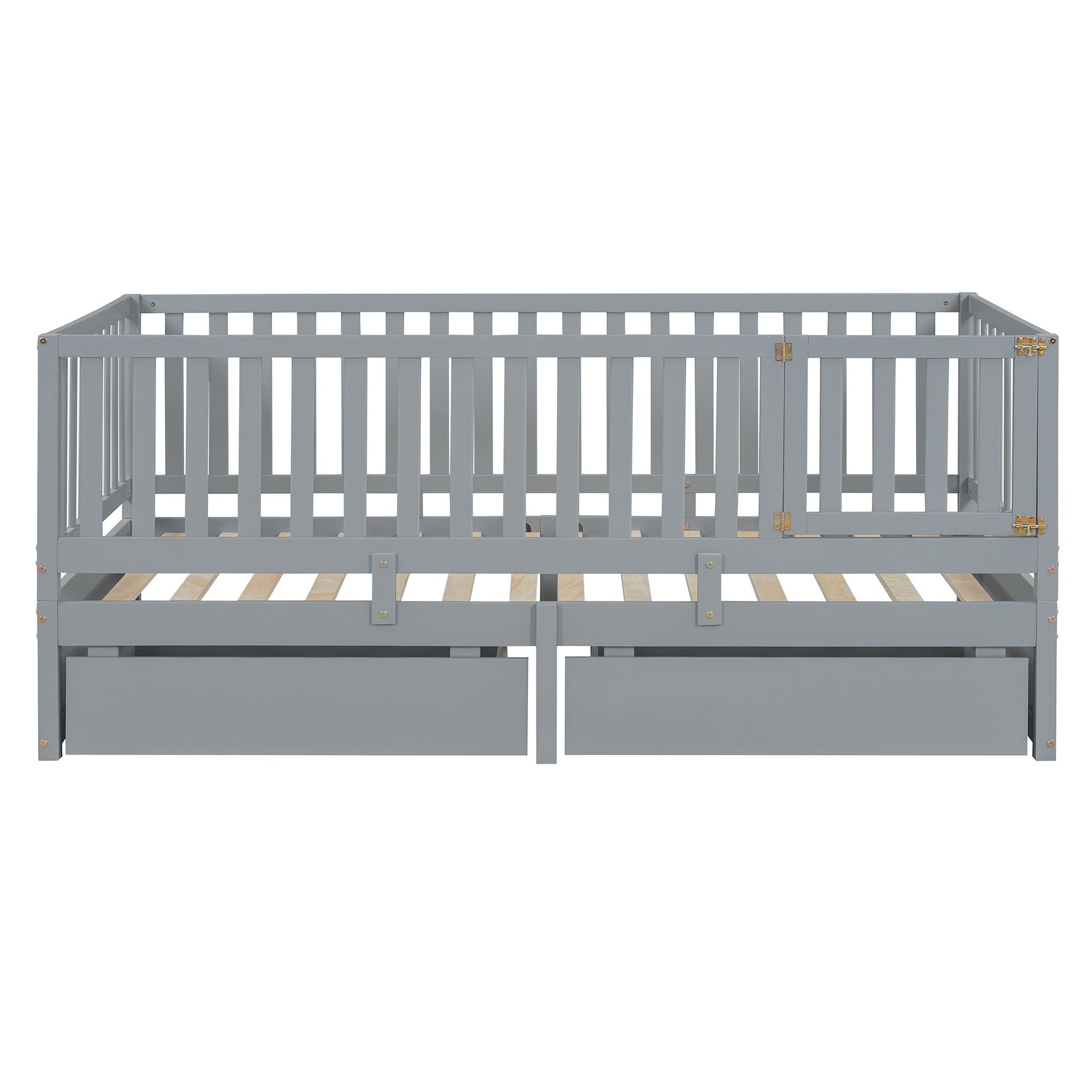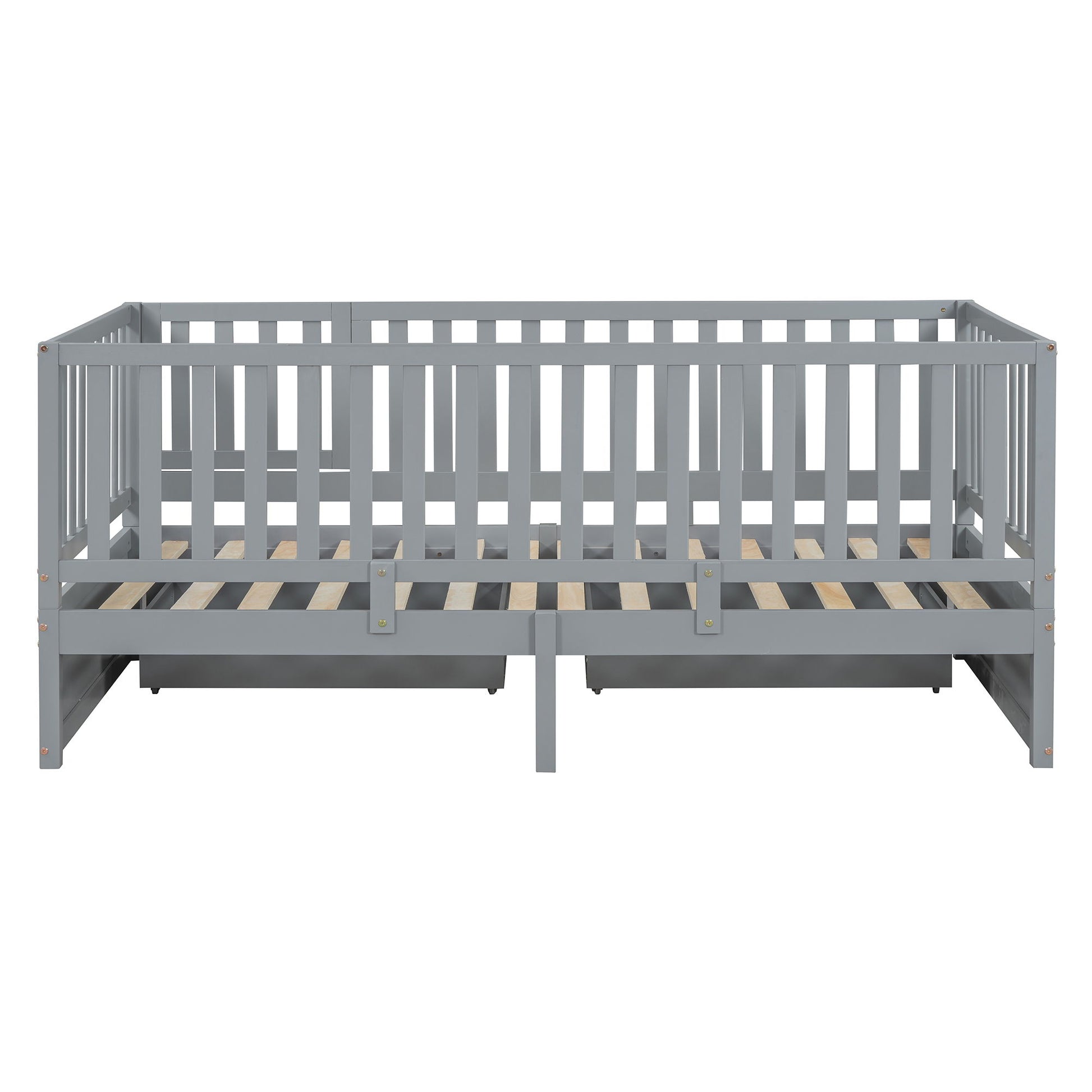 Twin Size Daybed With Fence Guardrails And 2 Drawers, Split Into Independent Floor Bed & Daybed - Gray