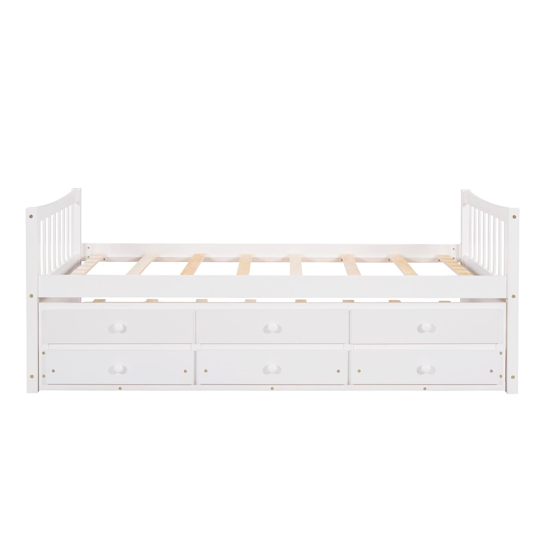 If you need extra sleeping space or your kids love sleepovers, this daybed with handy pull-out trundle and three drawers is perfect for your home. High-quality, solid and a strong, durable frame ensures stability and durability for long-term use. Slat kit included so box springs are not required. This daybed is designed with a clean silhouette and a hue of elegance. It suits all styles of home decoration, and completes the look of any bedroom.