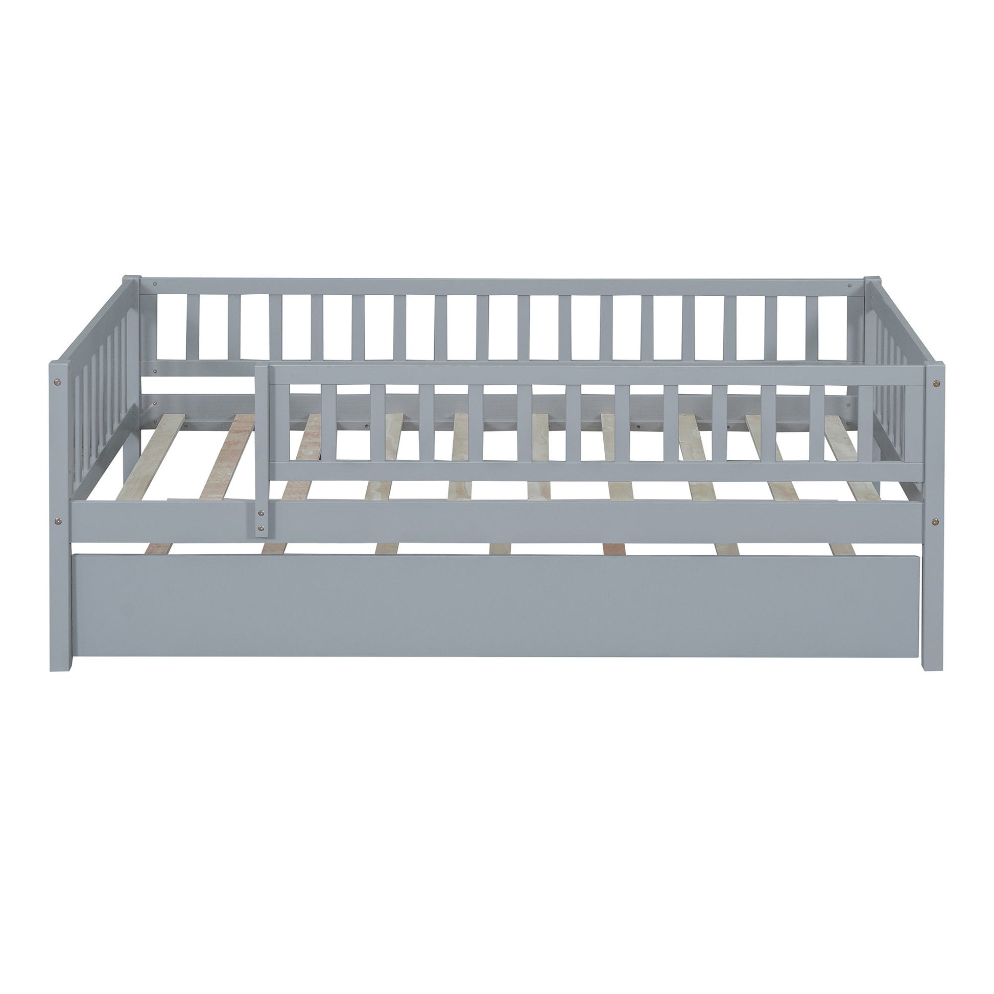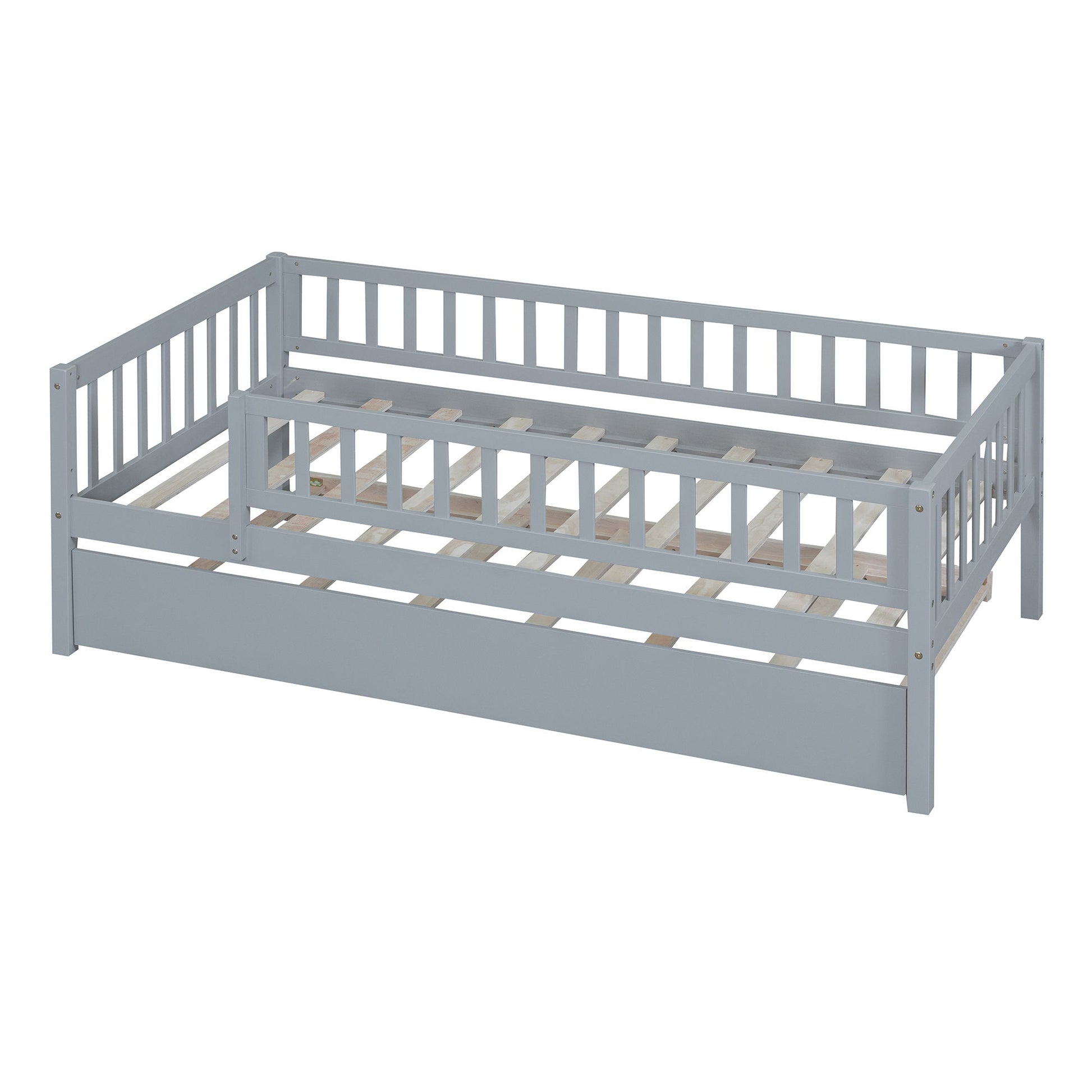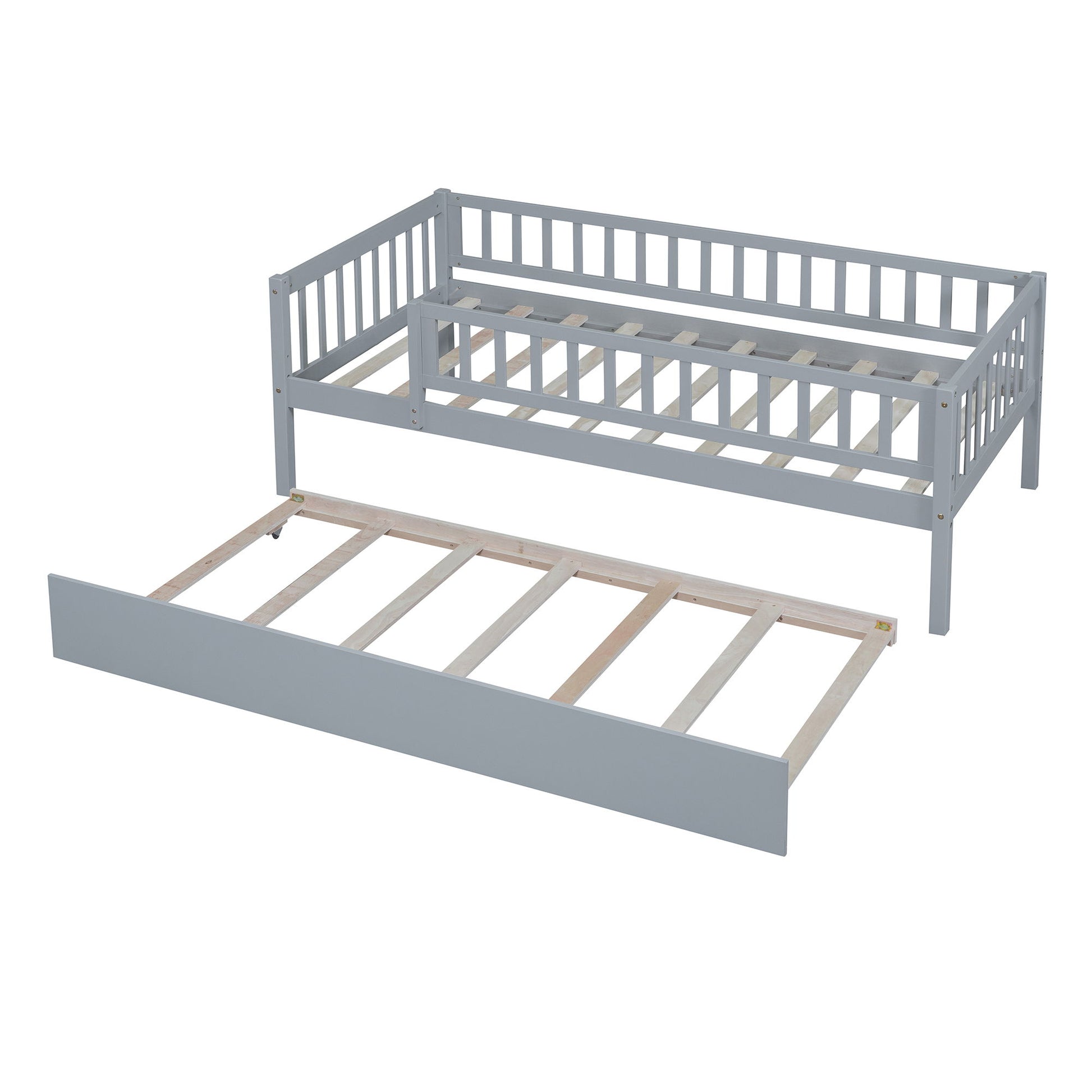 Twin Size Daybed With Trundle And Fence Guardrails - Gray