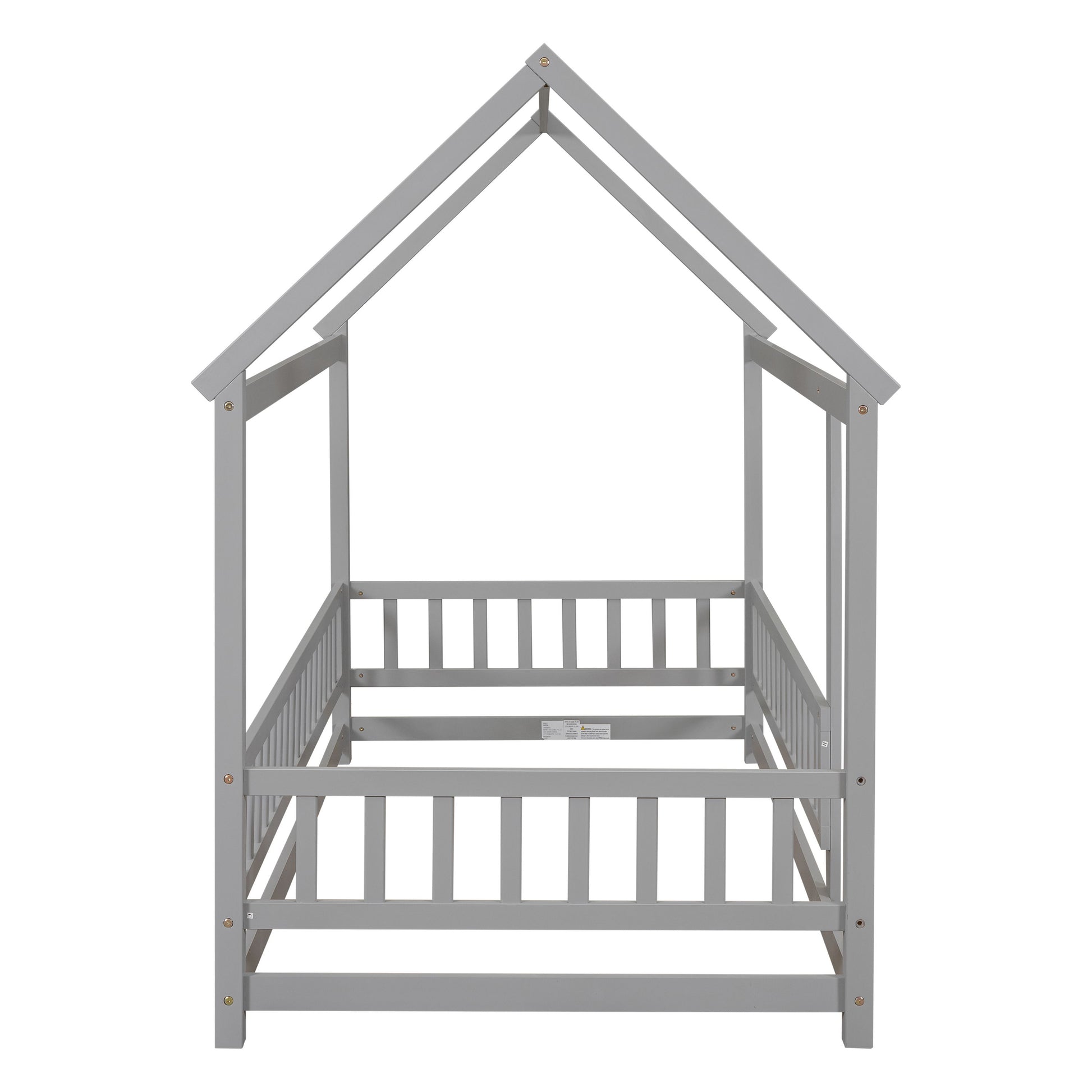 Twin Size Floor Wooden Bed With House Roof Frame, Fence Guardrails - Gray