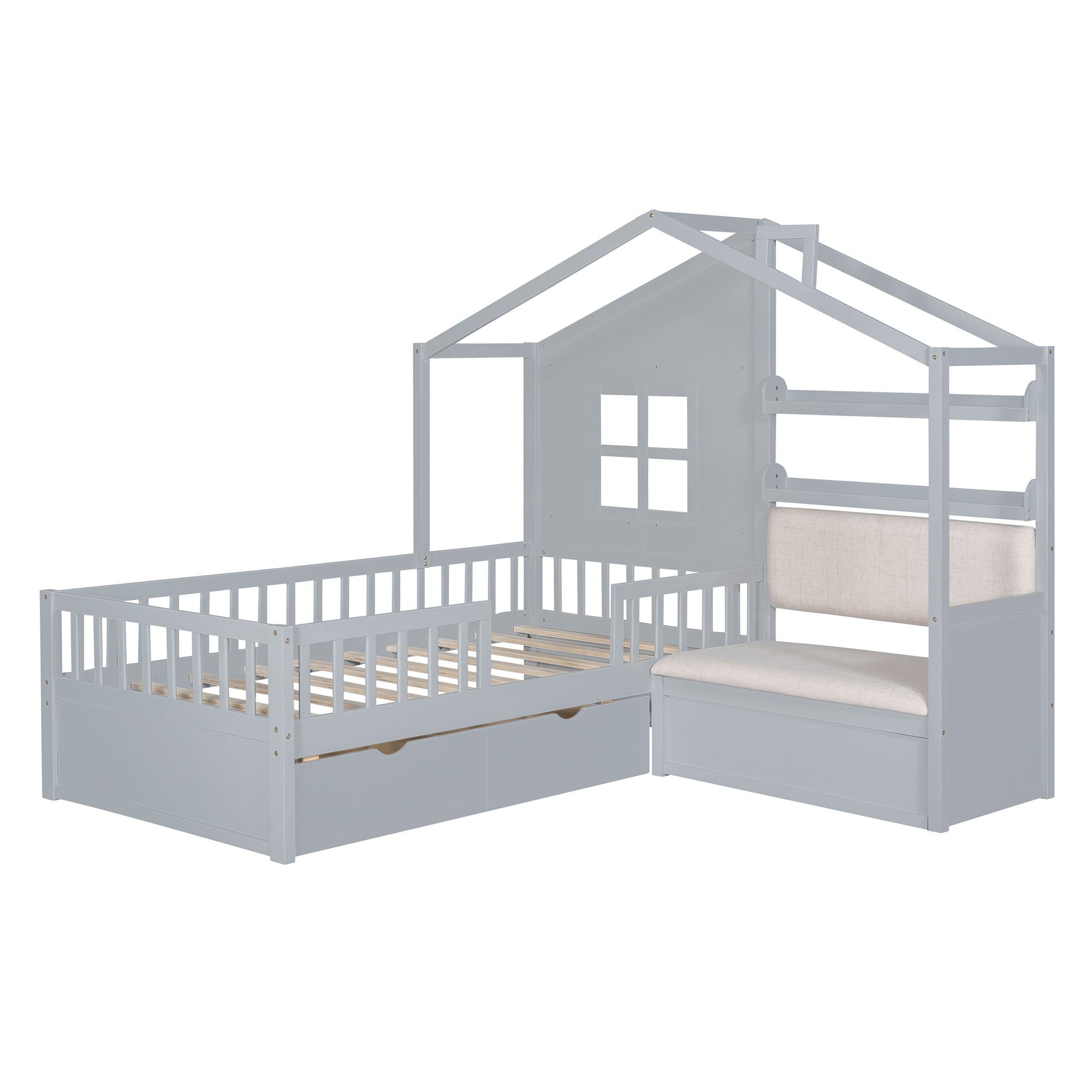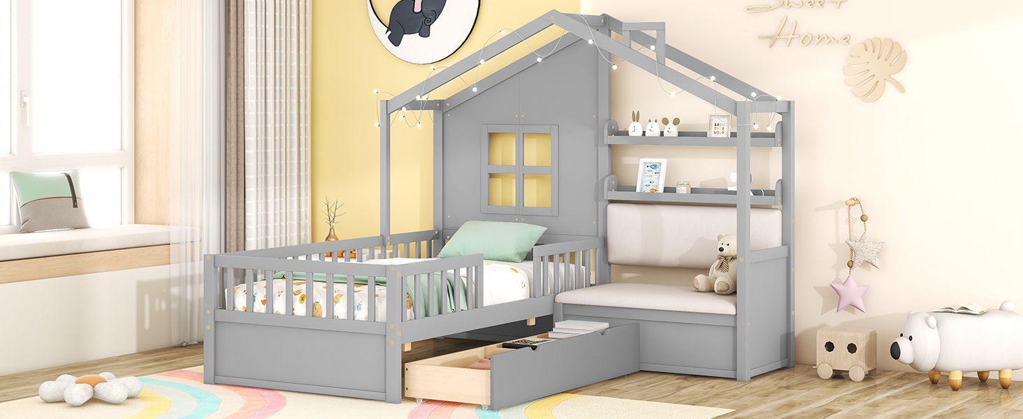 Twin Size House Bed With Sofa, Kids Platform Bed With 2 Drawers And Storage Shelf - Gray