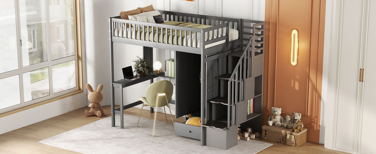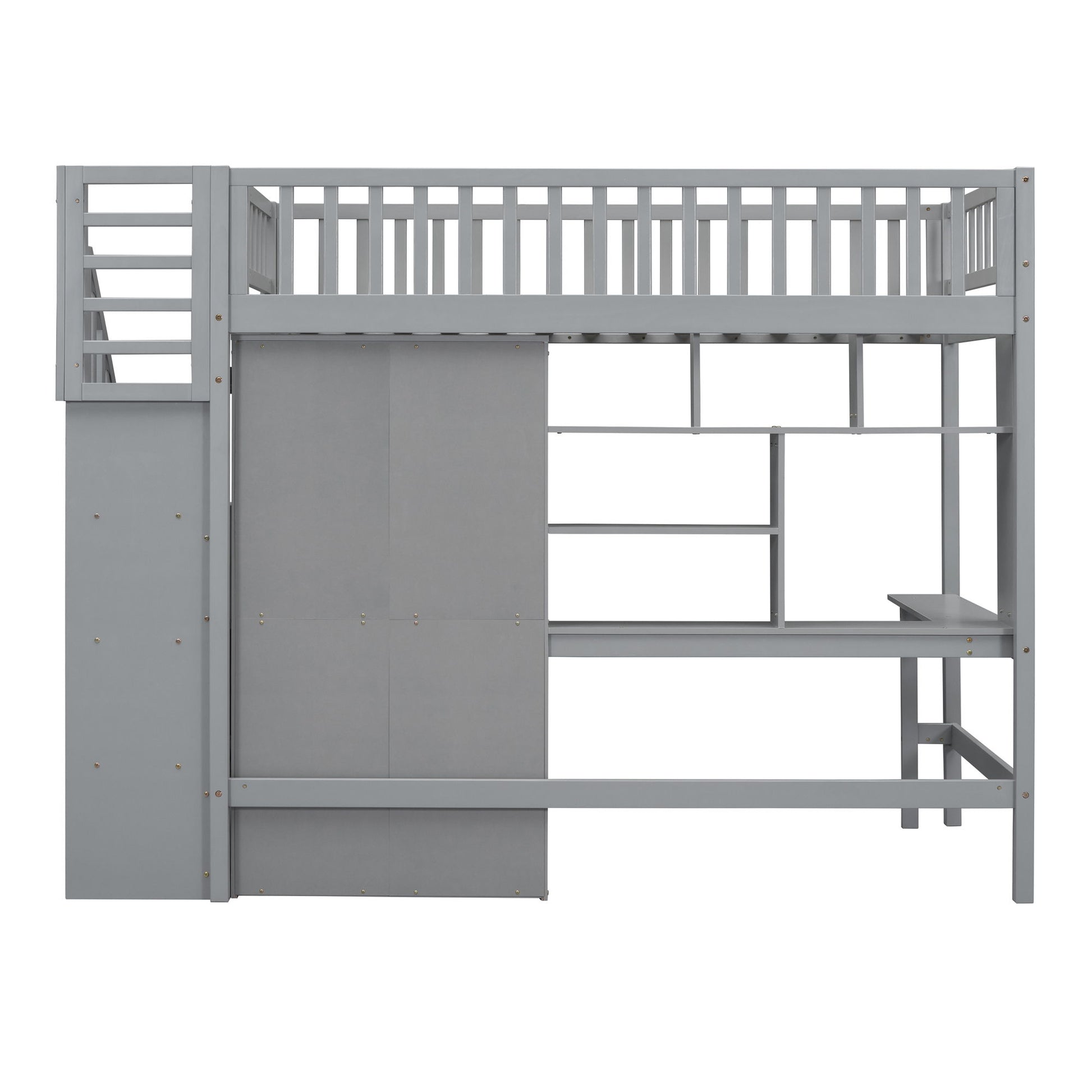 Twin Size Loft Bed With Bookshelf, Drawers, Desk, And Wardrobe - Gray