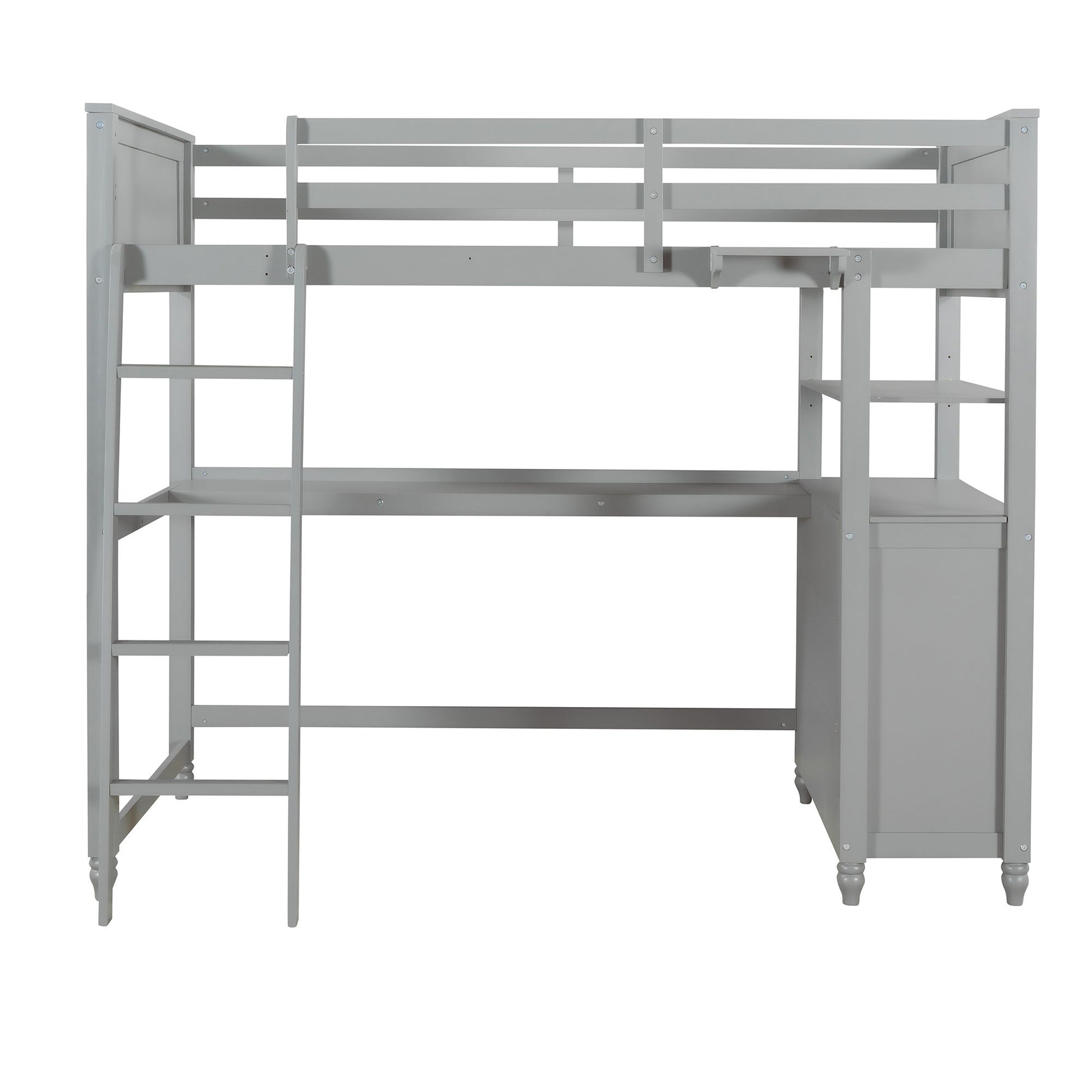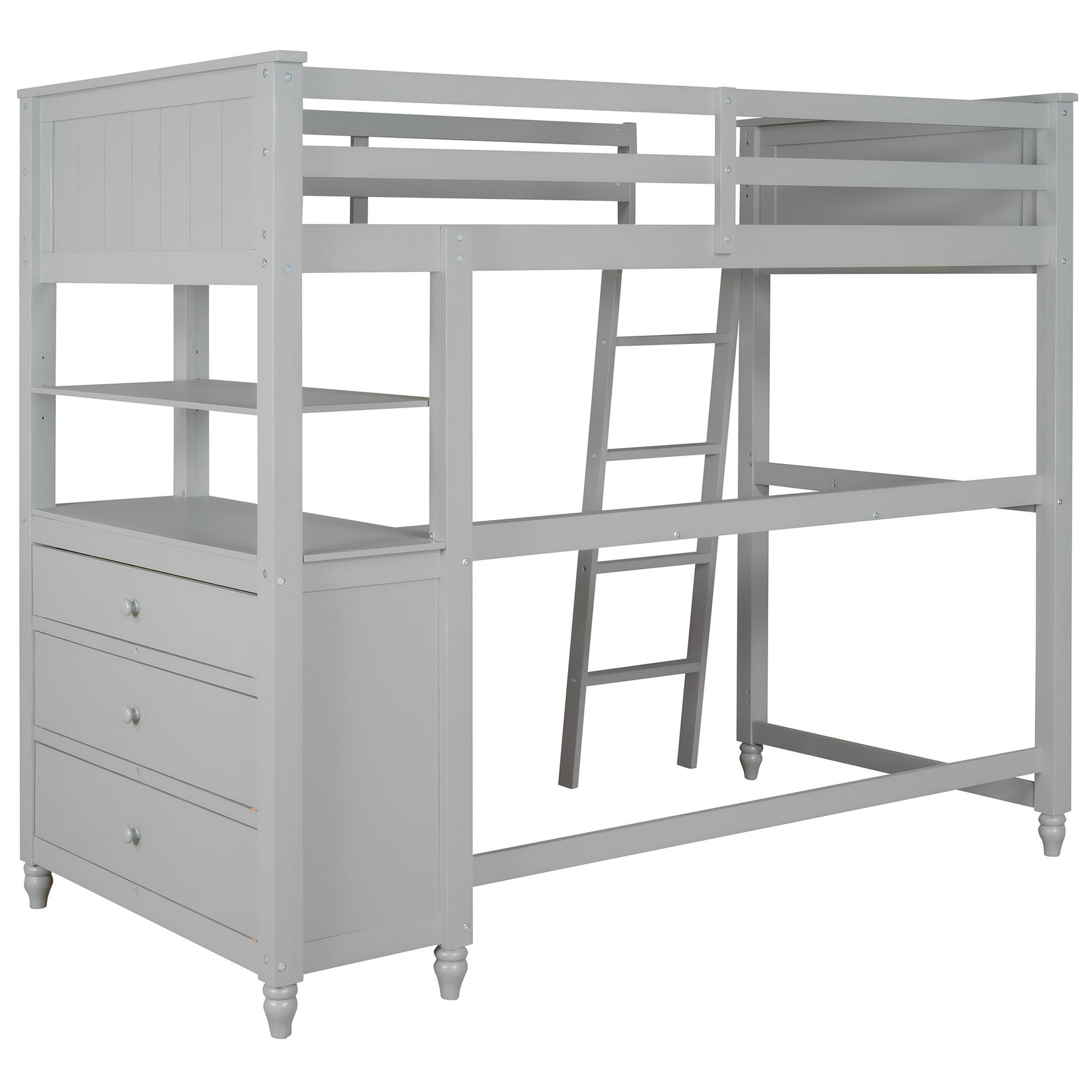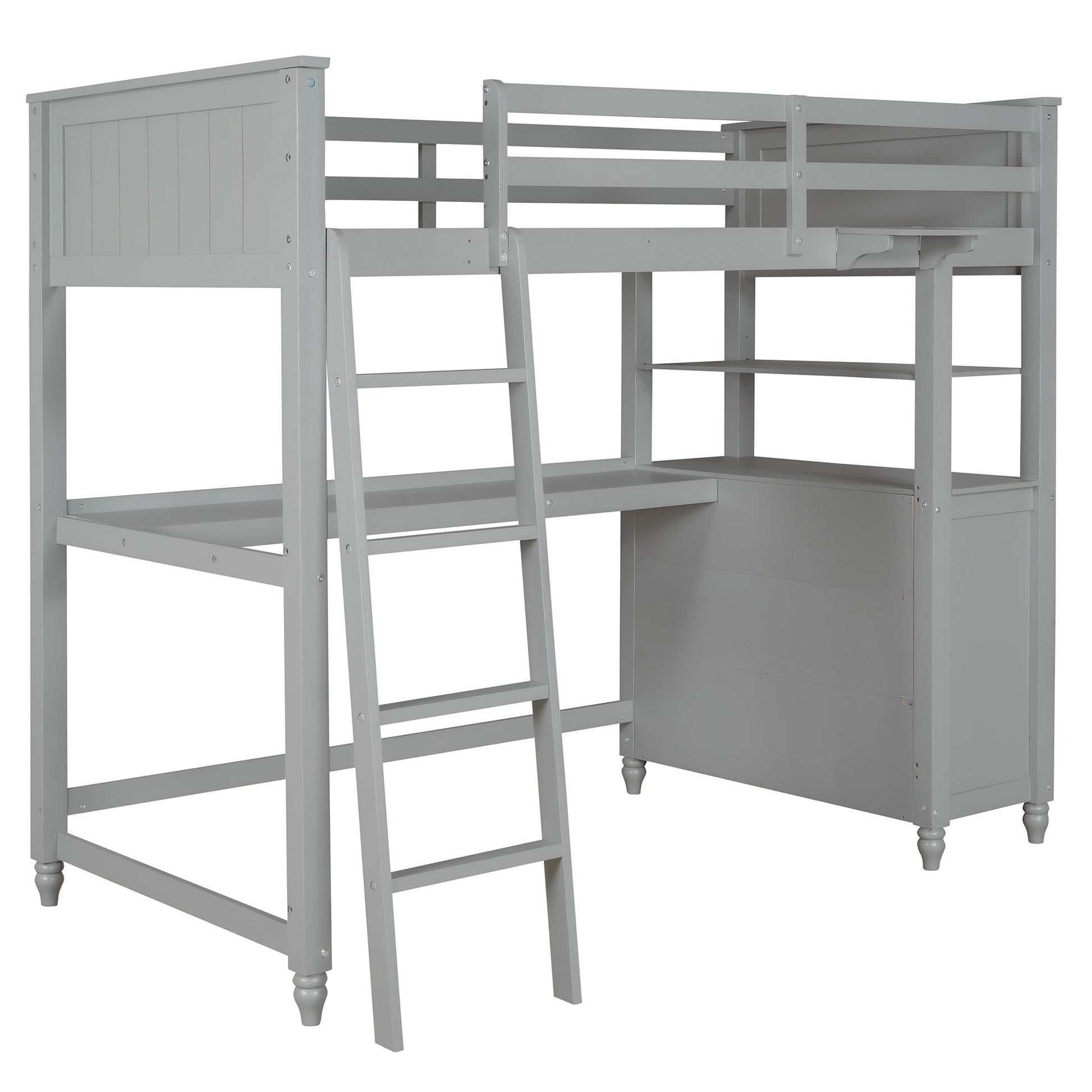 Twin Size Loft Bed With Drawers And Desk, With Shelves - Gray