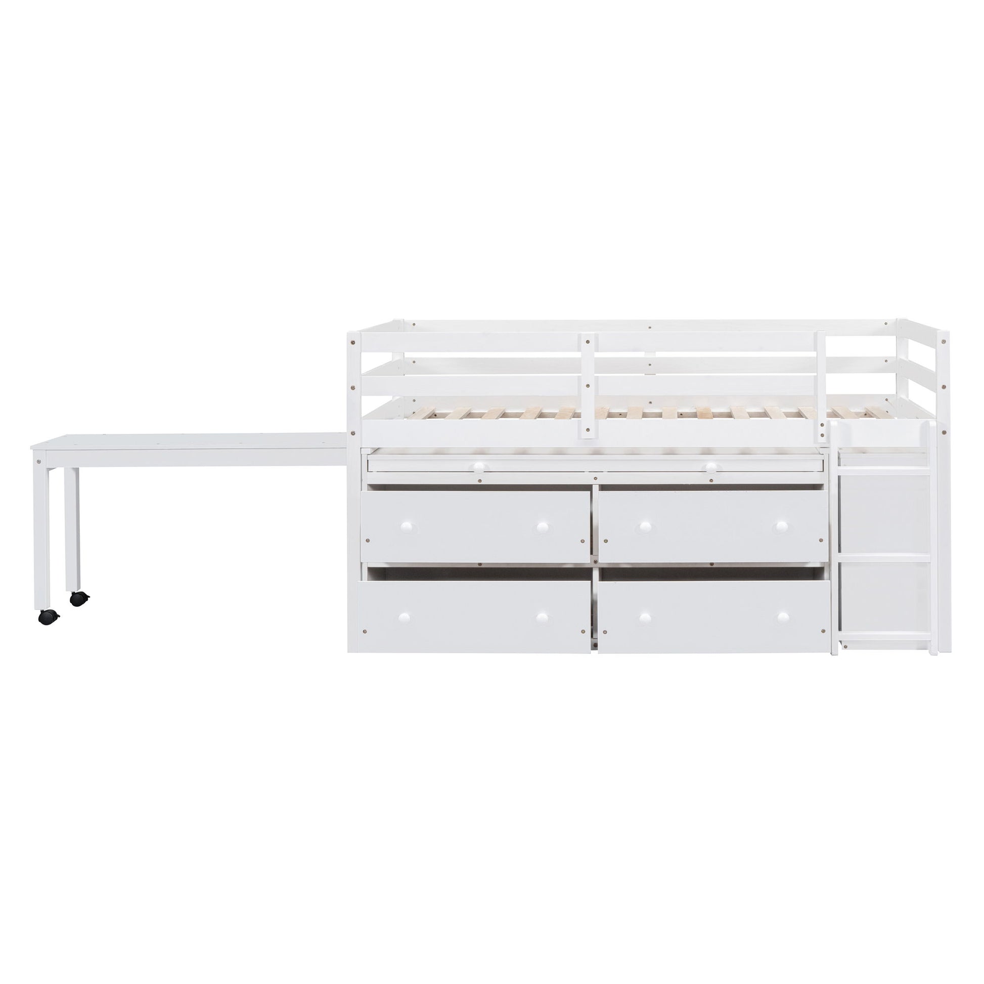 Twin Size Loft Bed With Retractable Writing Desk And 4 Drawers, With Lateral Portable Desk And Shelves - White