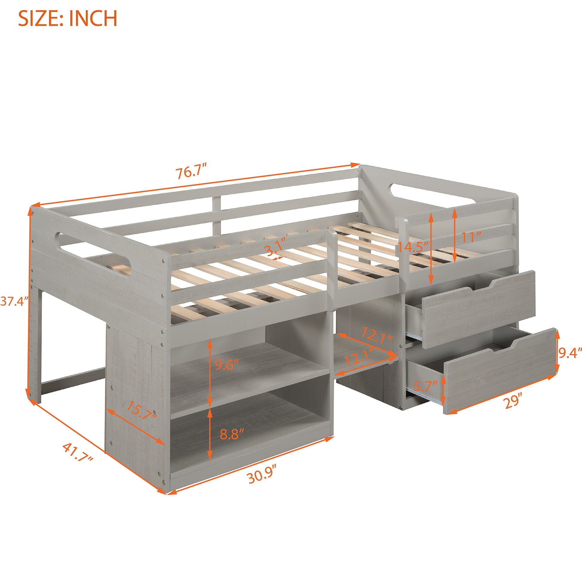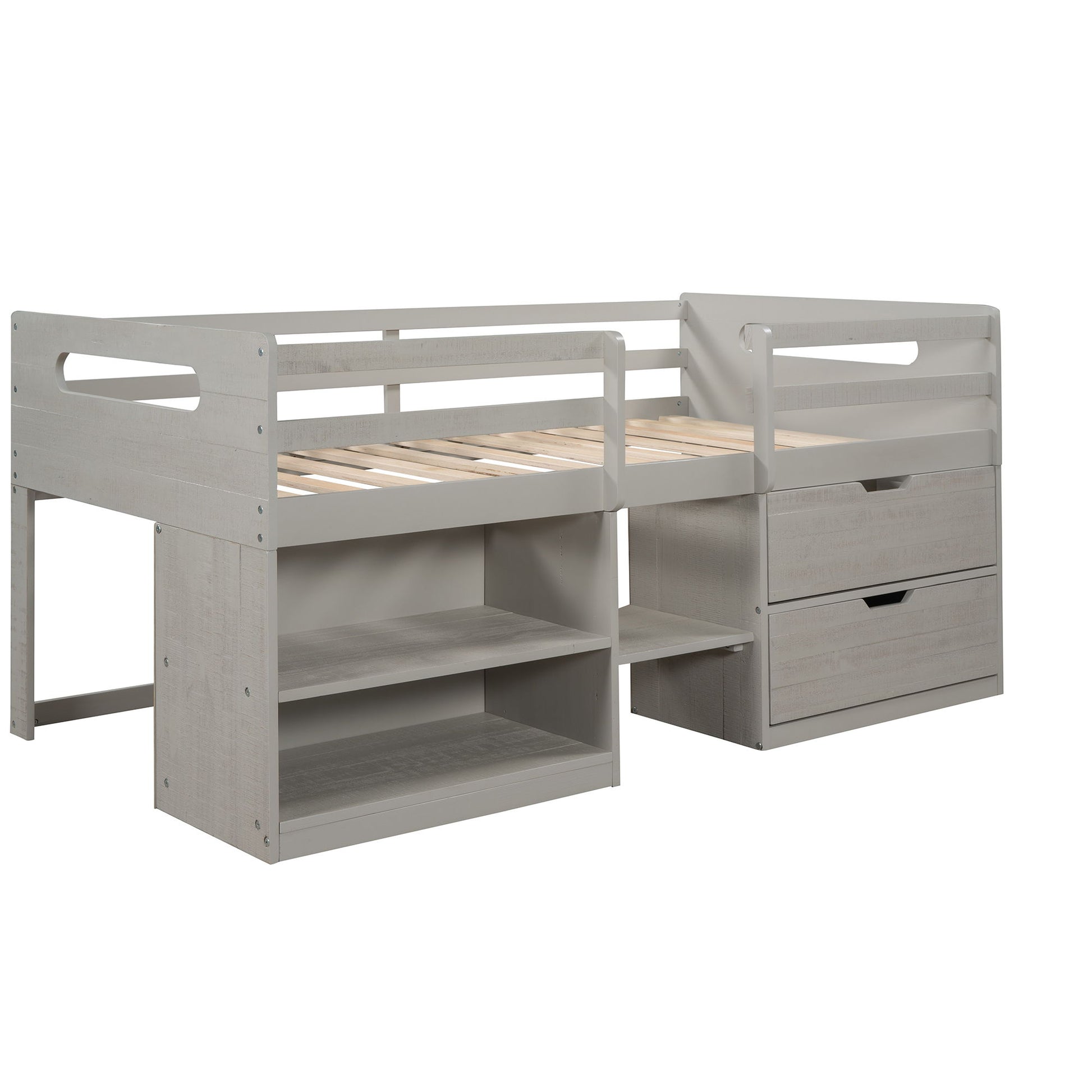 Twin Size Loft Bed With Two Shelves And Two Drawers - Antique Gray