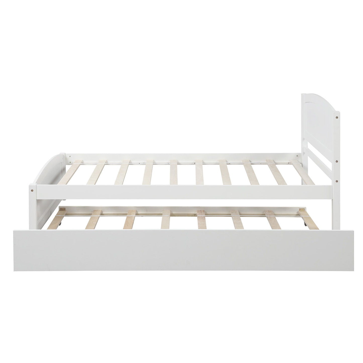 This Wood Platform Bed with Trundle is a minimalistic, stylish bed frame that works well with a variety of decorating styles and makes it easy for you to enhance and improve your space. Featuring strong, solid pine wood and ten supporting slats, this bed is built to last, ensuring it will accompany you for many years. The beautiful white finish lends an elegant look makes this bed frame an excellent addition to any bedroom, do not miss the chance take it home today.