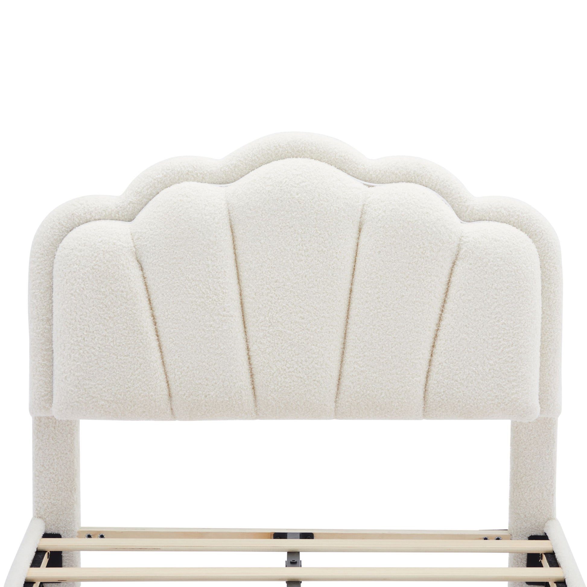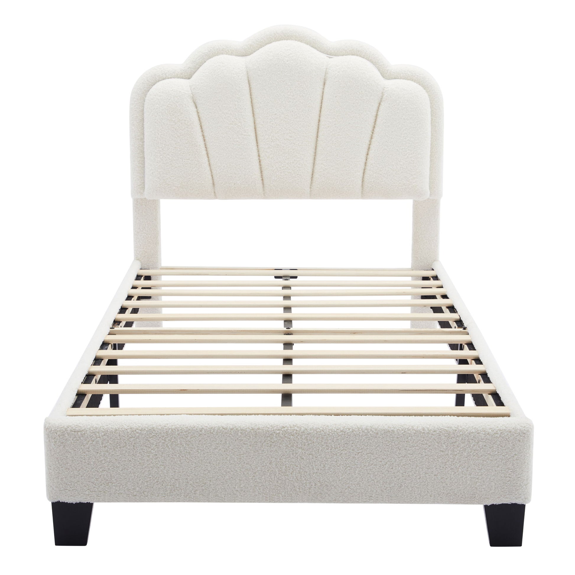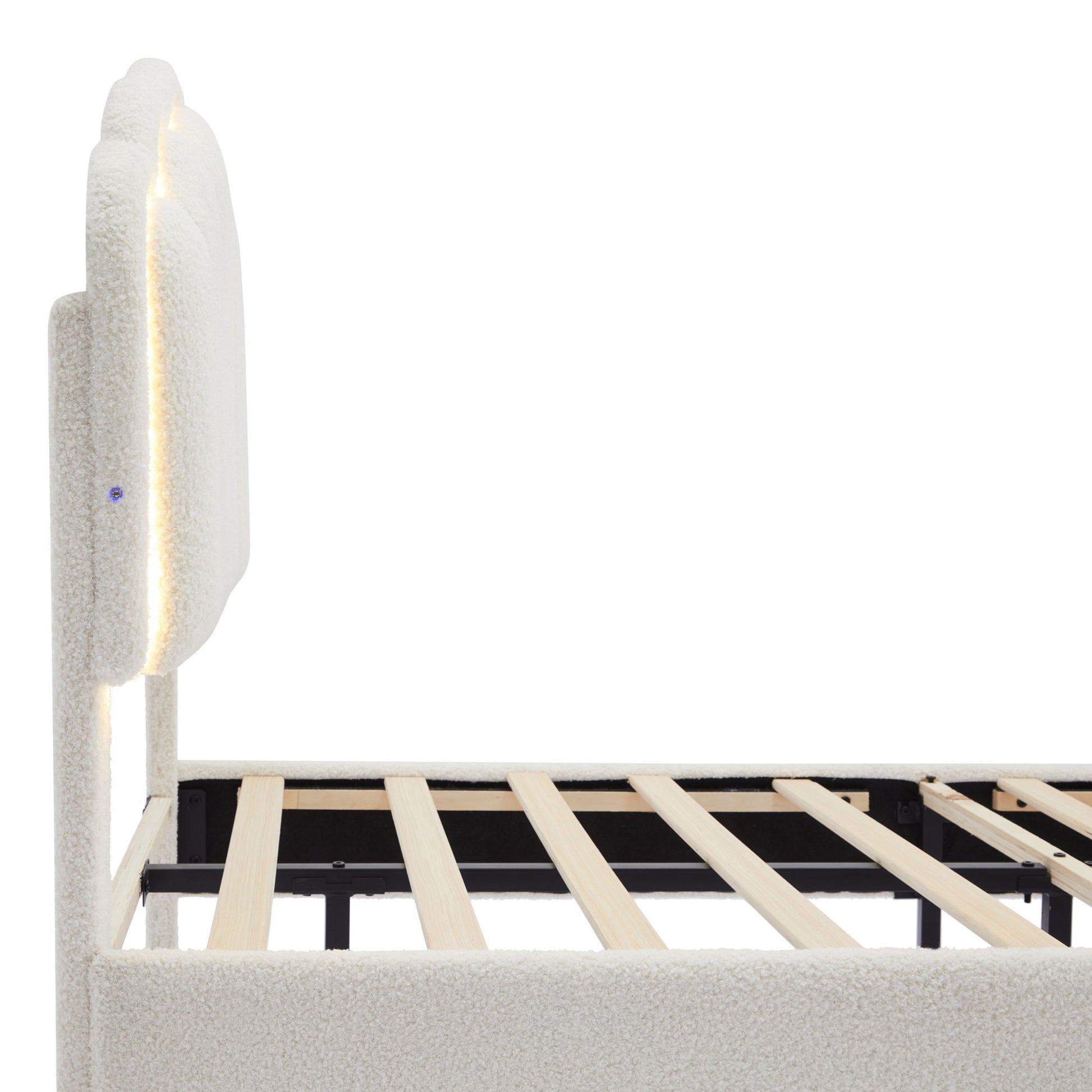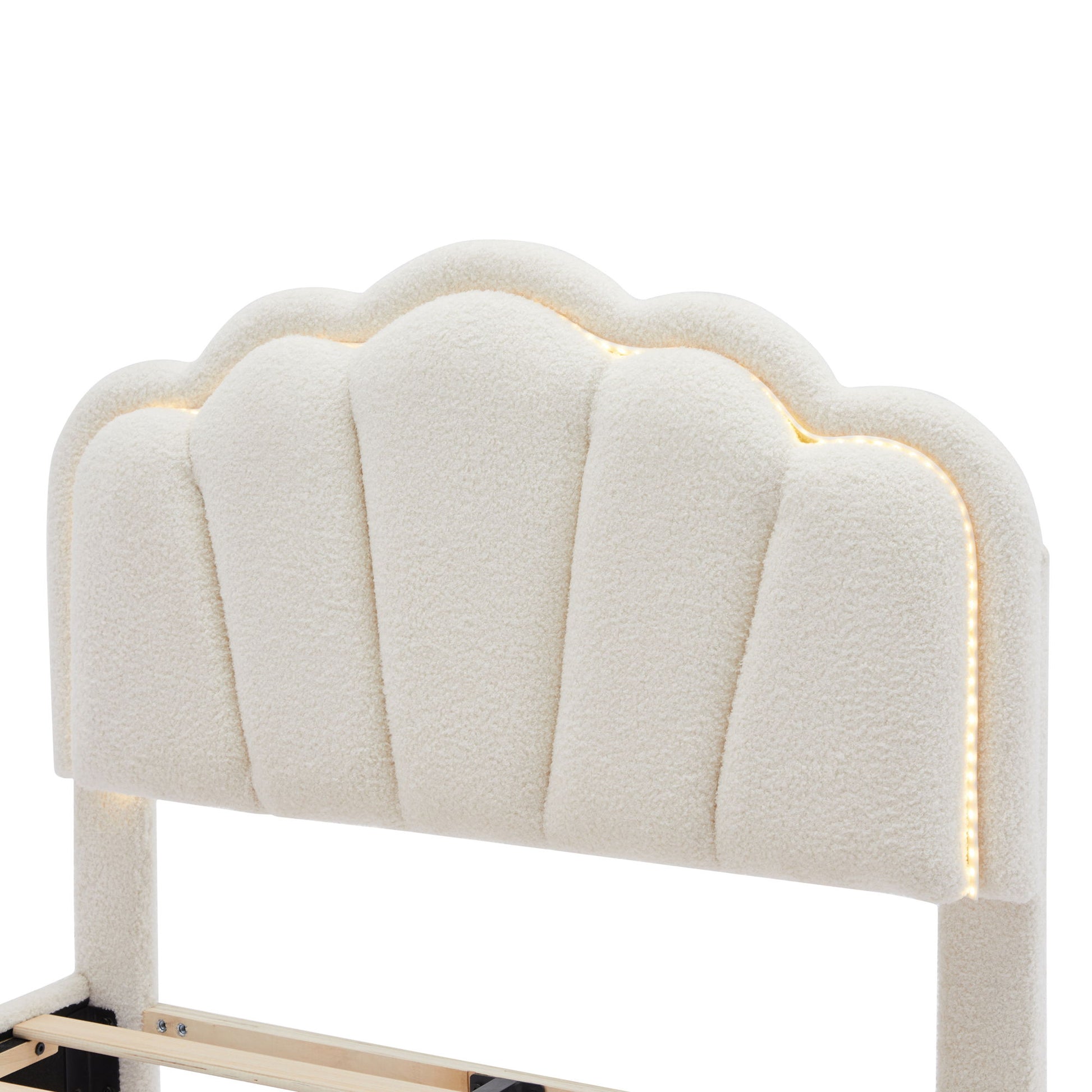 Twin Size Upholstered Flower-Shape Bed, Elegant Flowers Headboard With LED Light Strip, Sherpa Fabric Platform Bed With Slats Support - White