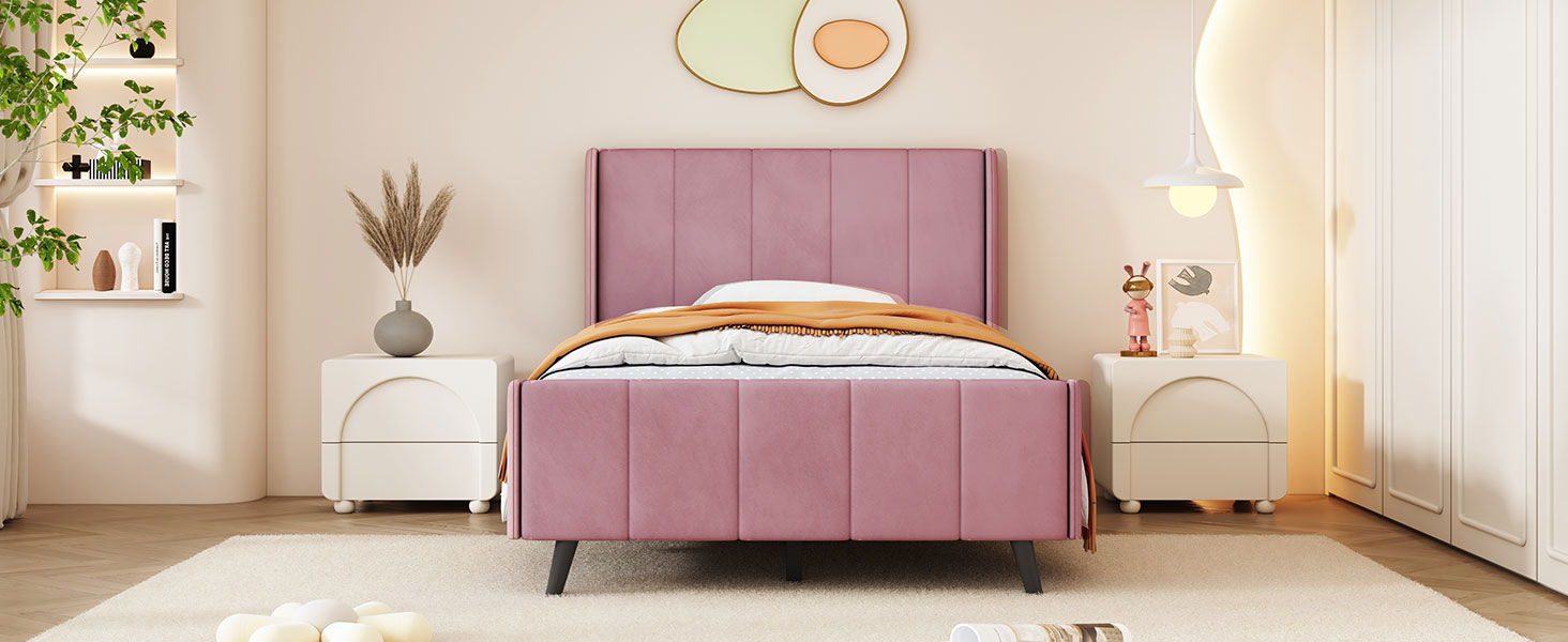 Upholstered in foam-filled velvet for an inviting feel, the included headboard boasts tufted detailing that adds a touch of visual texture. It gives any room a spark of style that's both modern and timeless. The supporting legs feature a fun design that enhances the overall layout of the room. The footboard is perfect for hanging clothes, thanks to its three-dimensional shape. This platform bed is hollow underneath, maximizing vertical space for storage. You can place games or puzzles under the bed.