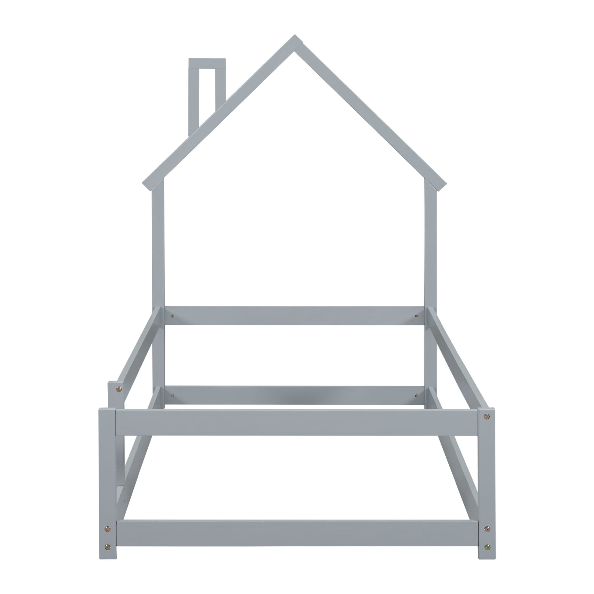 Twin Size Wood Bed With House-Shaped Headboard Floor Bed With Fences - Gray