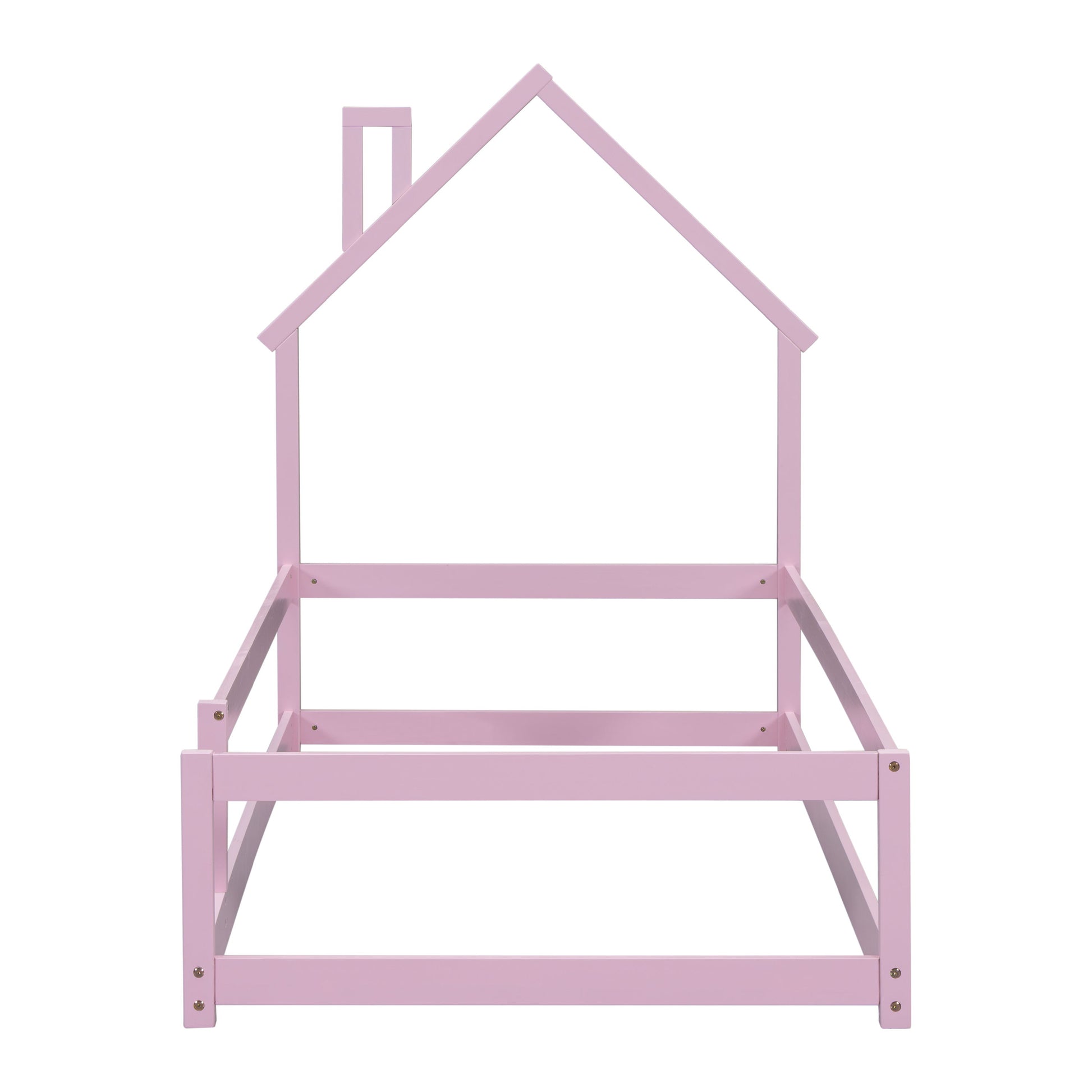 Twin Size Wood Bed With House-Shaped Headboard Floor Bed With Fences - Pink